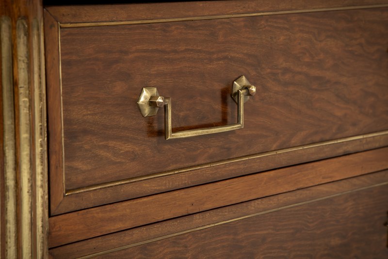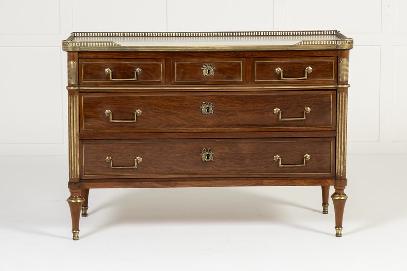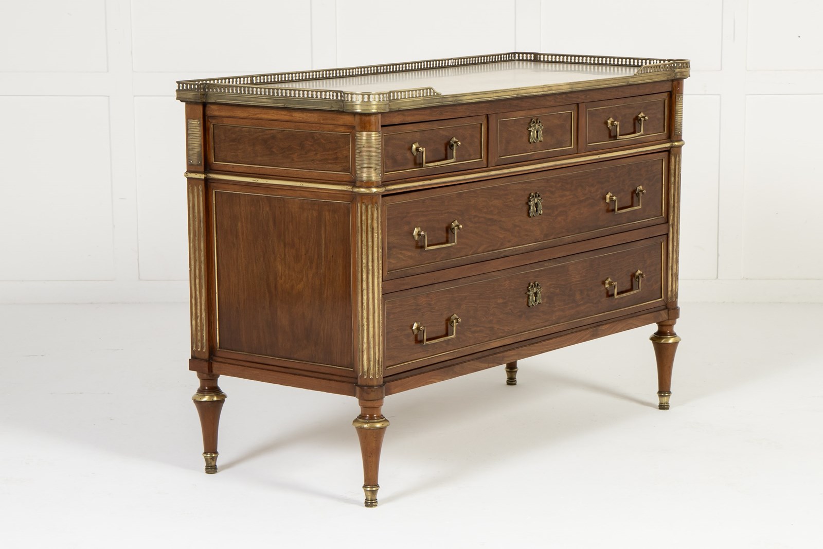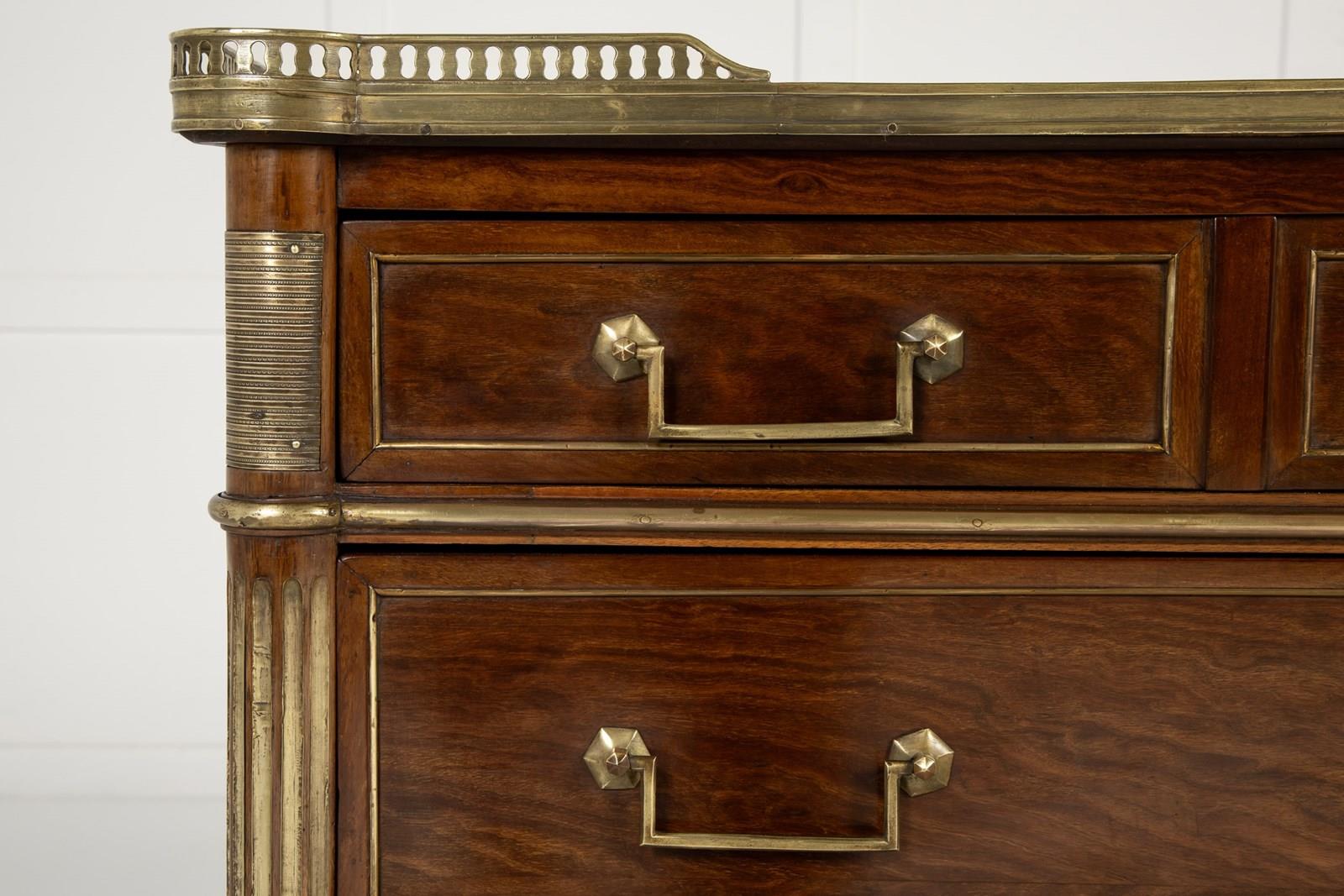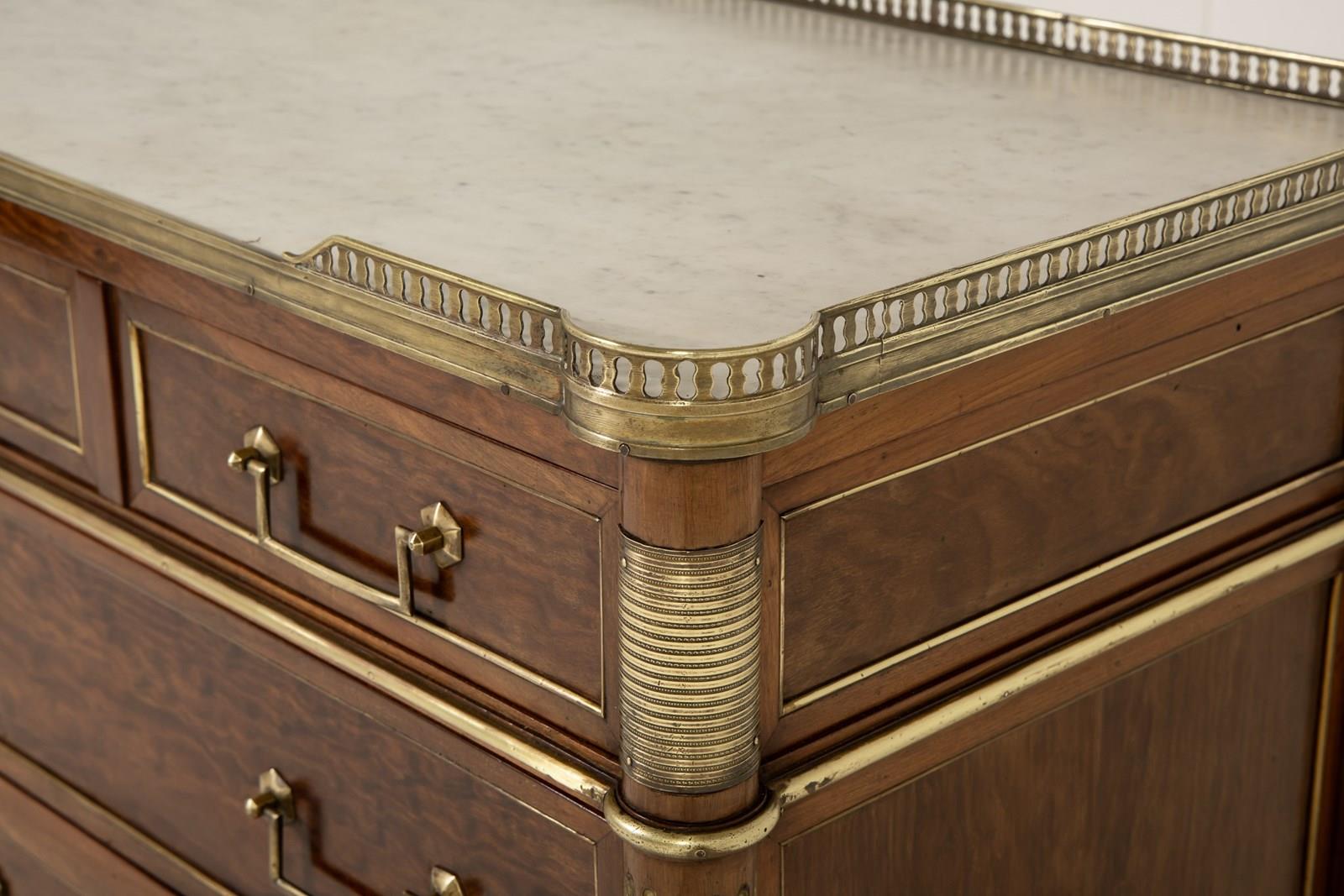 The top has a fretted gallery above a slab of inset white marble. The outset column pilasters to the sides lead down to toupie feet with various ormolu mounts throughout. The figured mahogany is of plum pudding type with attractive figuring. The panelled sides have additional ormolu mounts and the drawers have drop bar handles and ribbon tie escutcheon plates.