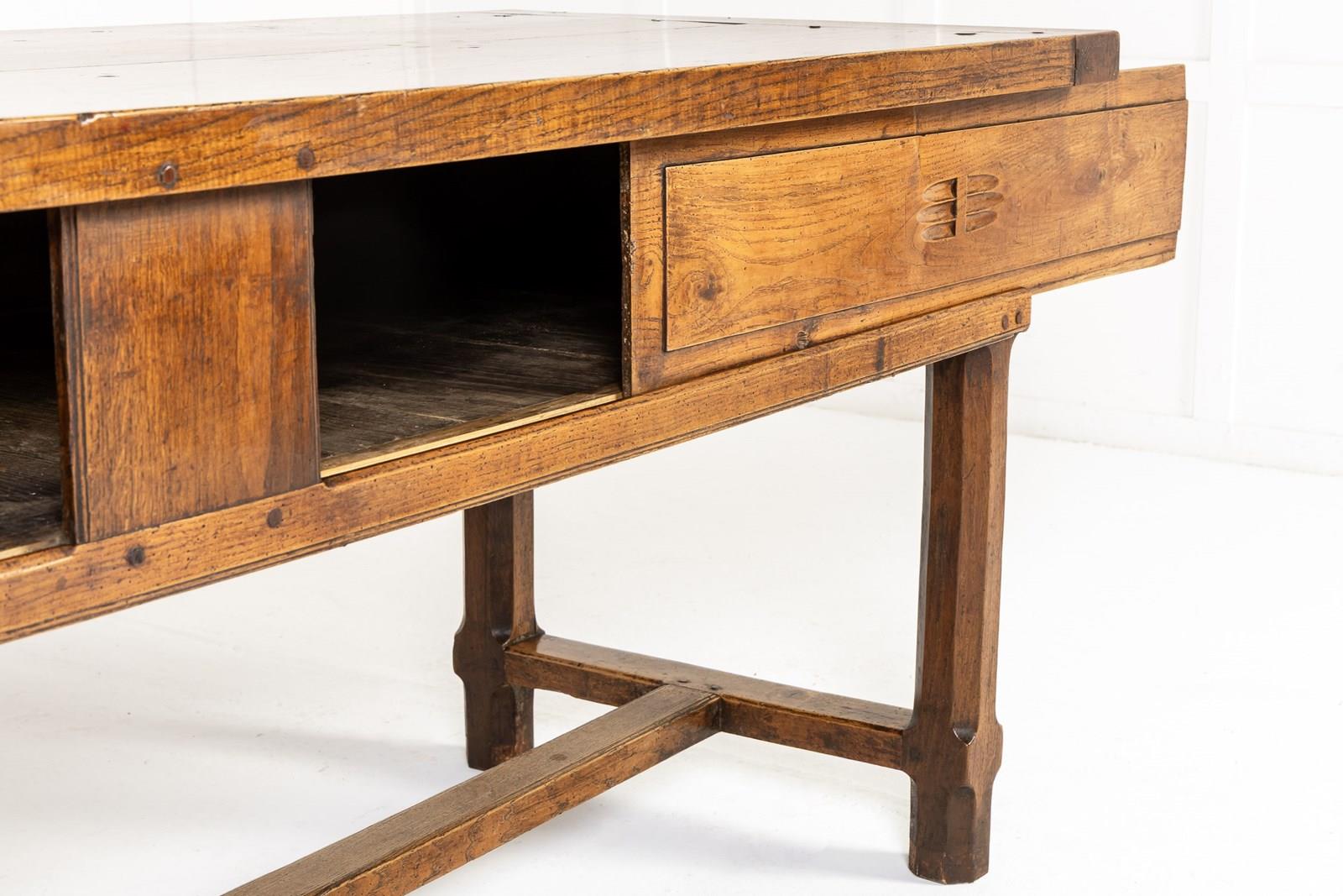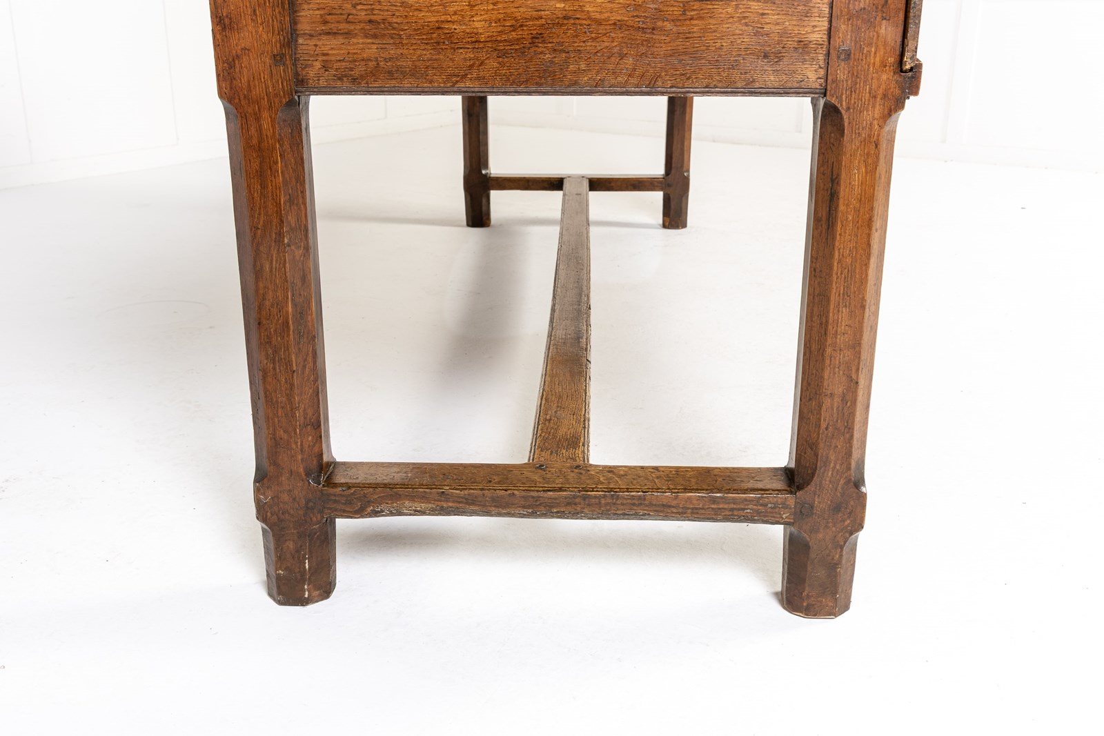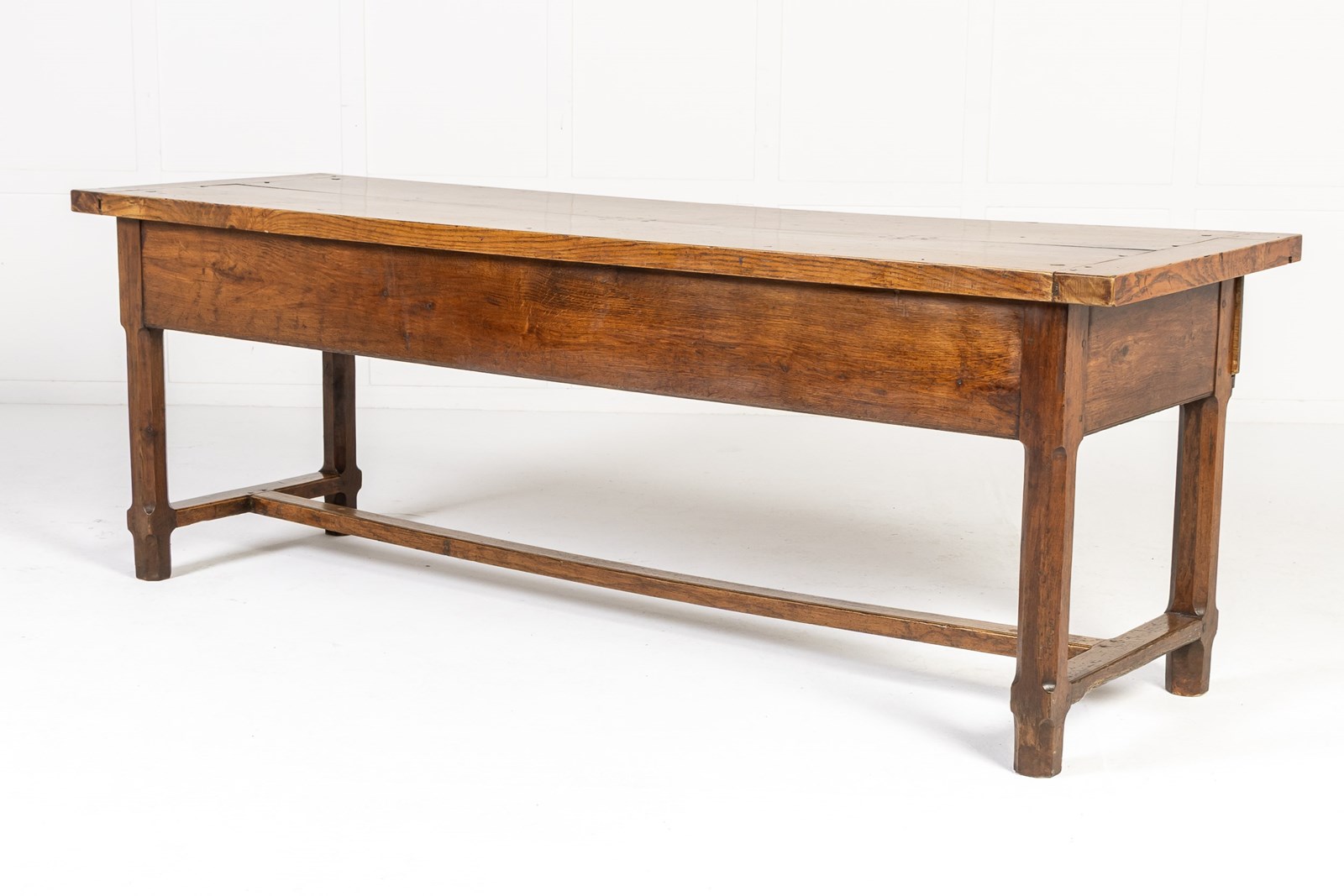The table is of rectangular form with an H-stretcher and a two-plank top with cleated ends. Having two unusual drawer compartments, with sliding fronts to open them. The table is of pegged construction with chamfered legs and made from good timber of great colour and patination.
