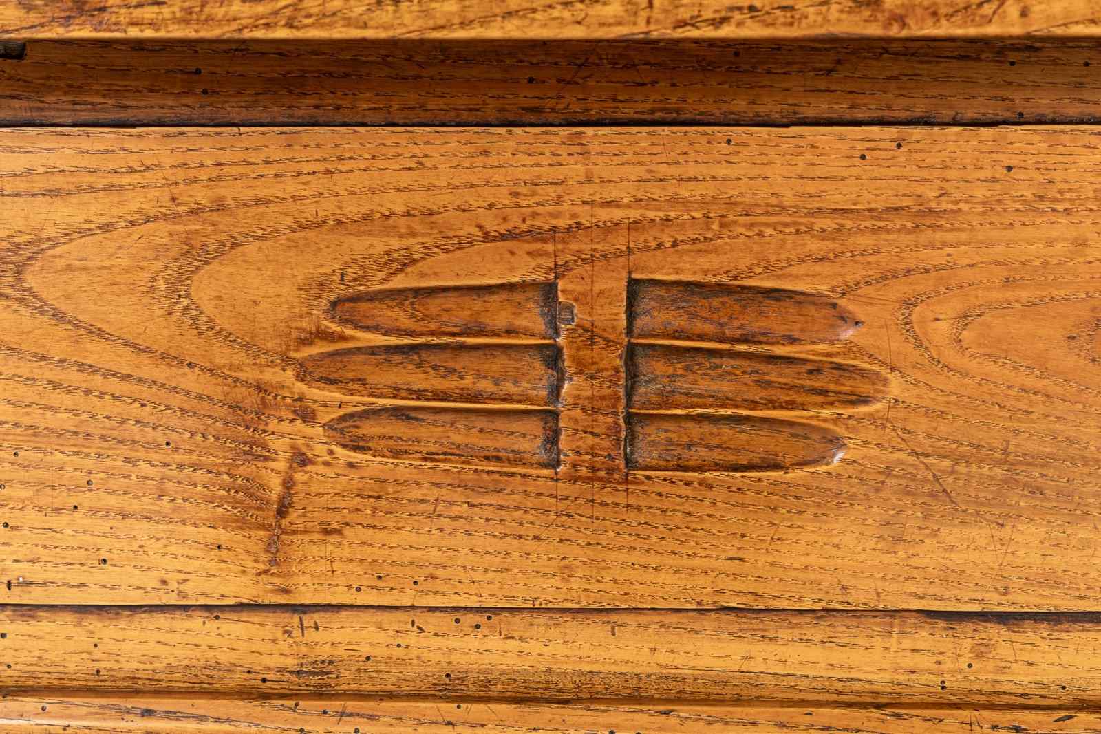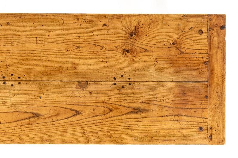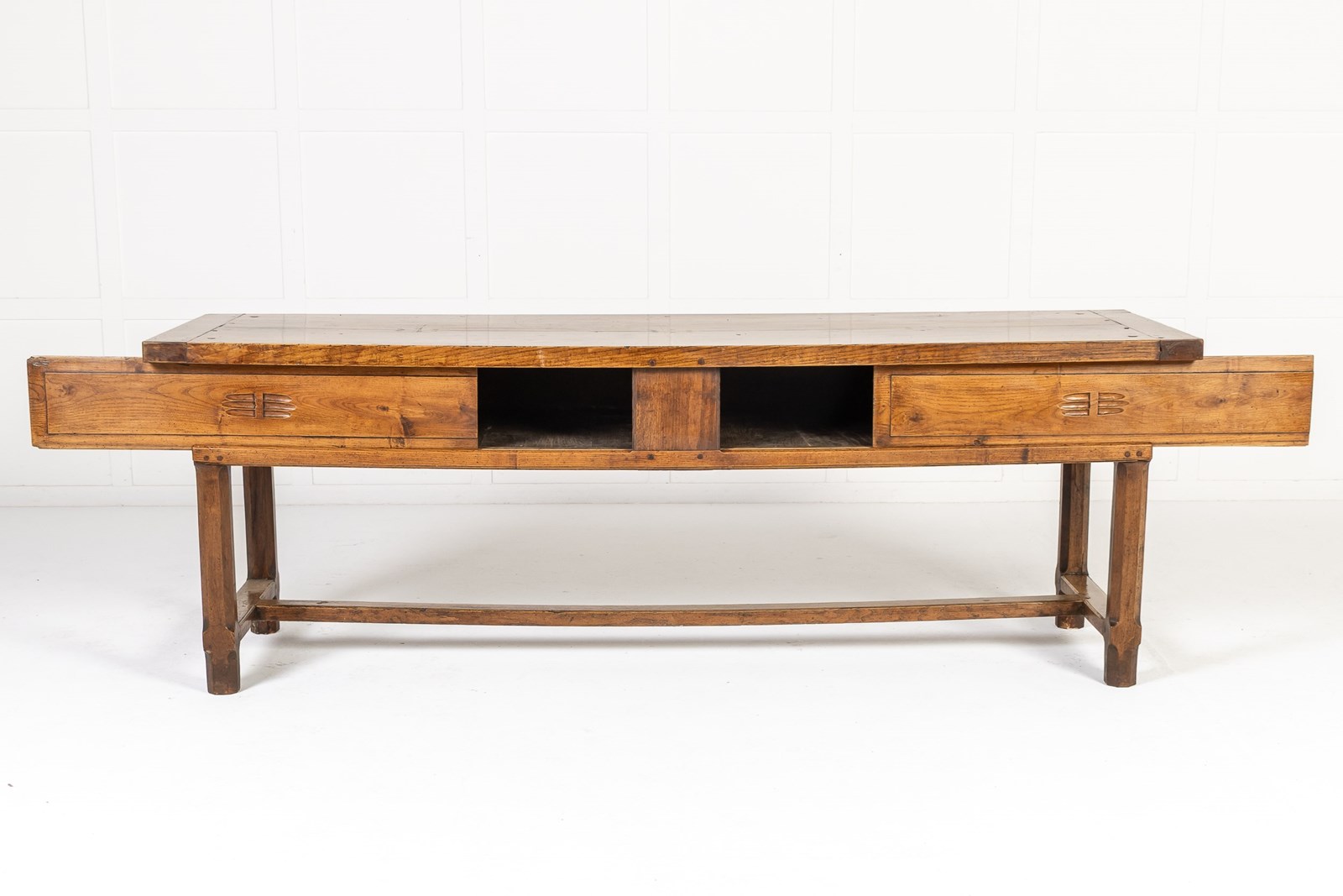 The table is of rectangular form with an H-stretcher and a two-plank top with cleated ends. Having two unusual drawer compartments, with sliding fronts to open them. The table is of pegged construction with chamfered legs and made from good timber of great colour and patination.