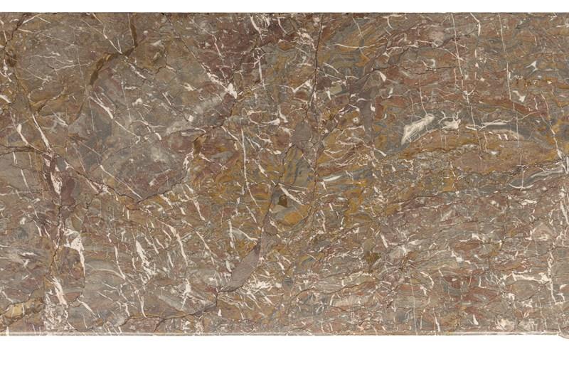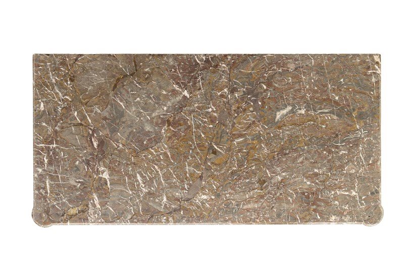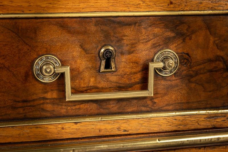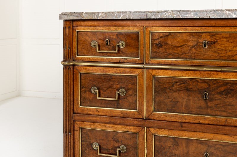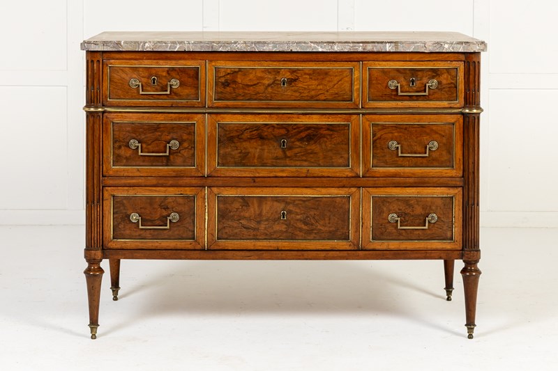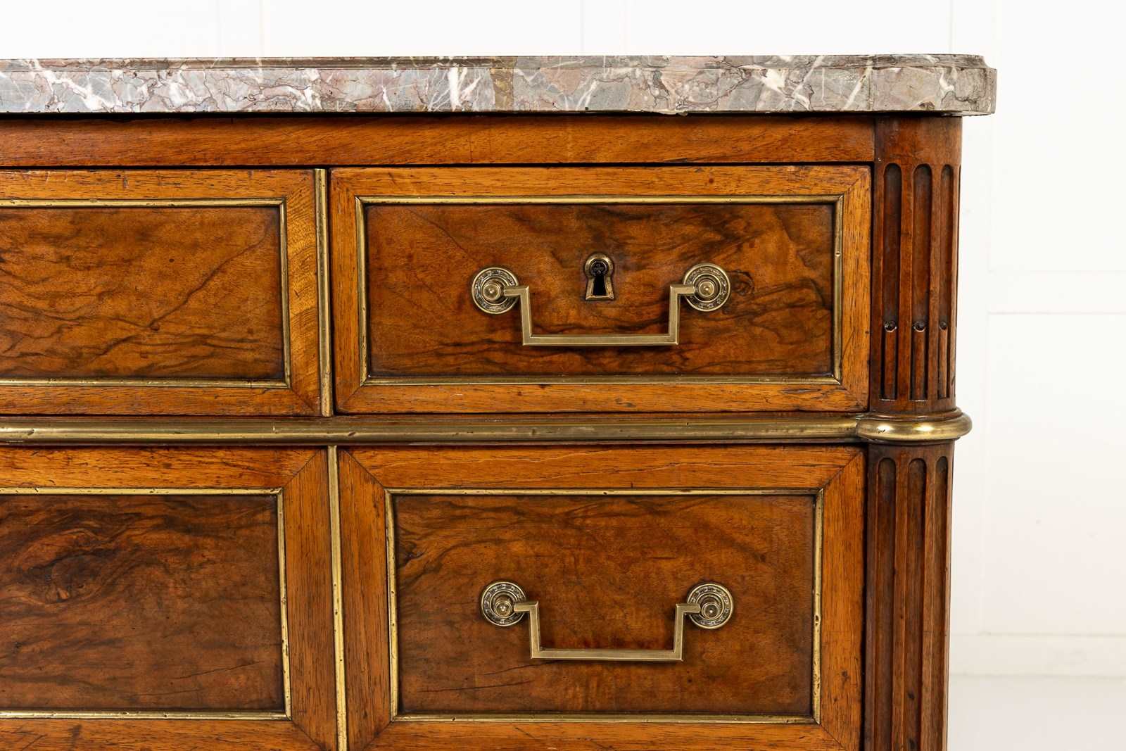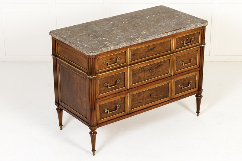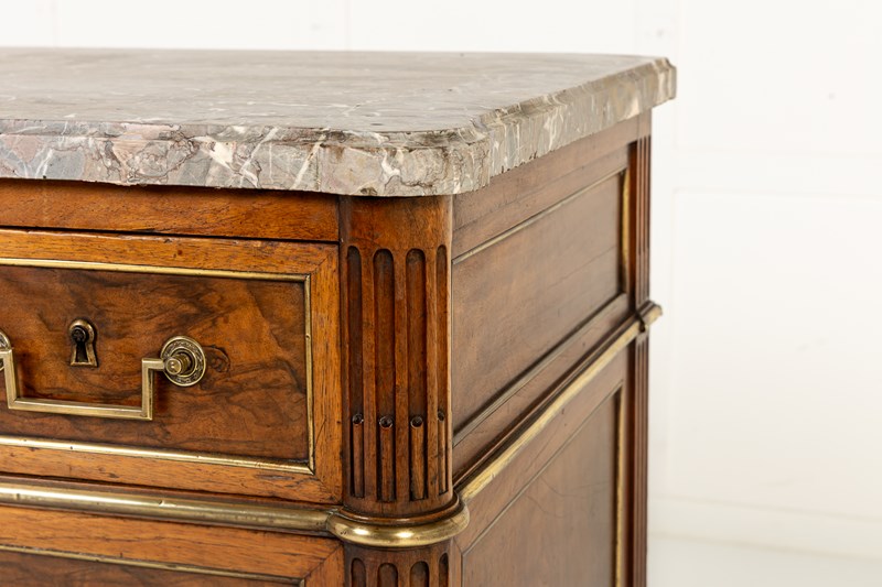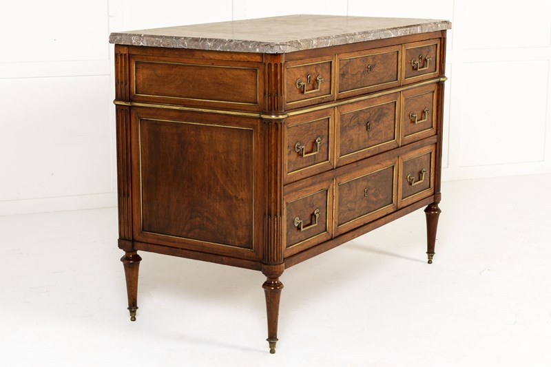 Made in the Louis XVI period, this fine piece of French walnut furniture, is highlighted by ormolu drawer mounts and original drop bar handles. The rounded pilasters to the sides of the drawers are stop-fluted. The sides are panelled and mounted with further ormolu. Standing on long, tapering toupee feet with ormolu toes. The original marble top has tones of red, yellow and white on a grey background, and conforms to the shape below, with an edge moulding around the sides and front. The commode retains its original key with interesting quatrefoil-shaped post.