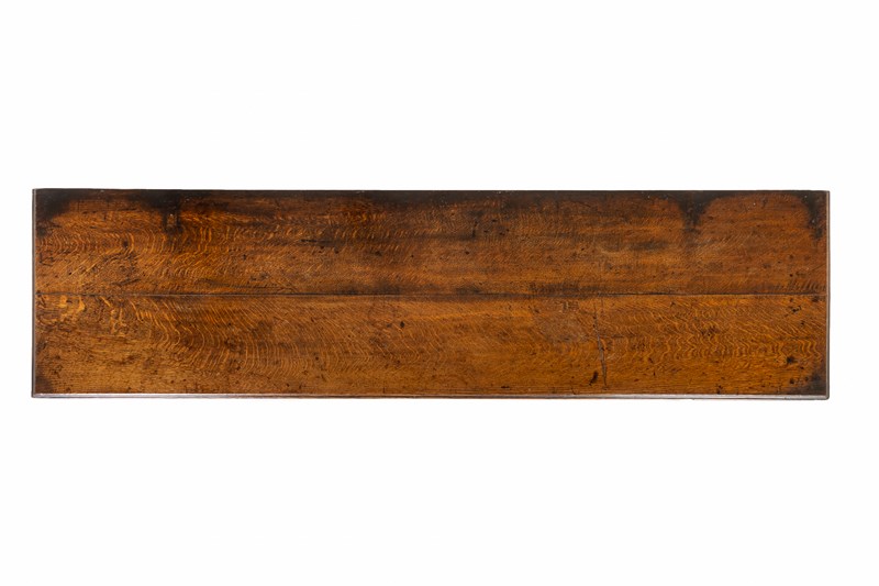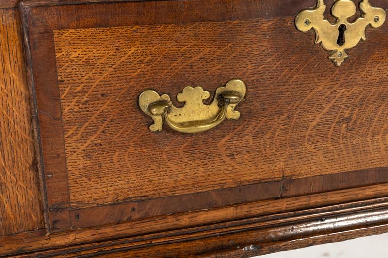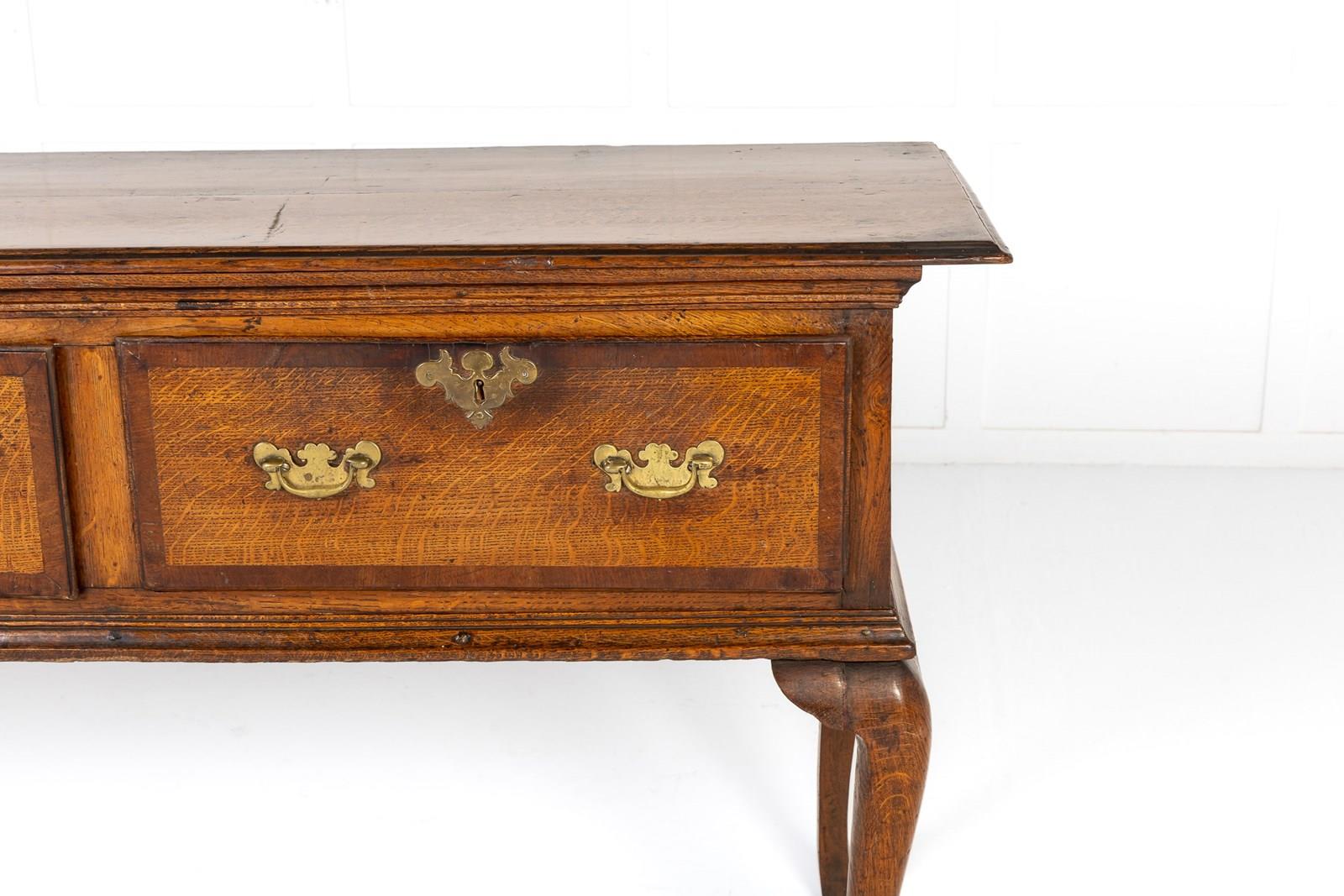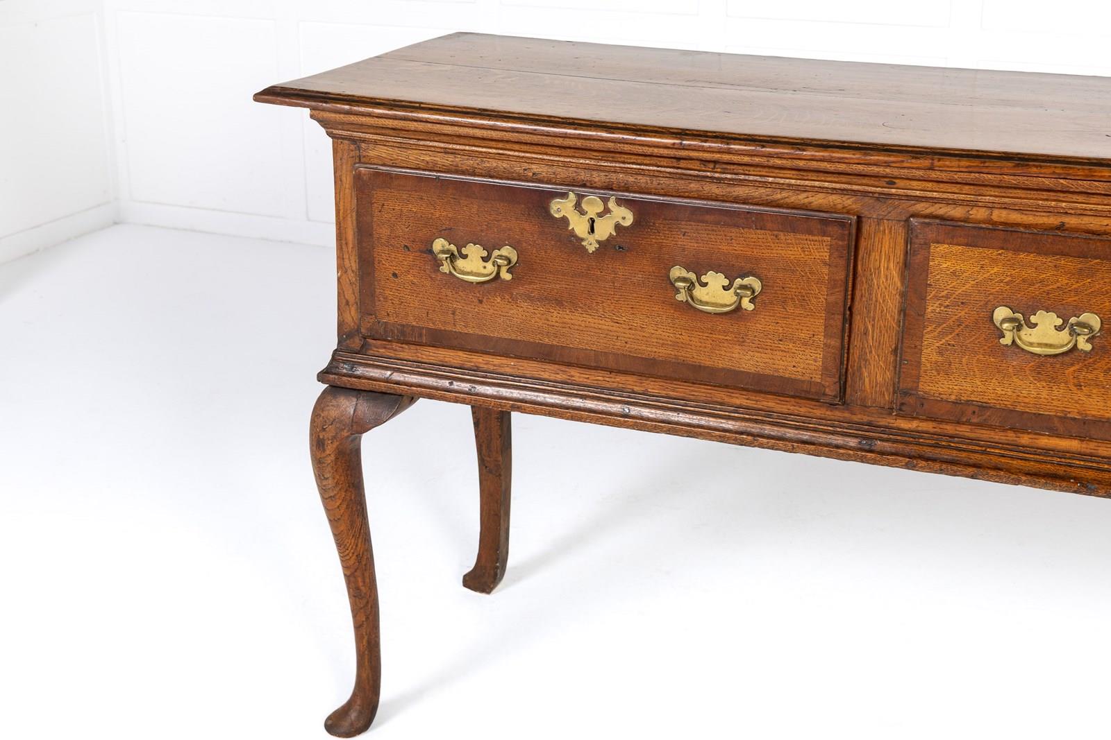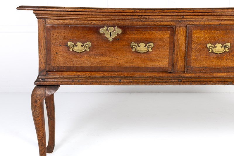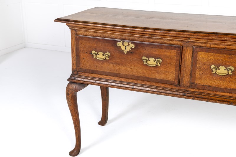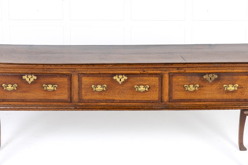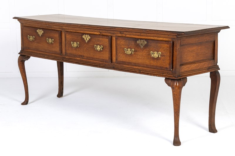 Of large scale with three deep drawers which have large gilt brass handles and escutcheons. The oak is of particularly nice colour and great figure. The overhanging top has two planks and multiple mouldings below. Standing on four cabriole legs. There is great colour and patination throughout and the dresser stands very well.