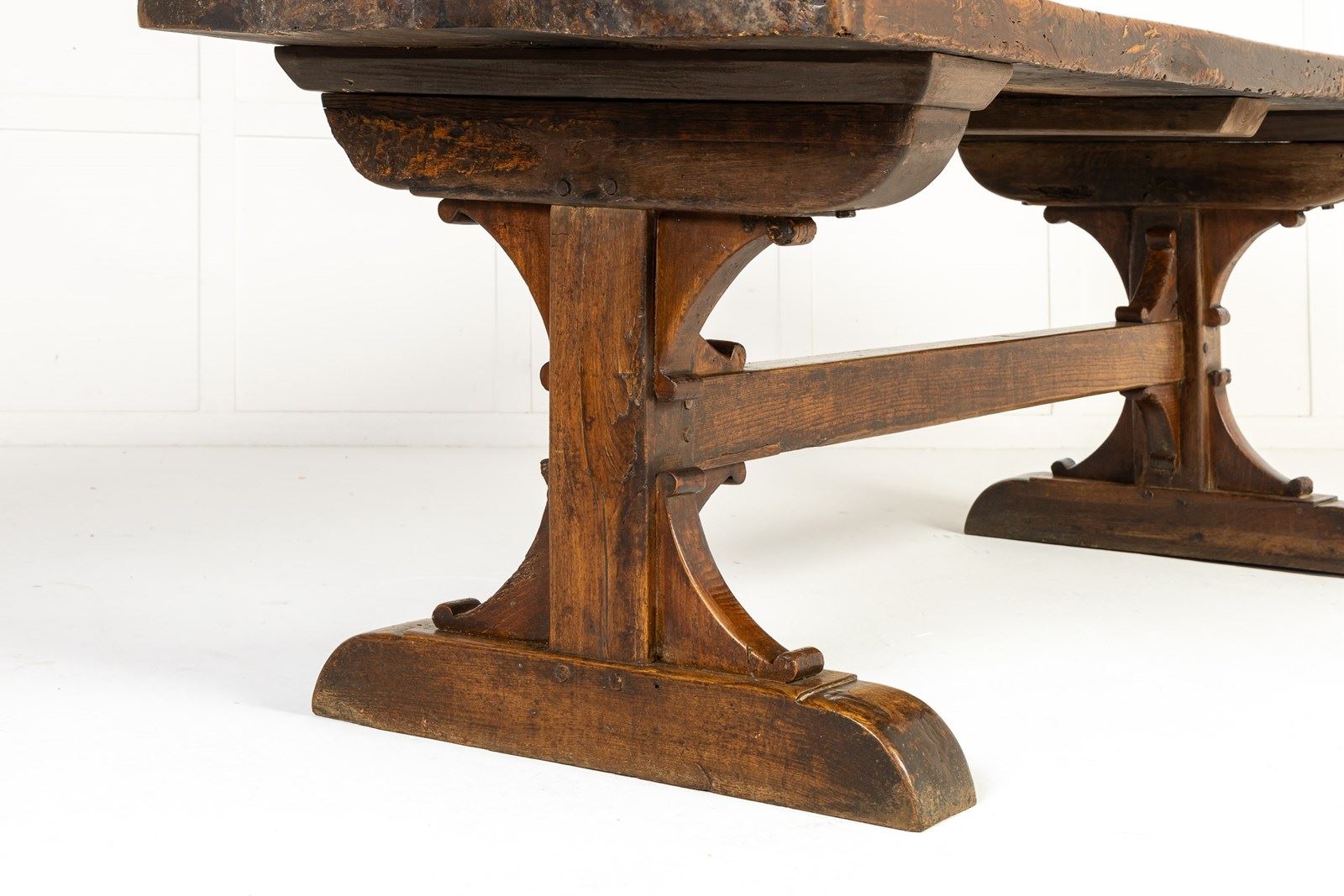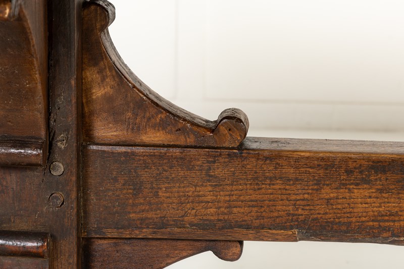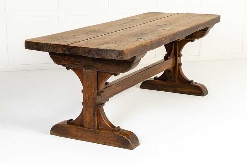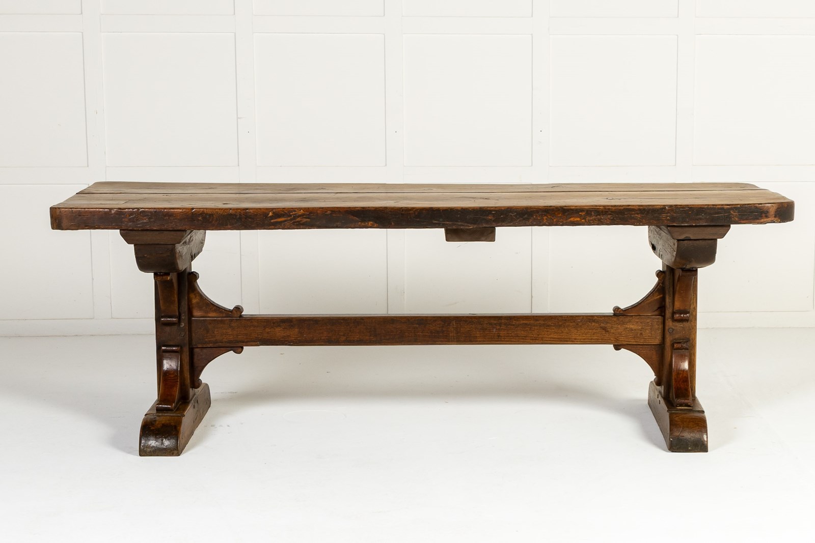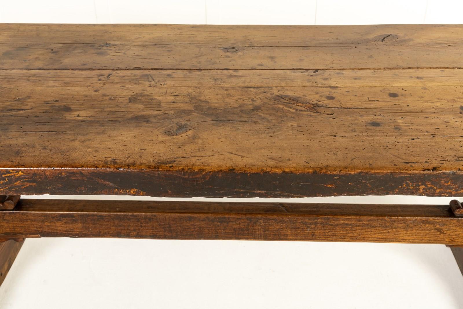 This large table has a planked top and is constructed from a combination of oak and beech, pegged together in the traditional manner. The top is particularly thick and sturdy and has attained a fine patination through years of use. The table stands on two end supports with a central stretcher with added decorative brackets. This form of refectory table, was originally used in the dining quarters of monasteries and other religious institutions.