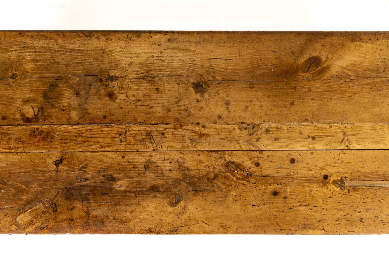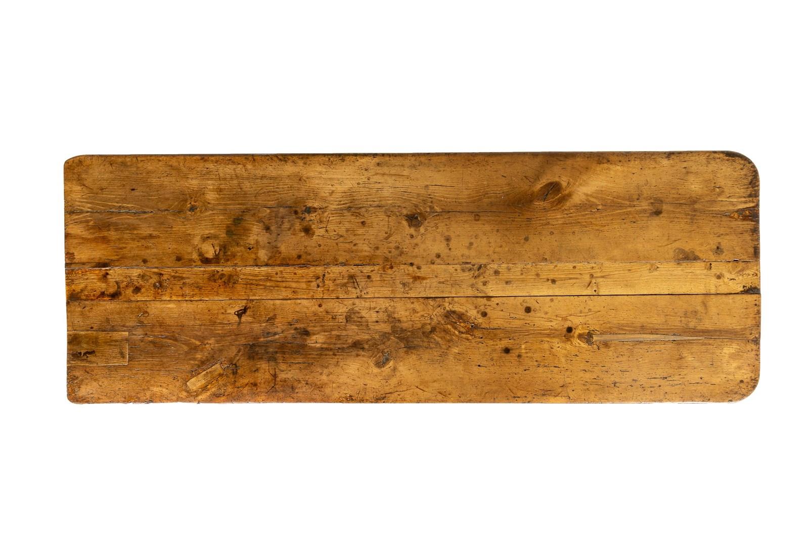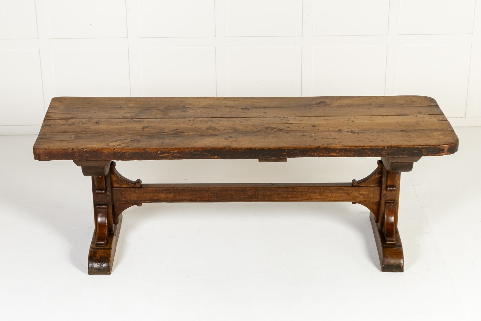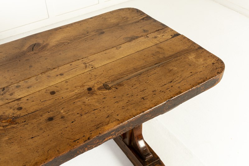 This large table has a planked top and is constructed from a combination of oak and beech, pegged together in the traditional manner. The top is particularly thick and sturdy and has attained a fine patination through years of use. The table stands on two end supports with a central stretcher with added decorative brackets. This form of refectory table, was originally used in the dining quarters of monasteries and other religious institutions.