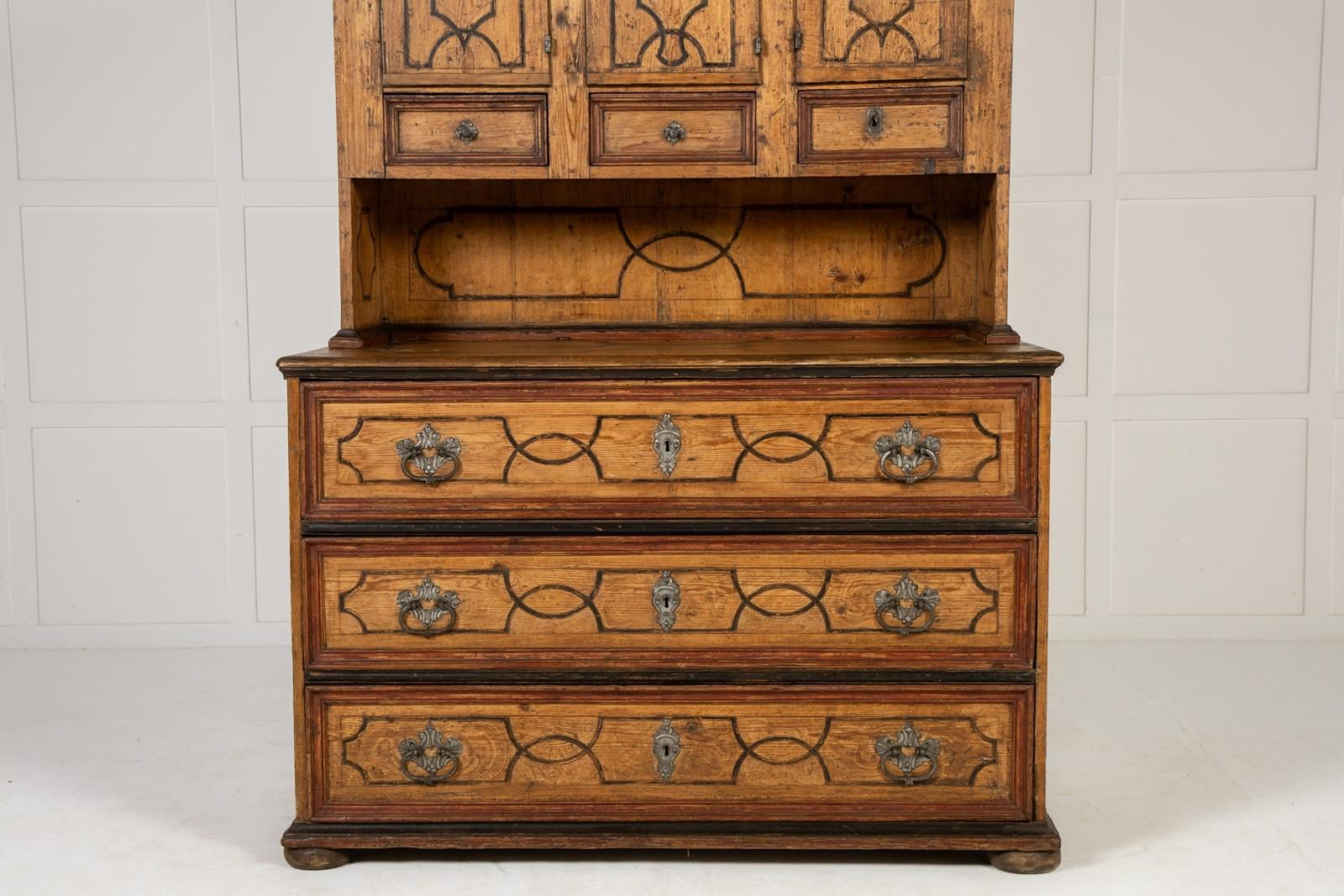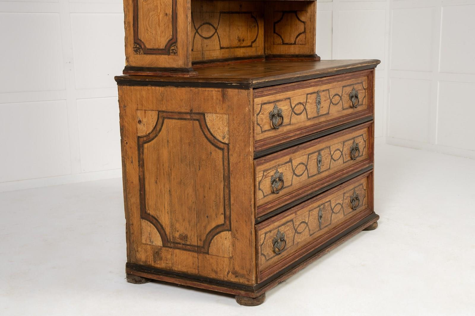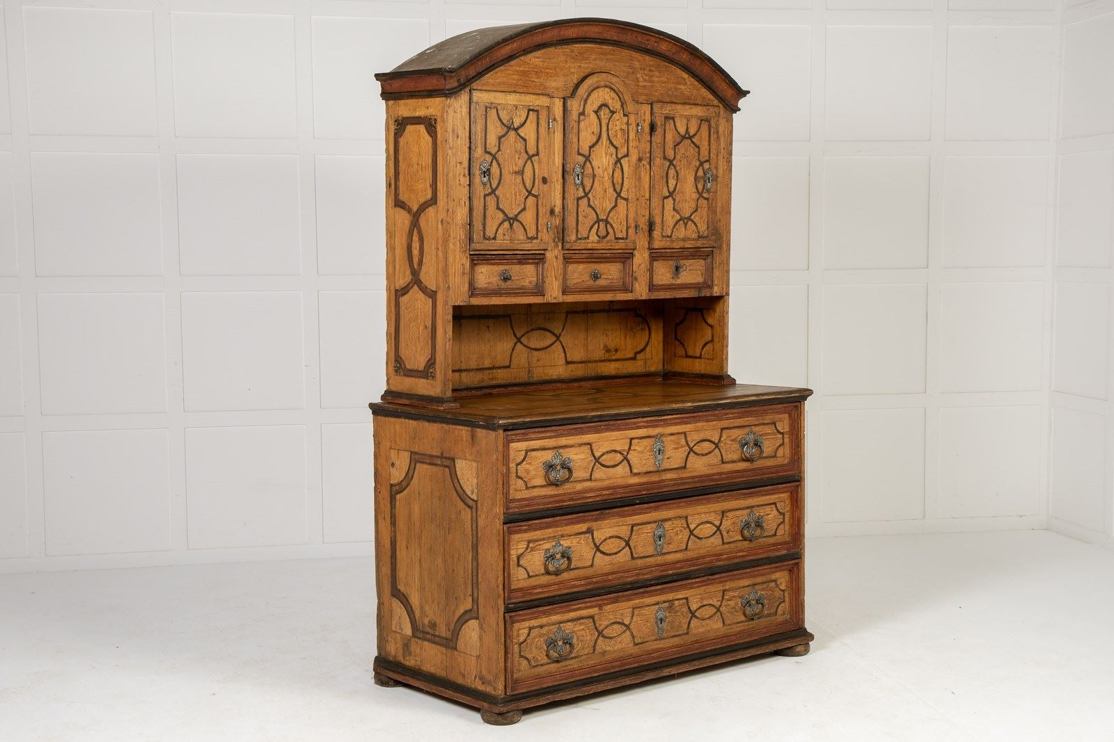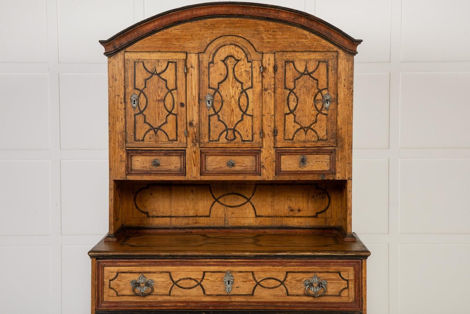 This fine domed-top cabinet is of a form associated with workshops in southern Germany and Austria. The top cupboard section has three shaped doors with three small drawers below, and then a central recessed section above three long drawers in the base. Each section of the piece has been painted throughout with geometric strapwork designs in imitation of inlay and the paintwork is both original and in excellent condition. The hardware on the piece has aspects of rococo decoration with shells and scrollwork and is of excellent quality. The sides are also painted but here the lines are thicker, suggesting panelling rather than inlay in their design. The cabinet stands on flattened bun feet.