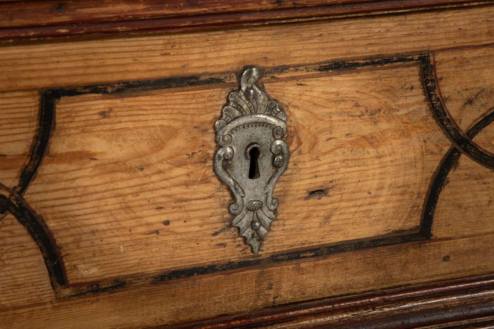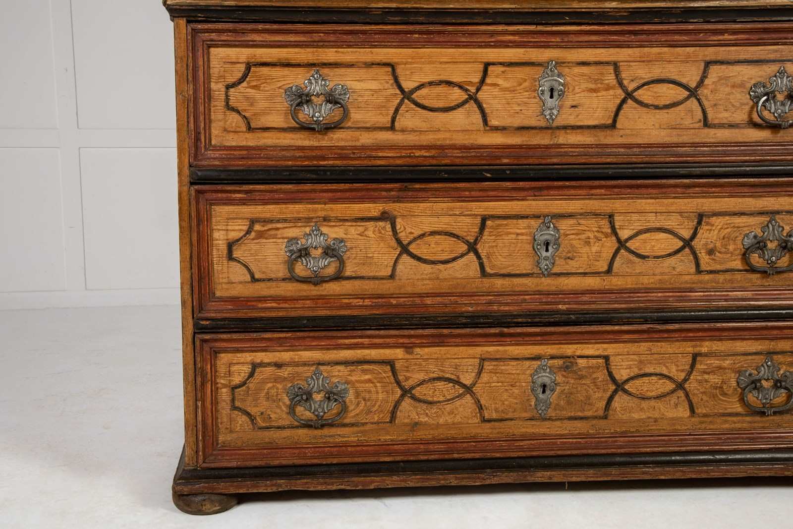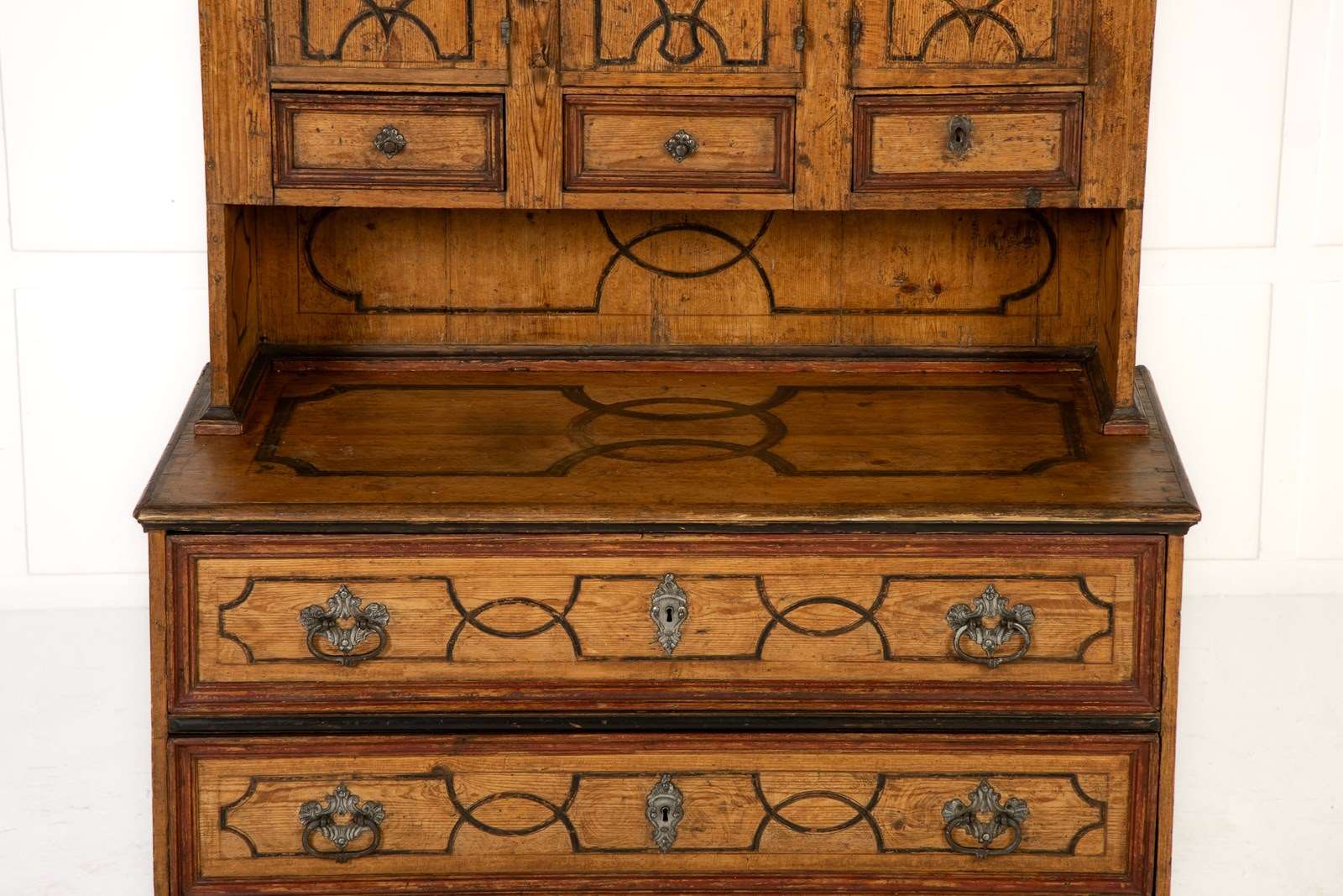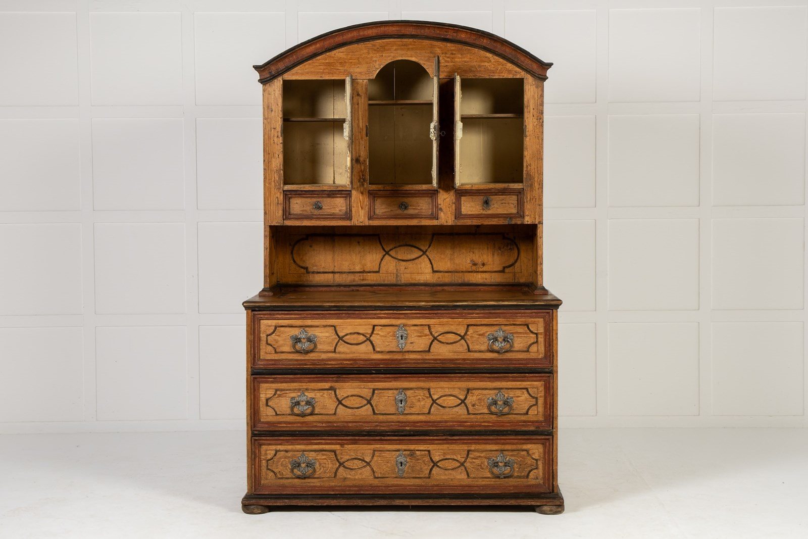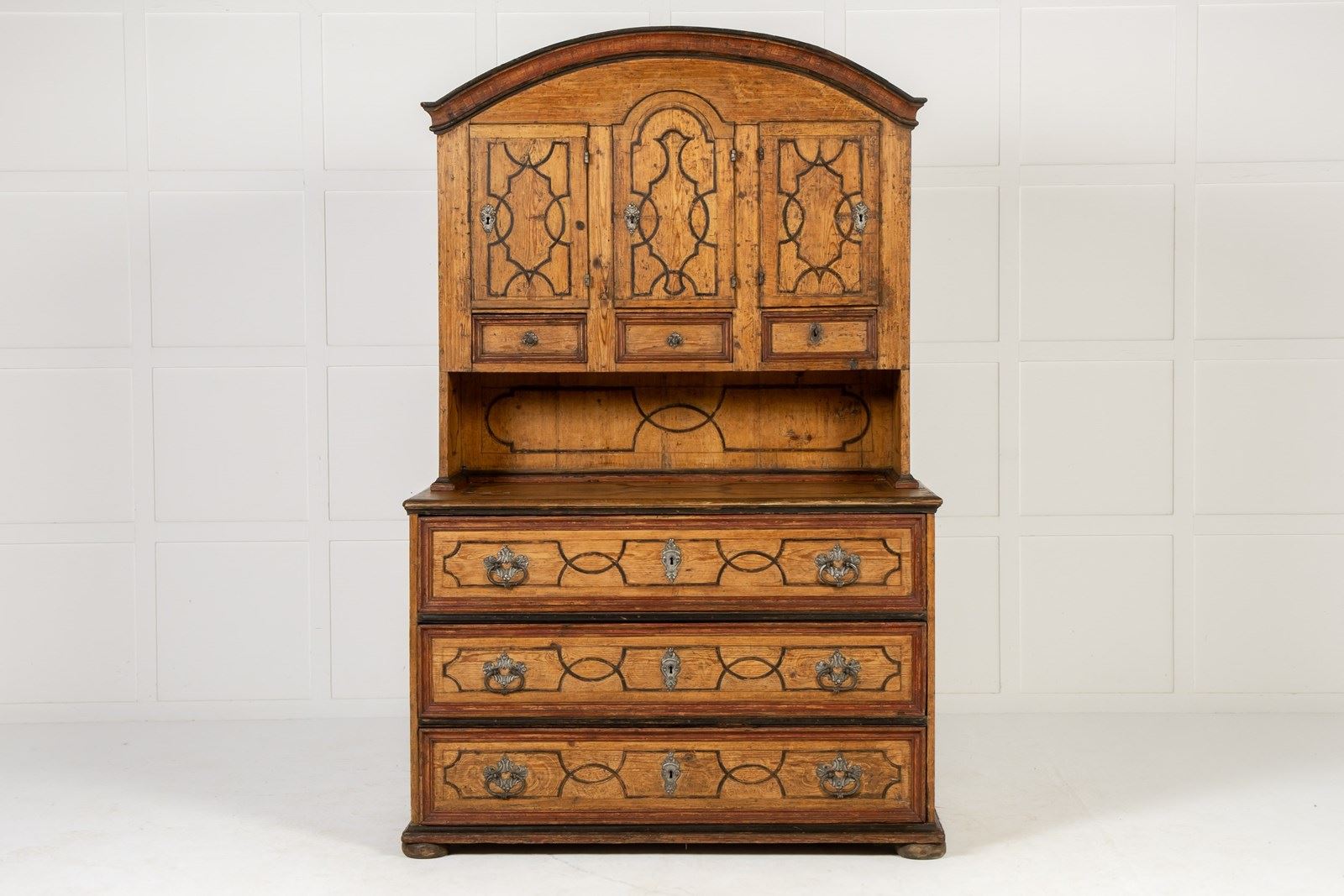 This fine domed-top cabinet is of a form associated with workshops in southern Germany and Austria. The top cupboard section has three shaped doors with three small drawers below, and then a central recessed section above three long drawers in the base. Each section of the piece has been painted throughout with geometric strapwork designs in imitation of inlay and the paintwork is both original and in excellent condition. The hardware on the piece has aspects of rococo decoration with shells and scrollwork and is of excellent quality. The sides are also painted but here the lines are thicker, suggesting panelling rather than inlay in their design. The cabinet stands on flattened bun feet.