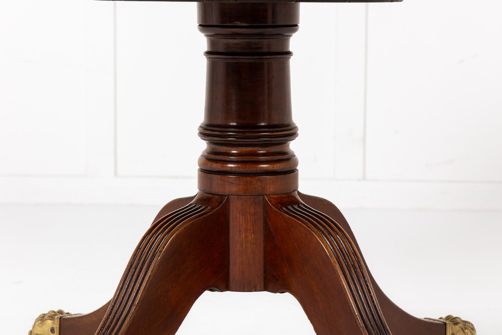 The table has a turned gun barrel-type stem and the mahogany is of excellent quality and good colour and patination. The top has a black inset leather.