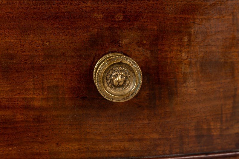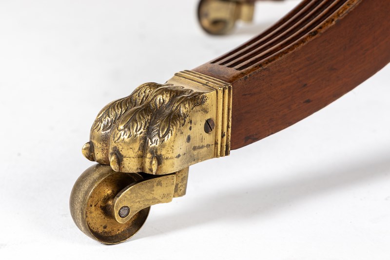 This attractive table is supported on four quality reeded legs. The frieze of the table contains four working drawers and four dummy drawer fronts. The drawers all have gilt brass handles with lion mask detailing to the centre and this lion theme is also reflected in the paw form castor caps at the end of each leg.