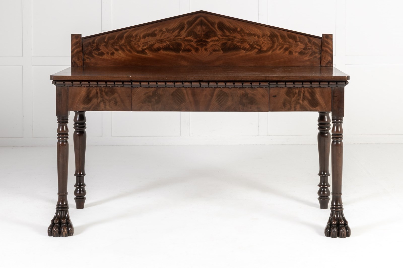 An English Regency Period Mahogany Serving Table with a Raised Back.