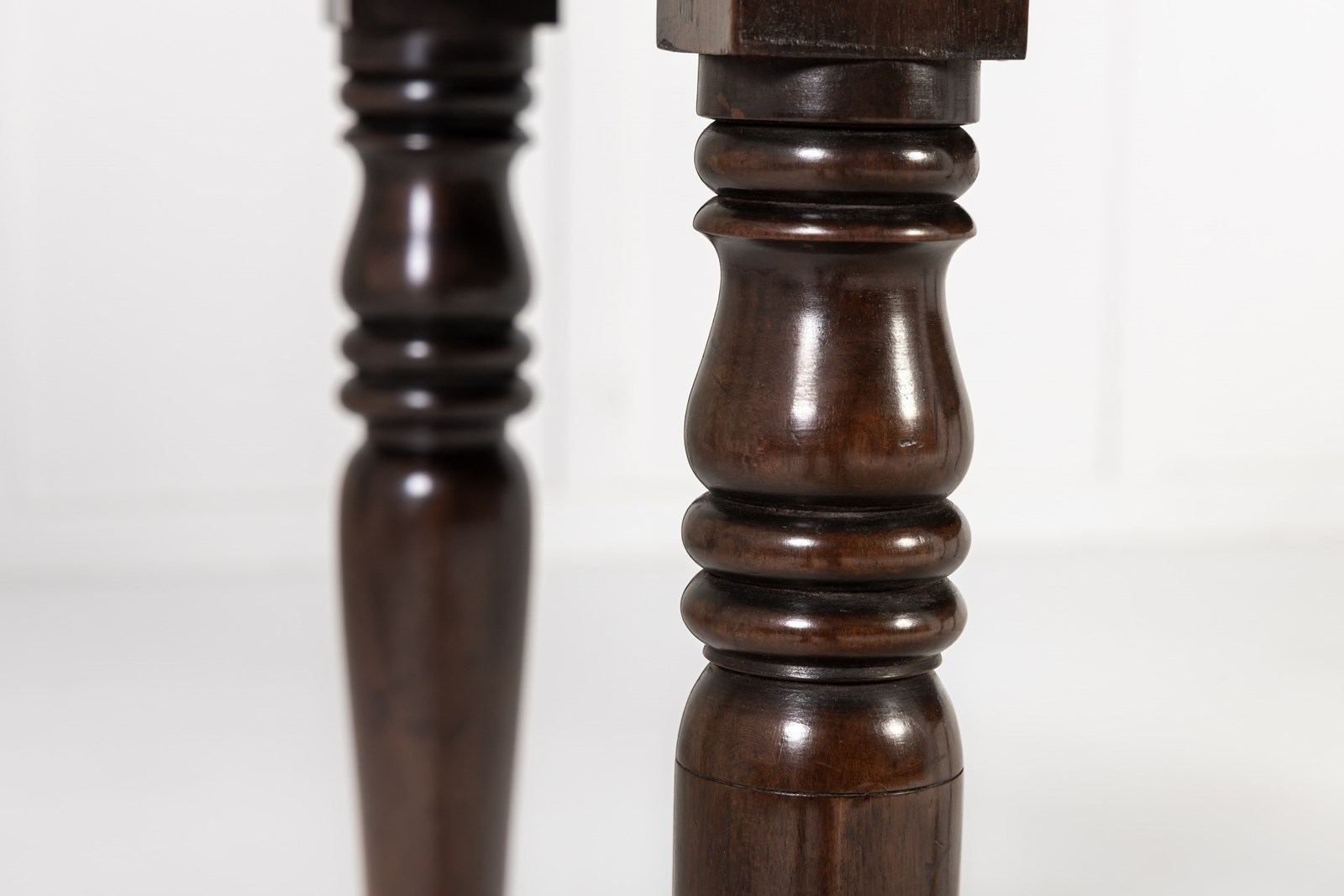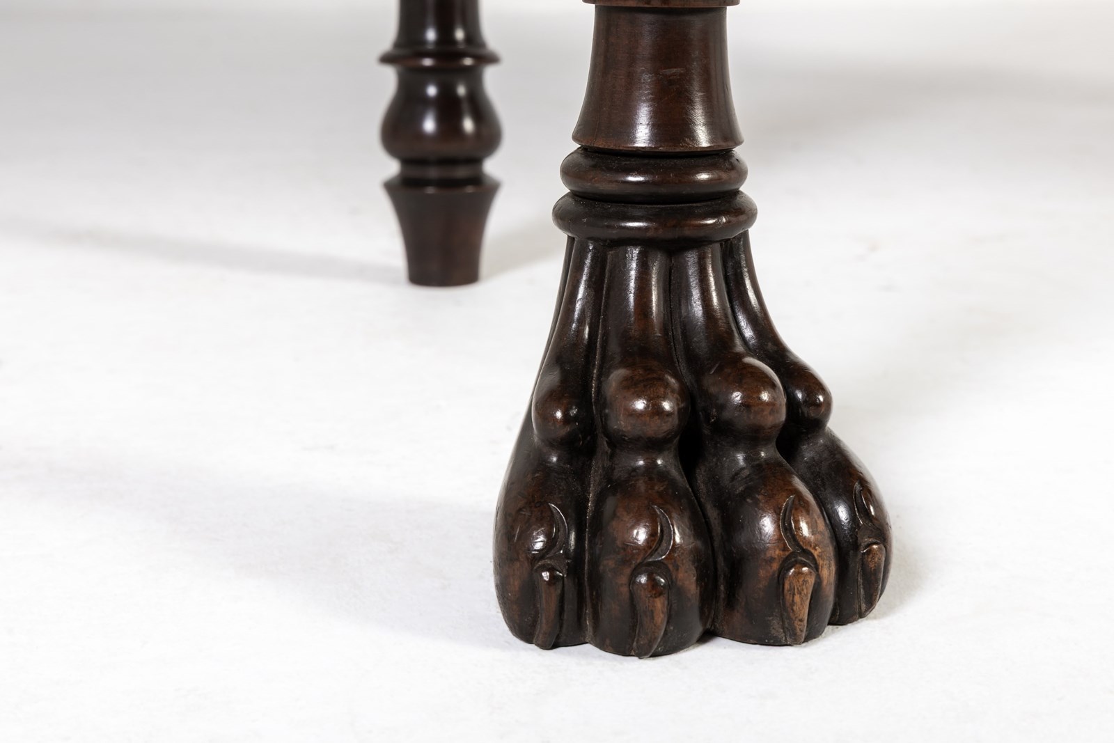 The table stands on four turned legs, the front pair terminating in overscale carved paws in the manner of the designs published by George Smith. Paw feet are something of a hallmark of Irish furniture but it seems likely that this piece is English.