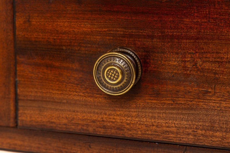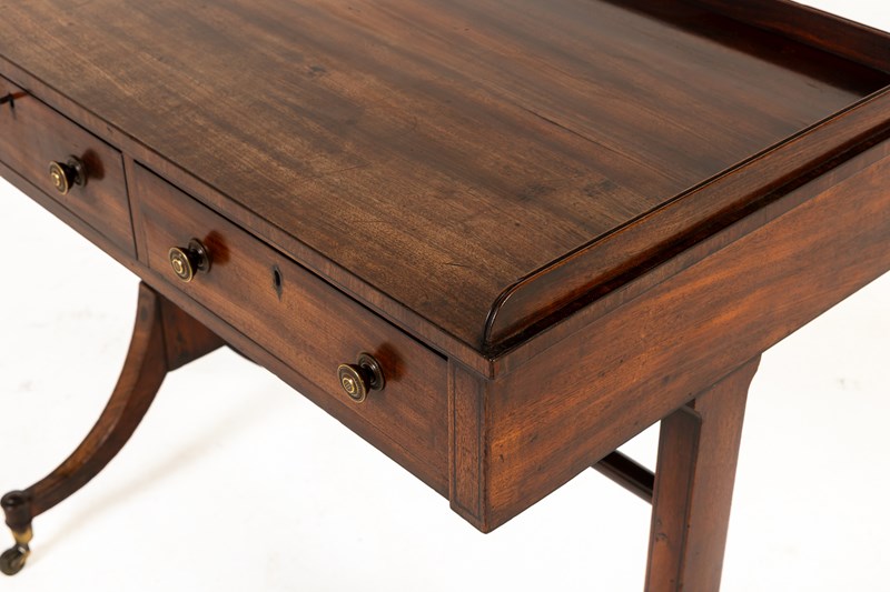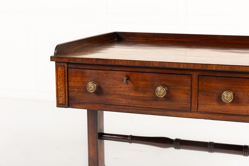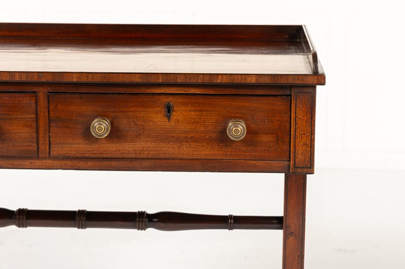 Veneered throughout in finely figured mahogany of lovely colour. The low gallery running around the top. There are two drawers in the frieze, retaining their original gilt brass cast handles. The table stands upon two end supports joined by a turned stretcher, the supports terminating in out scrolling feet with castors. The table is finished on the back as well, meaning that it can be placed anywhere in a room and not just against a wall. The decoration on the piece consists both of the lovely mahogany veneers and in contrasting inlaid ebony stringing on the frieze and legs.