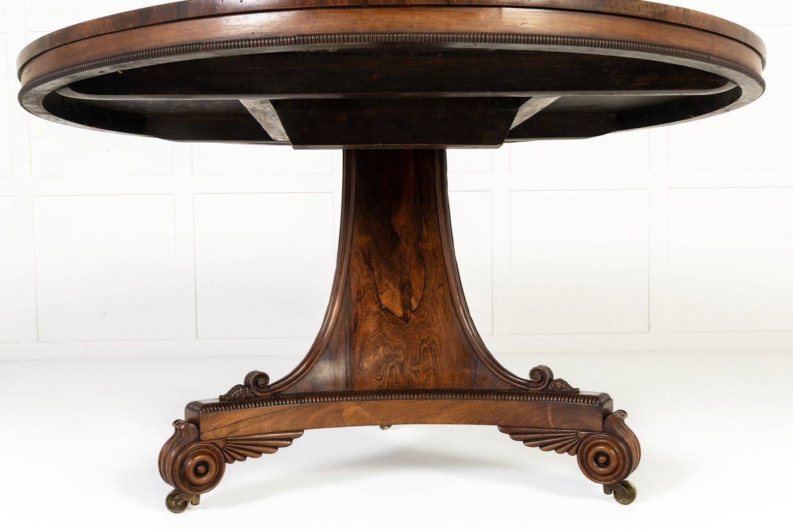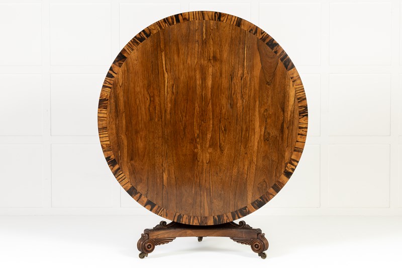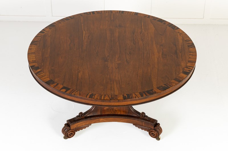 This circular centre table has a tilt top mechanism allowing it to stand at the side of a room when not in use. The top is veneered in beautifully figured bookmatched rosewood and it has finely carved winged scroll feet and conforming trusses above on the base, surrounded by gadrooning. The top of the table is widely crossbanded in coromandel.