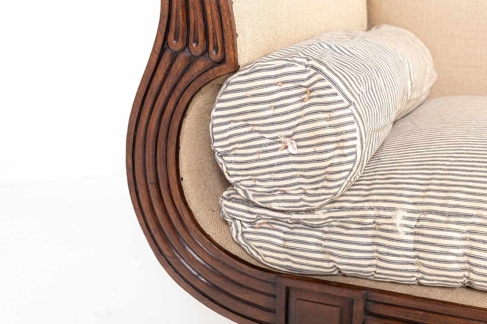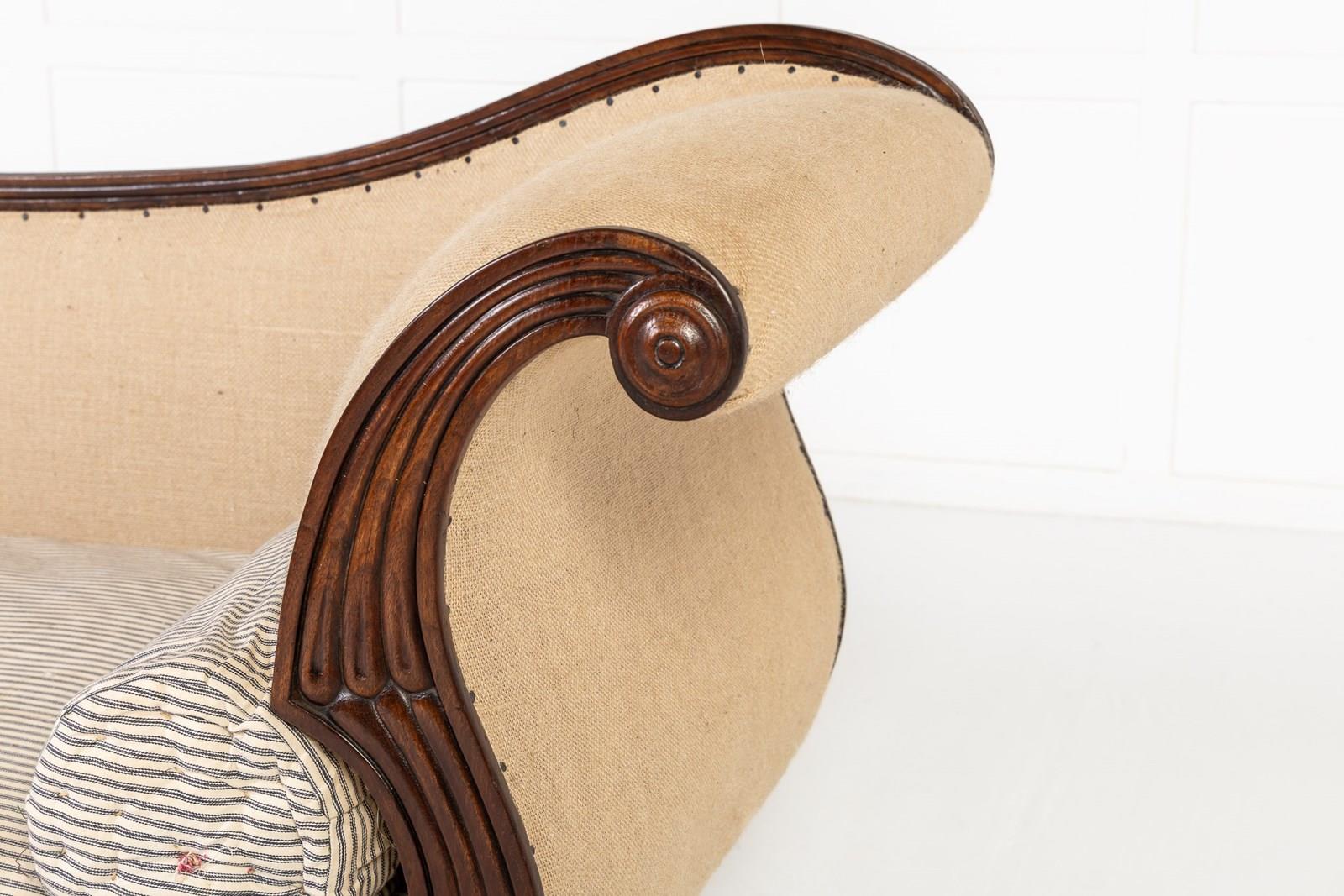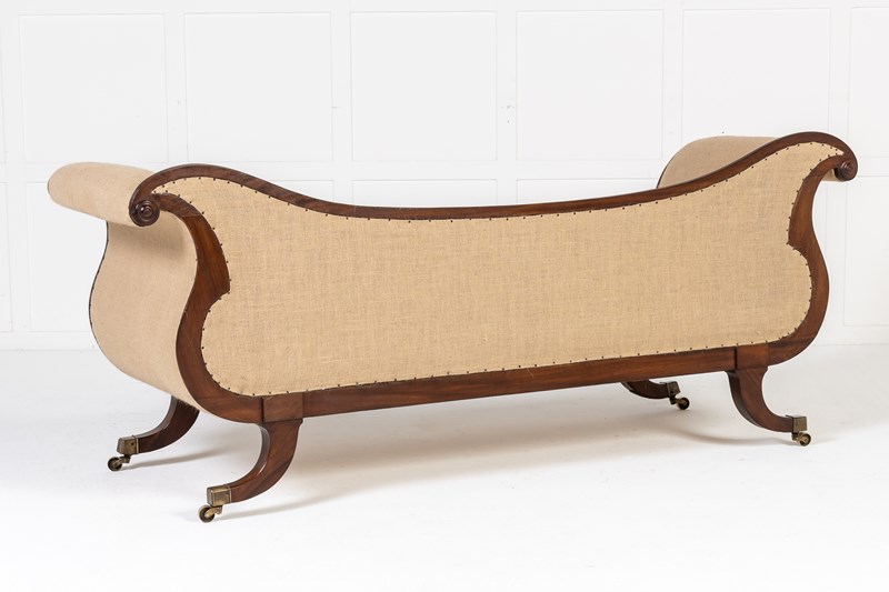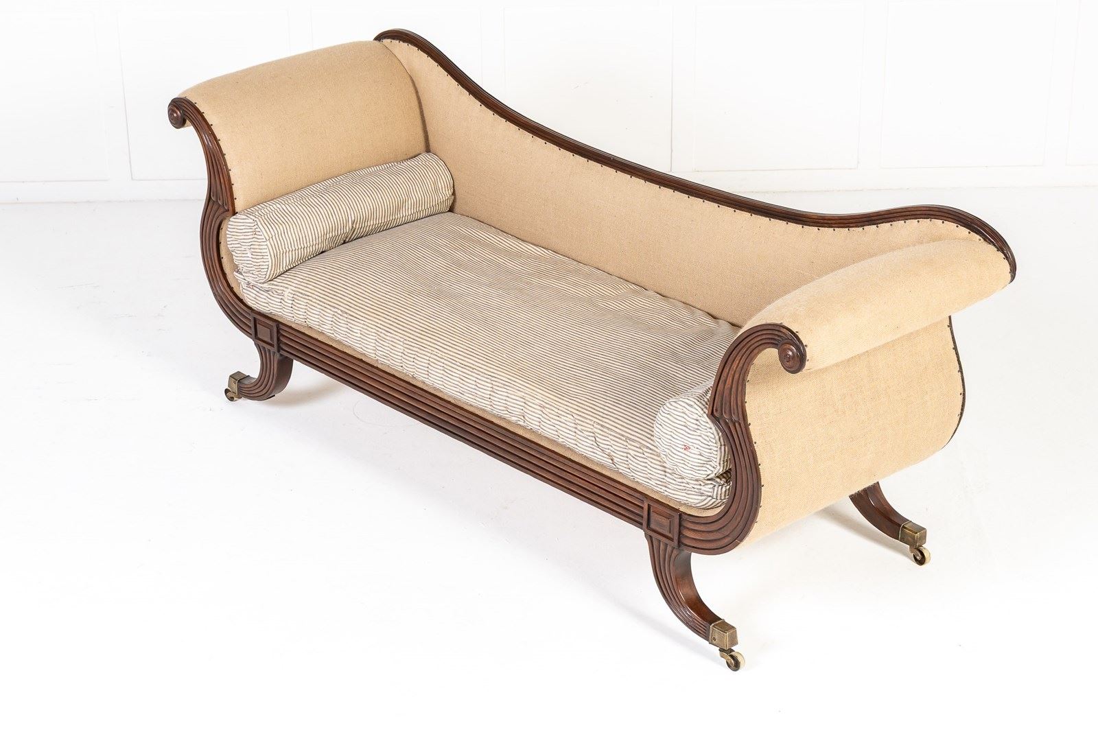 Of elegant curving form, this fine piece epitomises the elegance of English regency period furniture. The sweeping curves of the arm supports and back are matched by exaggerated sabre form legs and there is reeded detailing used throughout. There are carved roundels to the end of the arms and square paterae where the legs join the frame. Standing on box castors. It has a squab cushion and two bolsters and is upholstered to an under finish, ready for final upholstery fabric to be applied or could be left as it is for a contemporary look.