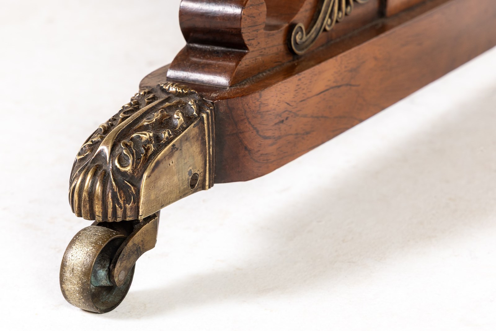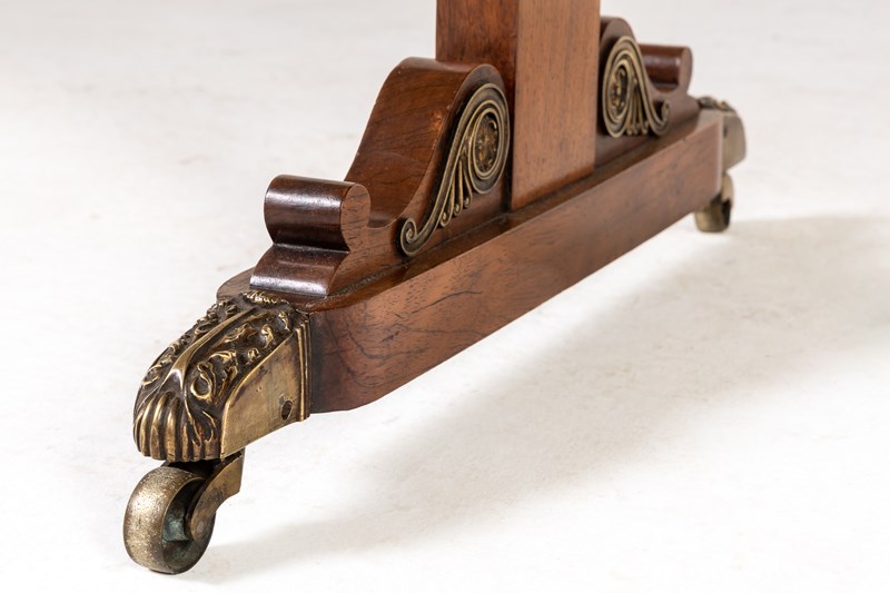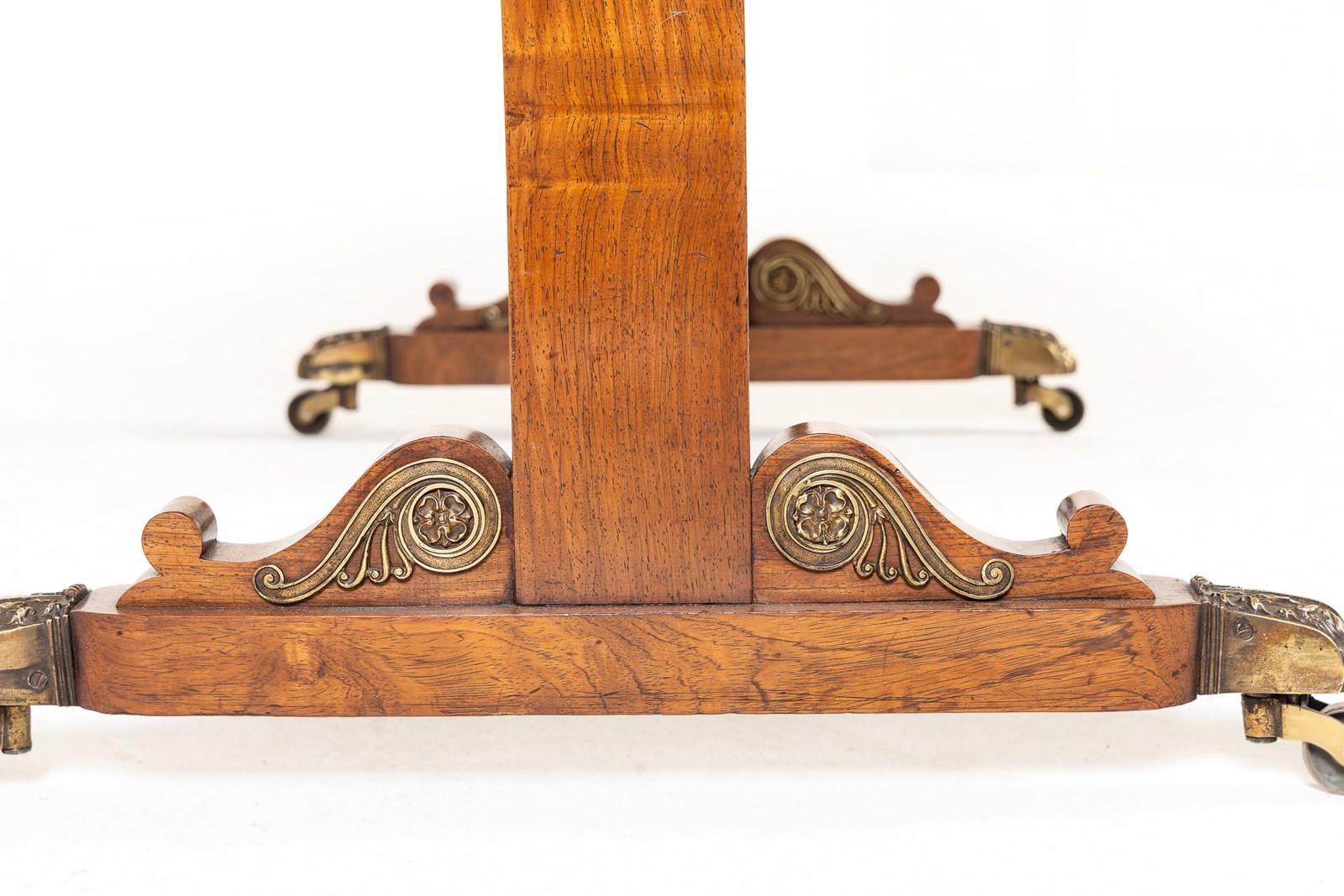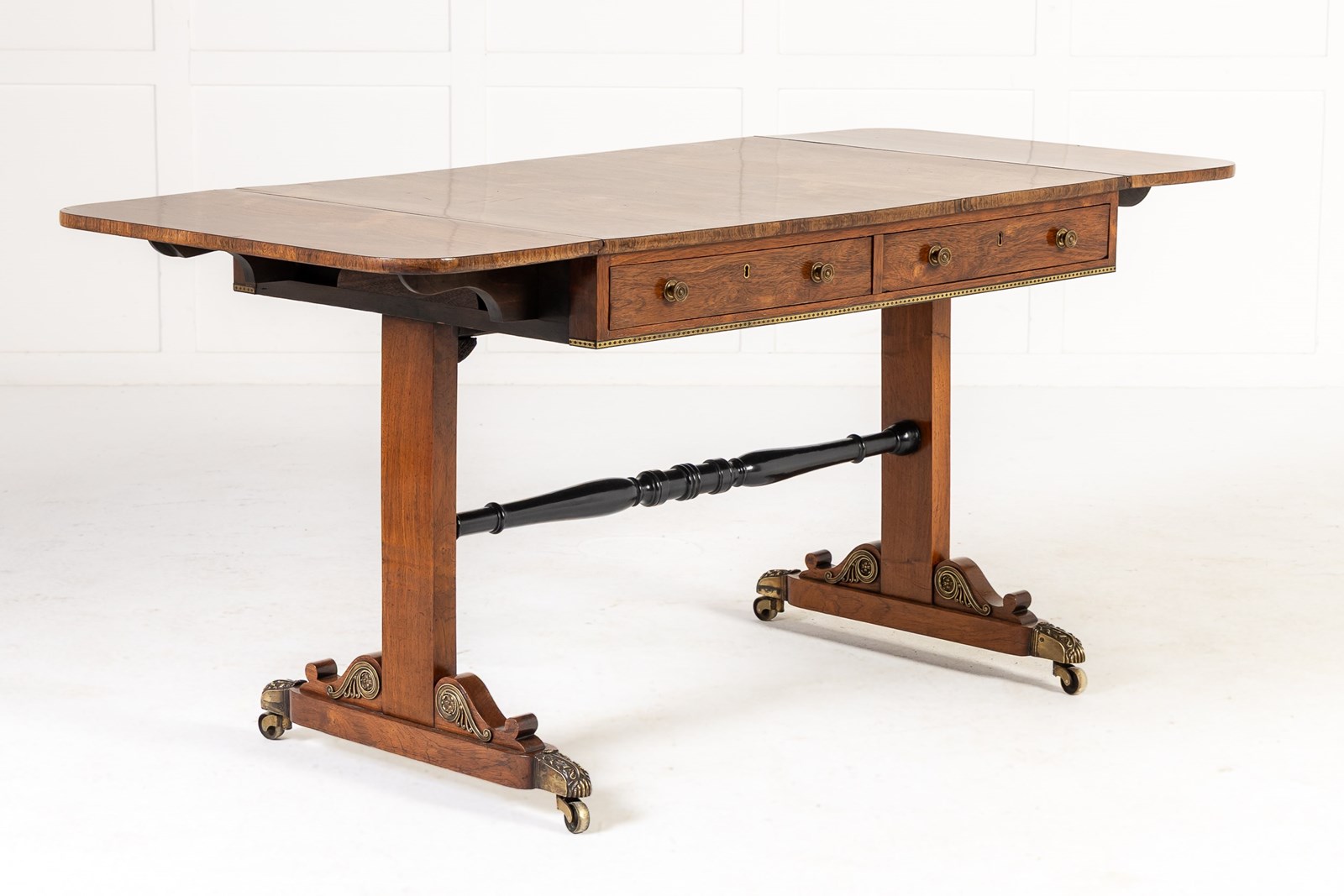 This sofa table has an impressive, finely figured bookmatched top set above a frieze with two drawers and brass drawer pulls, and the usual side flaps. Beneath the drawers is a gilt brass and ebonised strip. The two plain end supports terminate in brass mounted platform feet with brass castors. The turned stretcher on the table is ebonised.