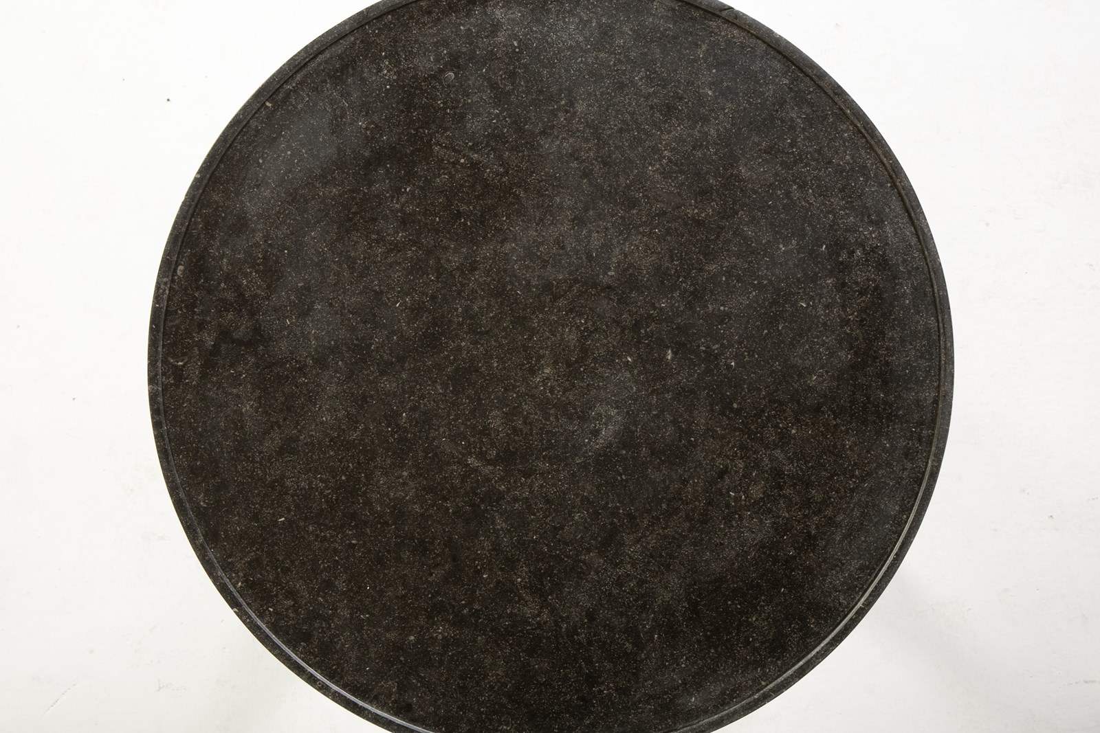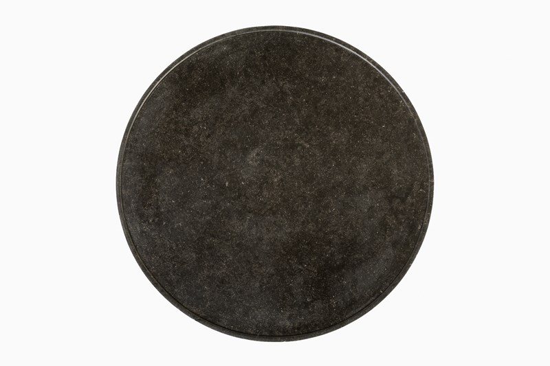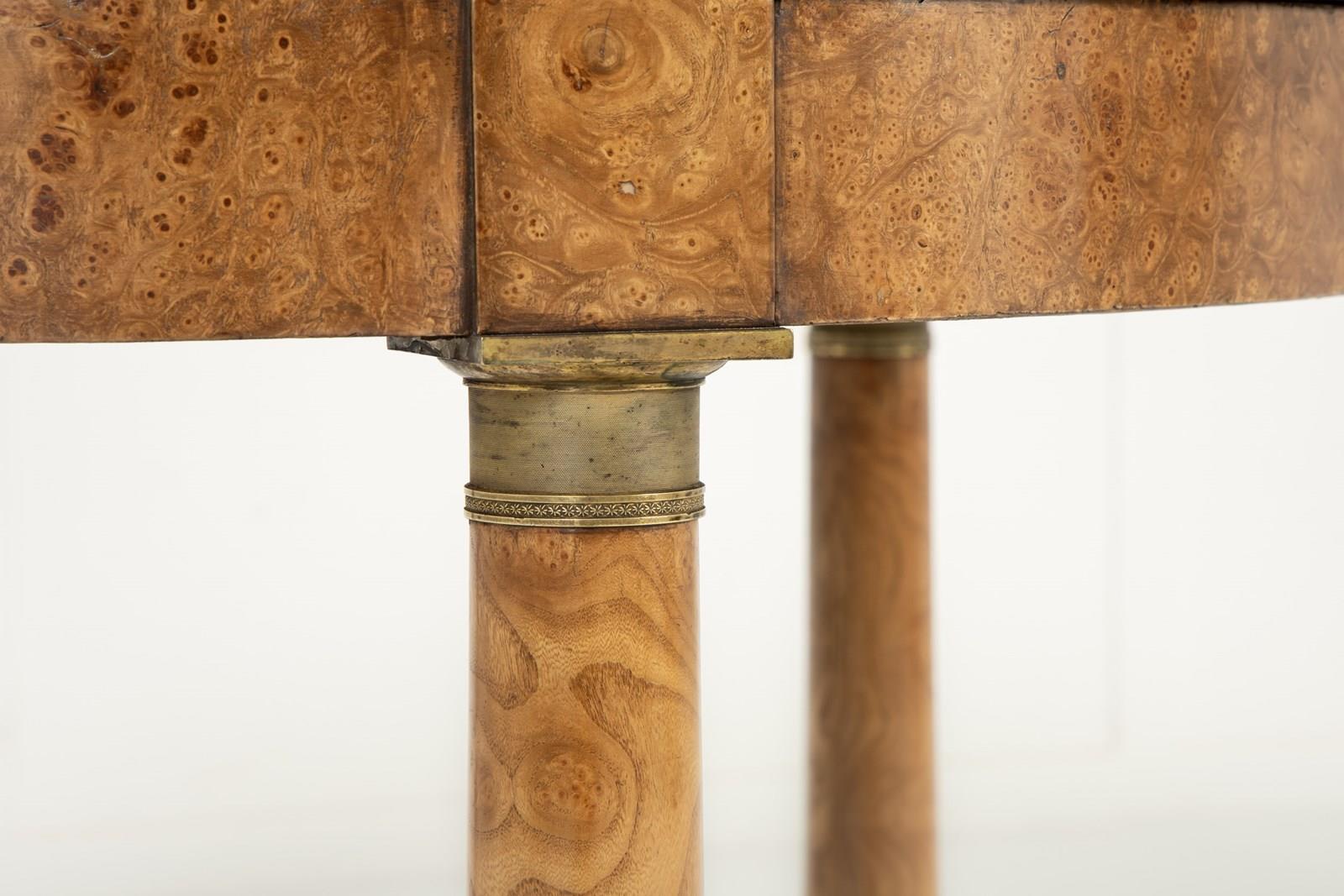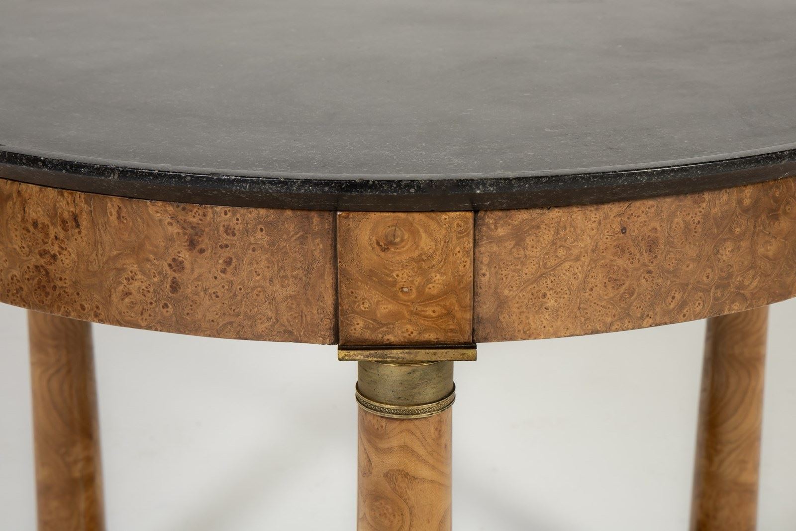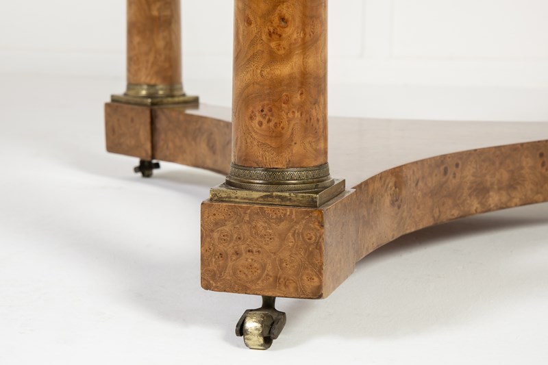 The black marble top has a moulded edge, supported on a frieze of figured burr elm. The burr veneers are also used on the three columns and the tripartite platform base. There are ormolu mounts to the capitals and bases of the columns. The elm is a lovely colour and has excellent patination. Standing on small brass castors.