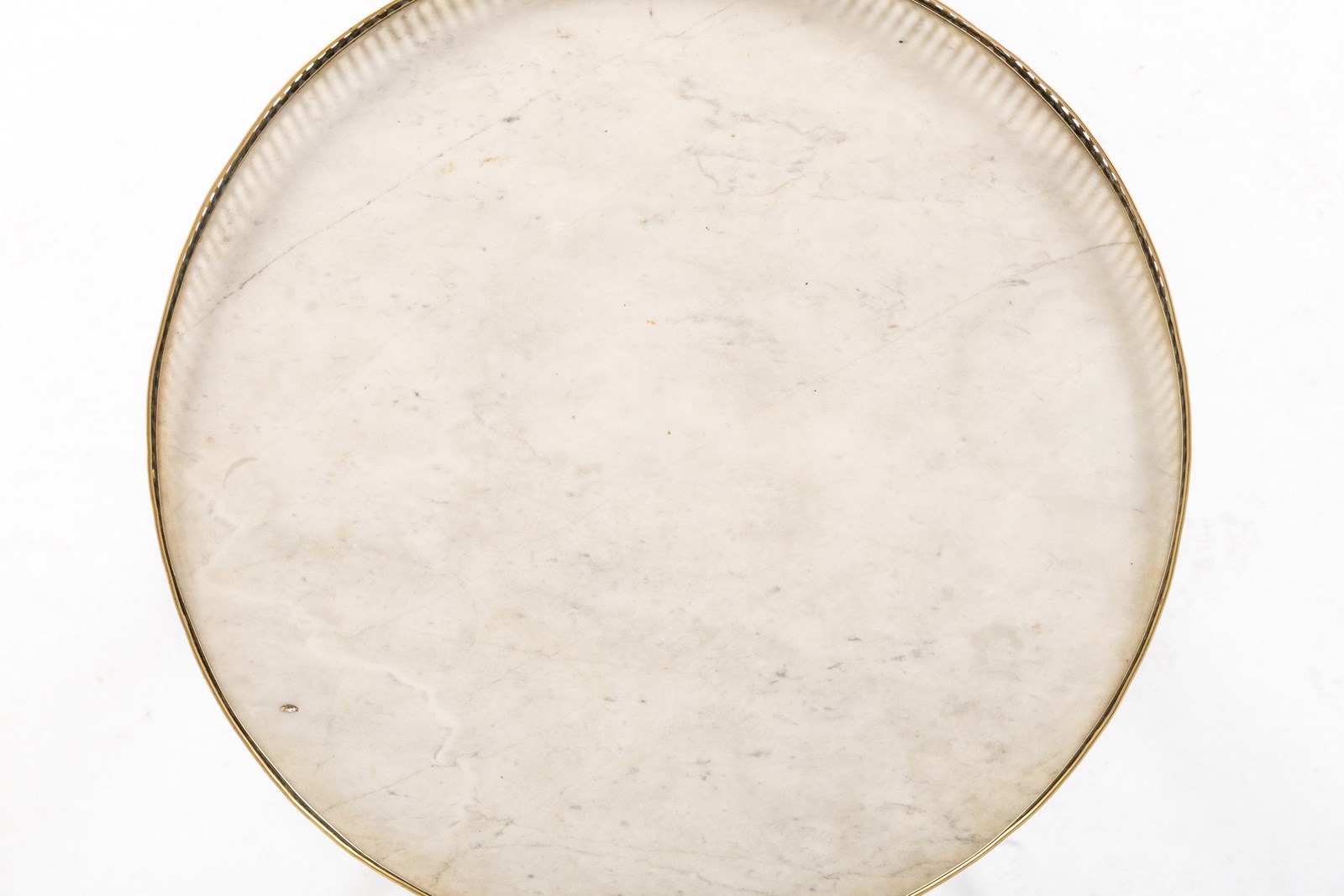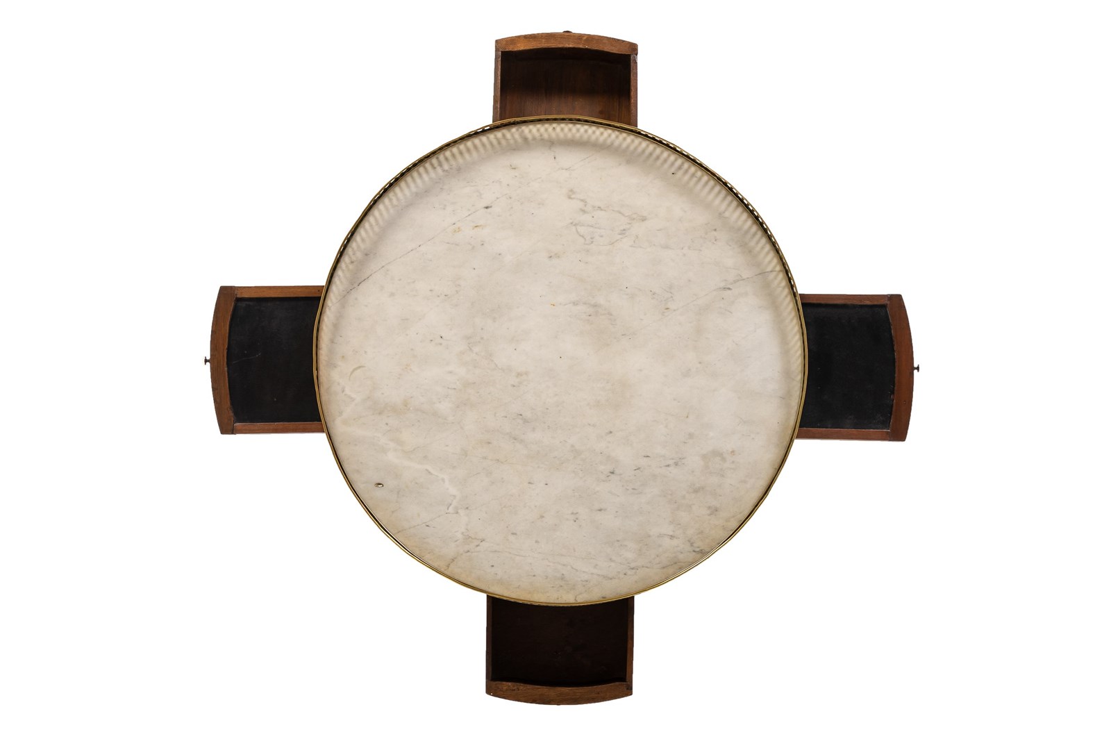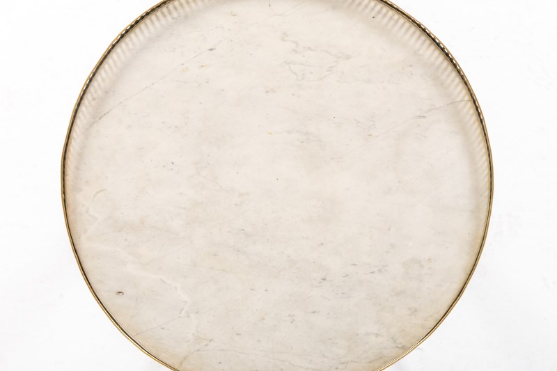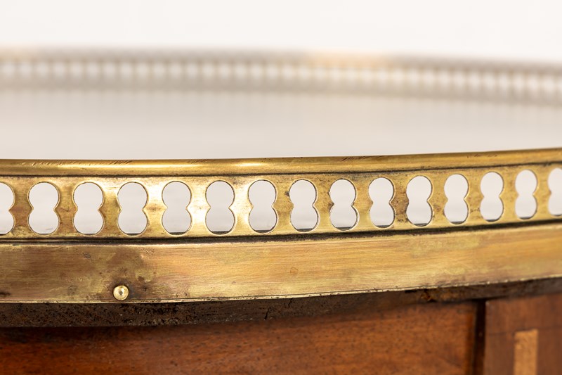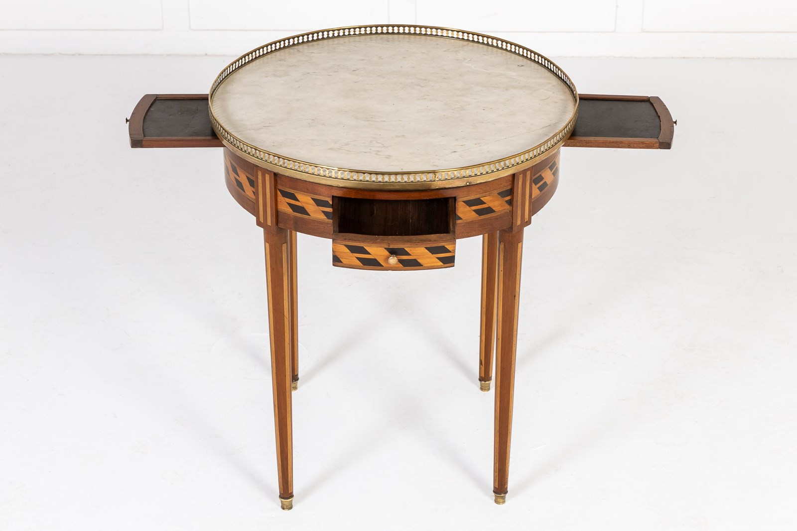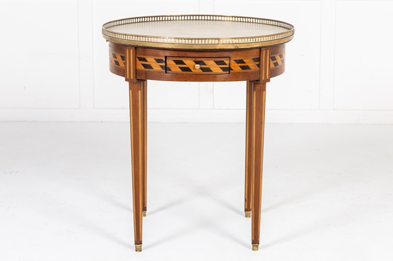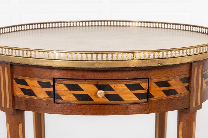 Early 19th century French mahogany and satinwood guéridon with a marble top, edged by an attractive brass gallery. There is ebonised inlay to the frieze which has two small drawers and two pull out slides with leather inserts. Standing on tapering legs with small brass feet.