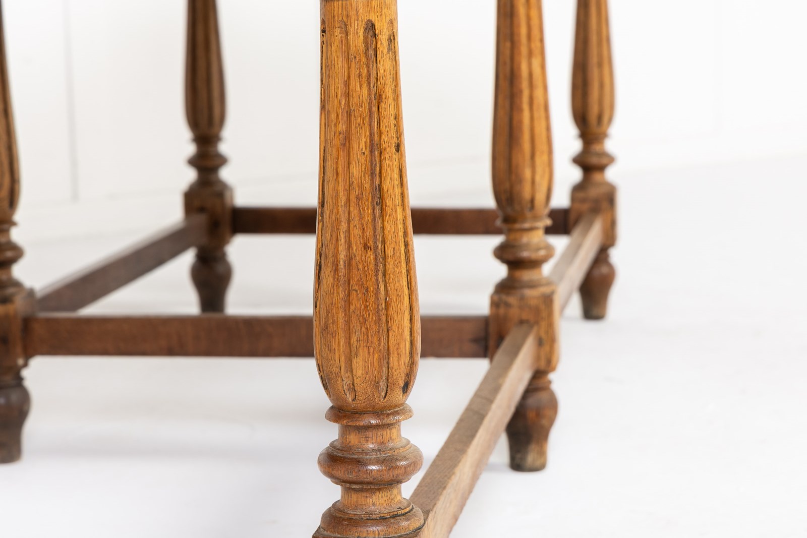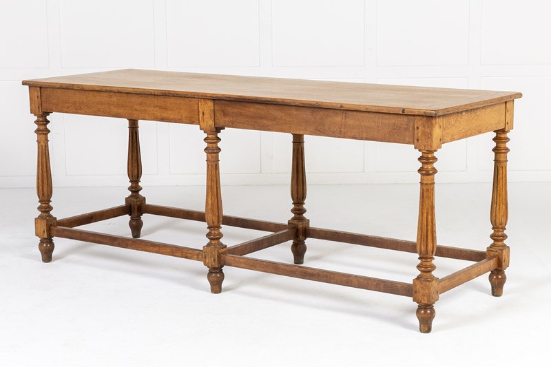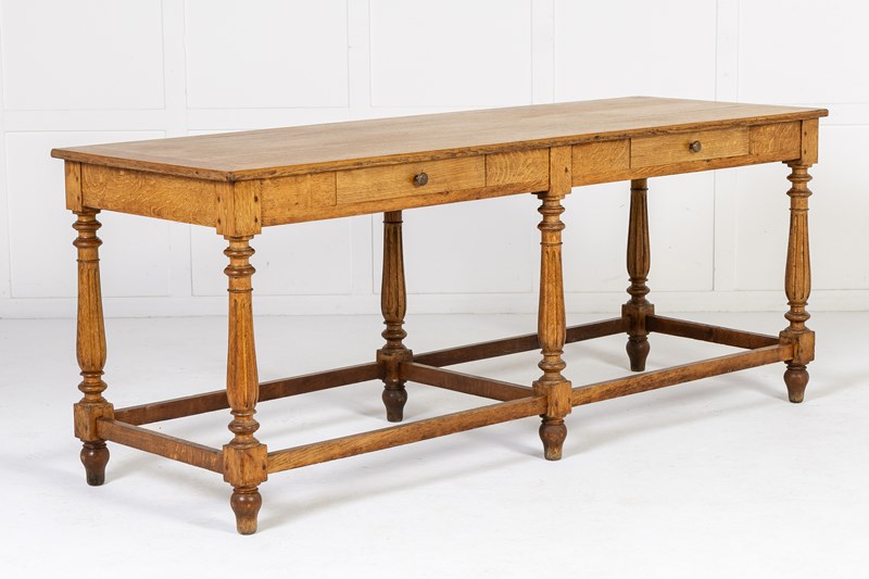 Constructed from solid French oak of beautiful mellow colour with good figured timber used throughout. It stands on six well-turned tapering baluster form legs with fluted detailing, joined by stretchers. There are two small drawers in the frieze with brass drawer pulls. The top has three planks with cleated ends.