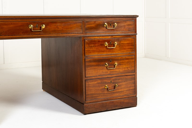 This handsome and impressive pedestal desk is of large size and of good depth, veneered throughout in figured mahogany. There are three drawers in the frieze and three drawers in each pedestal on the front. At the back, the pedestals function as cupboards with a single panelled door on each side. All of the drawers retain their original gilt brass handles which are of a pattern known to have been used by Gillows. The mahogany used is of very high quality.