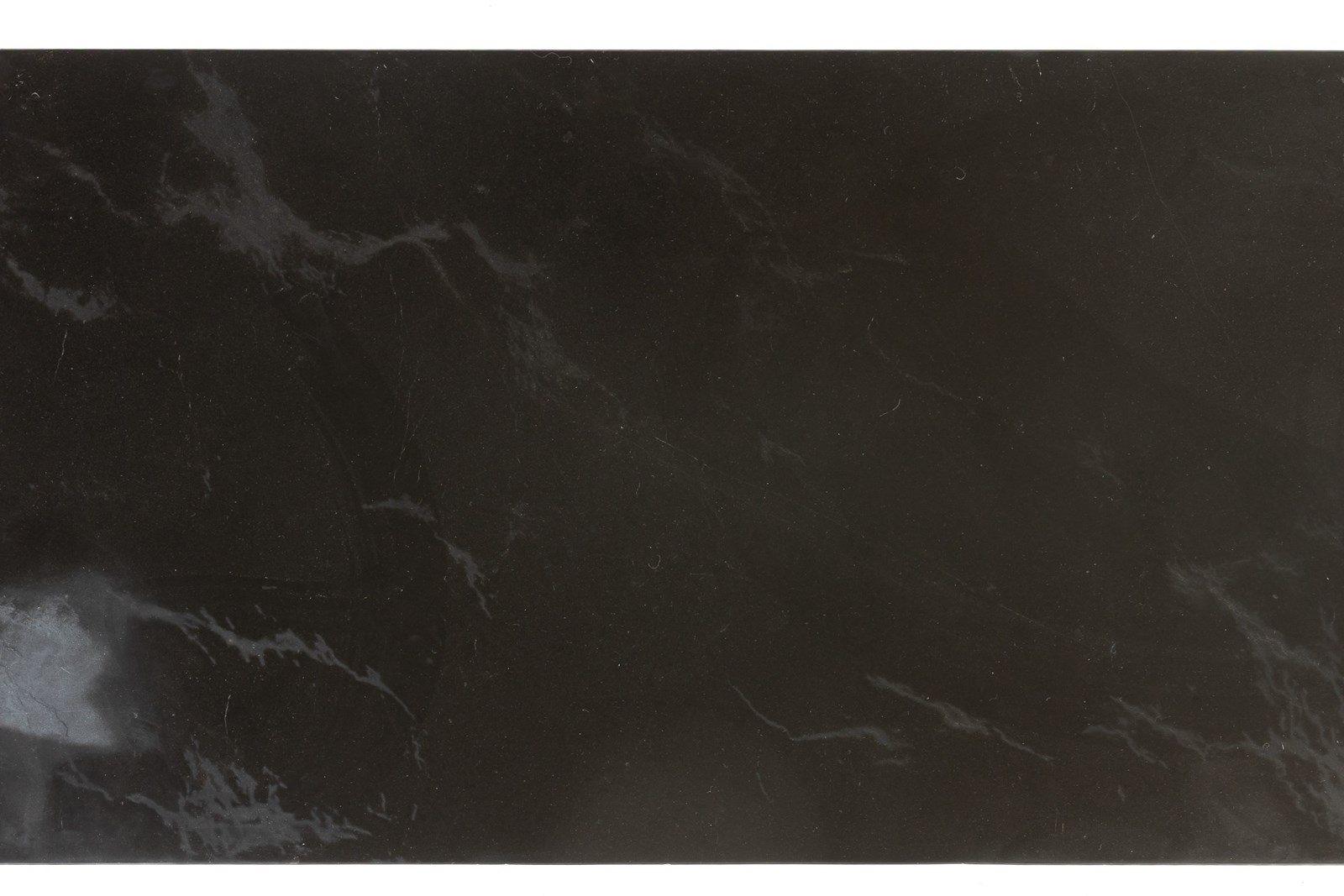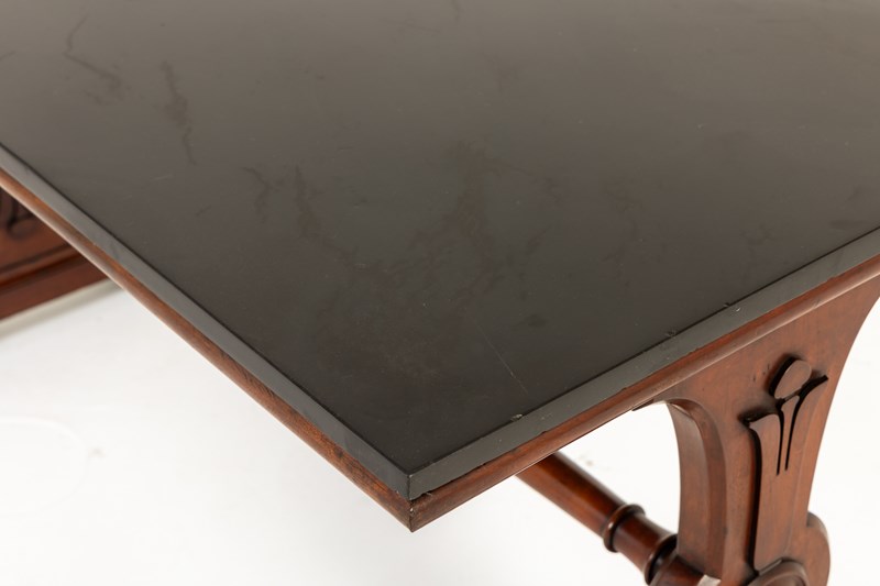 An excellent, substantial sized table, having a black marble top supported by two ends, carved with lotus flower detailing and joined by a turned central stretcher. The carving and the variety of turnings used on the stretcher are signs of high quality workmanship. It is unusual to find marble tops on tables of this sort.