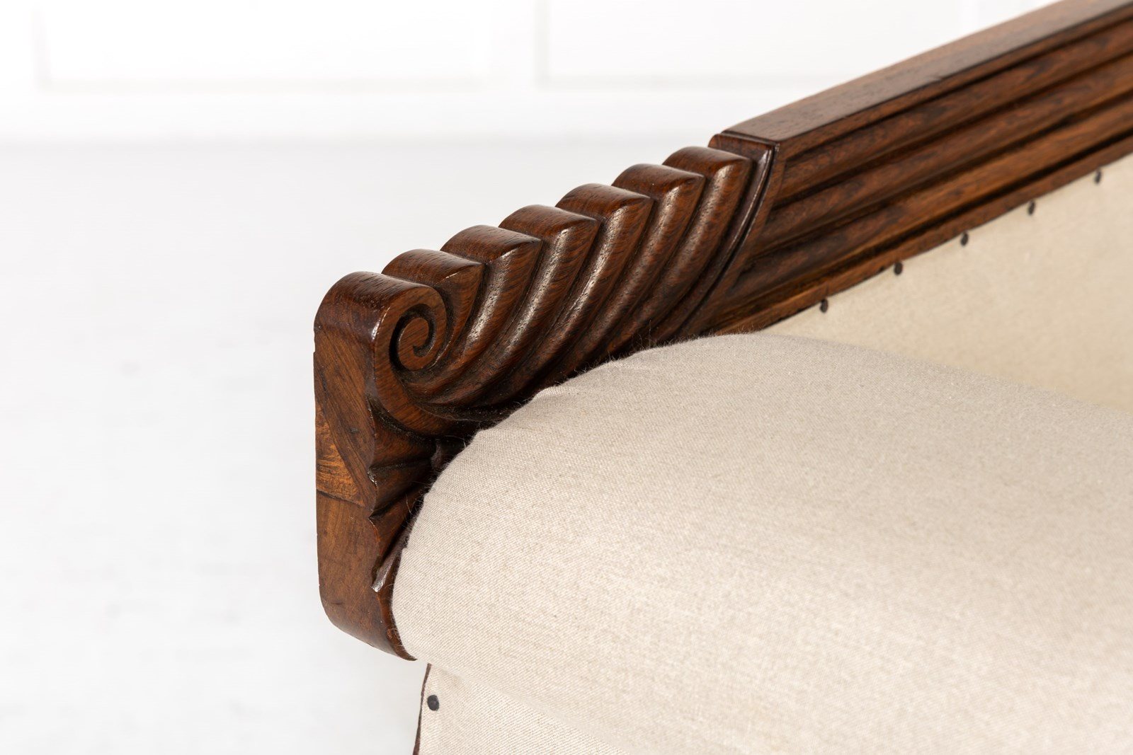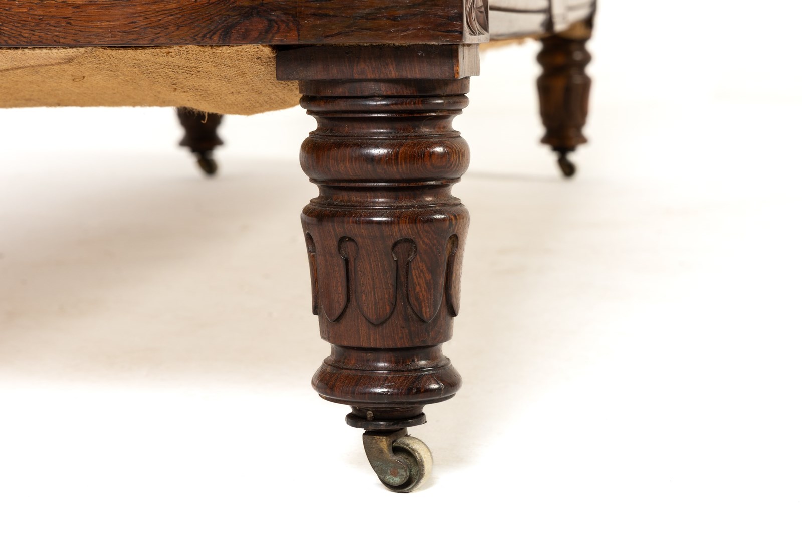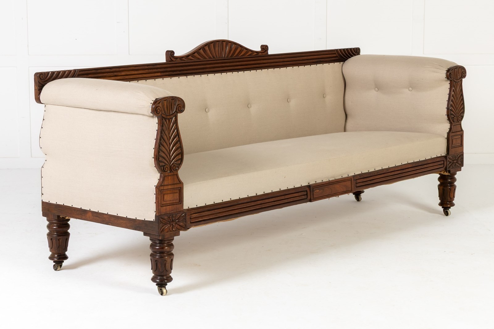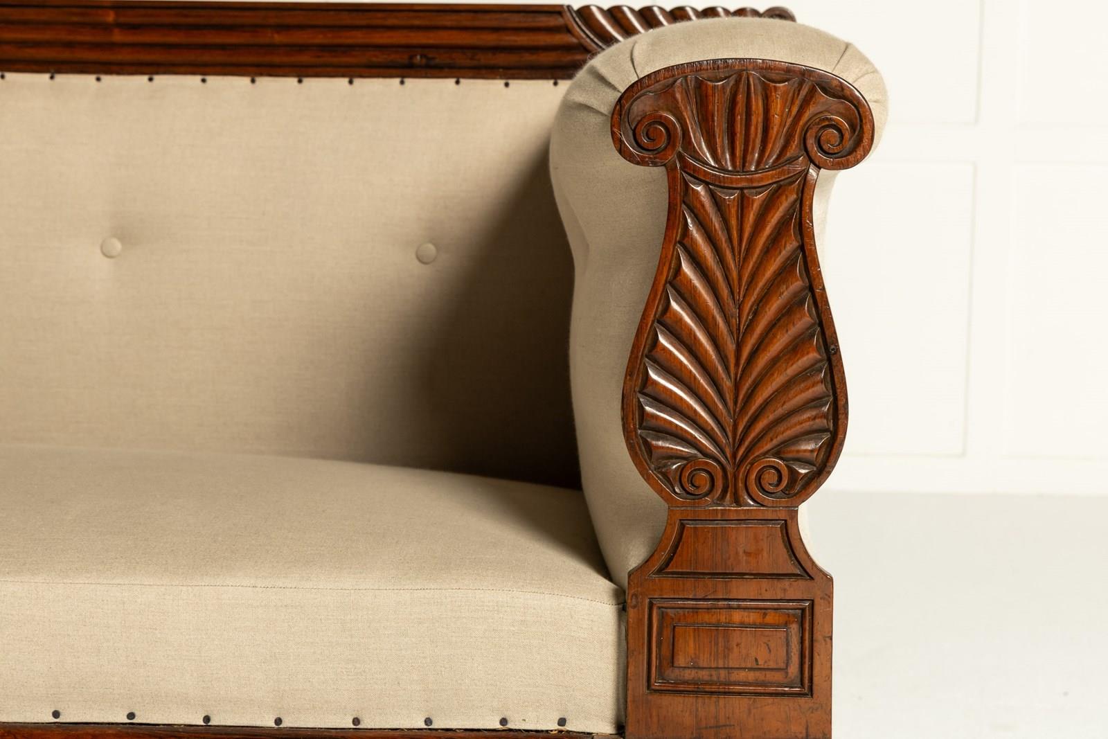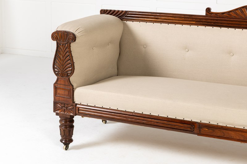 An impressive country house sofa, its proportions perfectly judged. It has a show rail to the back, and a pagoda-like cresting with gadrooned detailing. The arm supports have fine leaf carving and panelling above floral paterae. Standing on four sturdy, turned and carved legs with castors. The frieze, like the top rail, has reeded detailing. The timber used throughout is of good figure and has an excellent colour.
