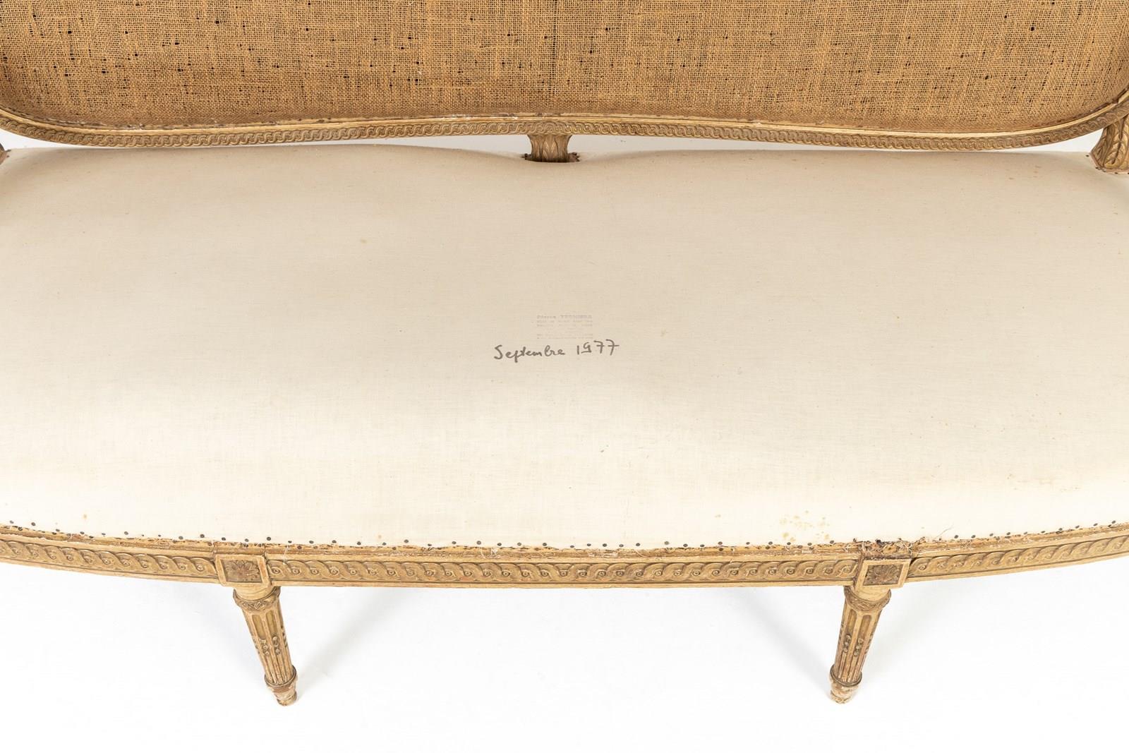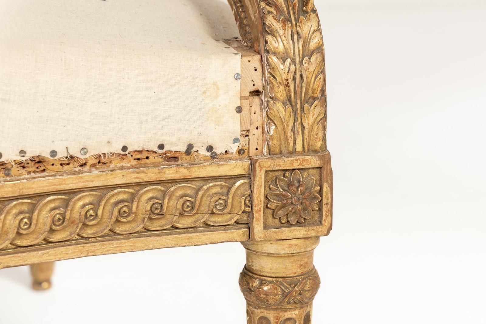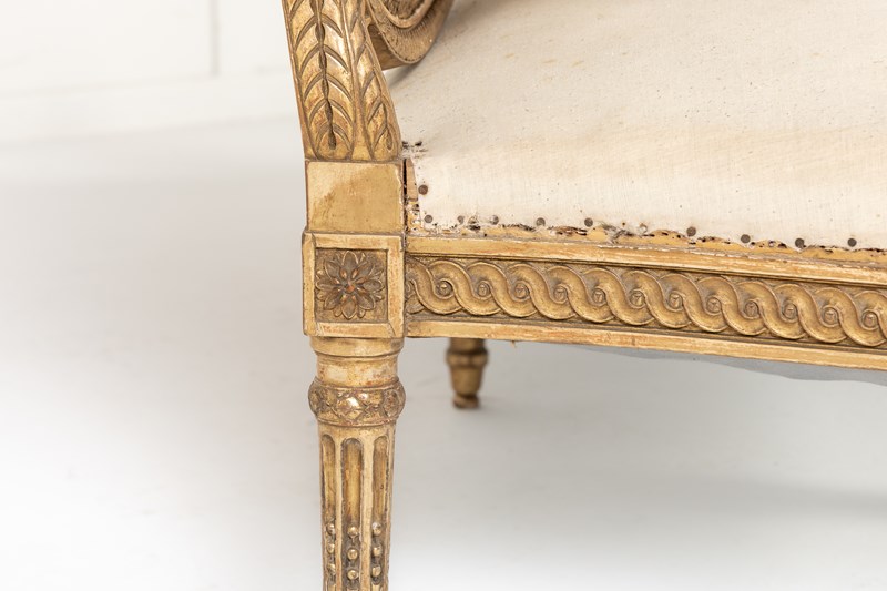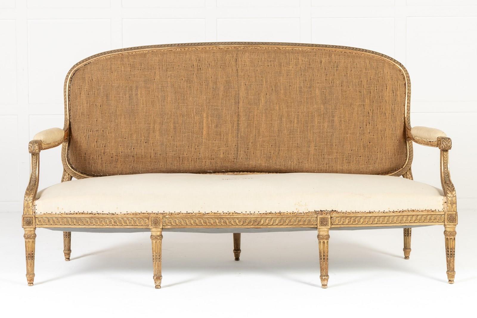 Of large scale, this sofa is gilded throughout and stands on seven turned and carved legs with toupie feet. The show frame on the back and the front seat rail are both carved with a repeating guilloche design, the legs are fluted with additional leaf carving where they join the front rail. There are also carved floral paterae on the blocks at this point.