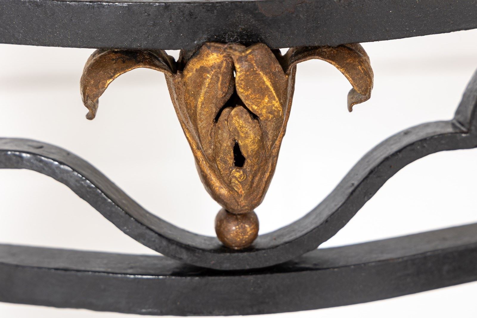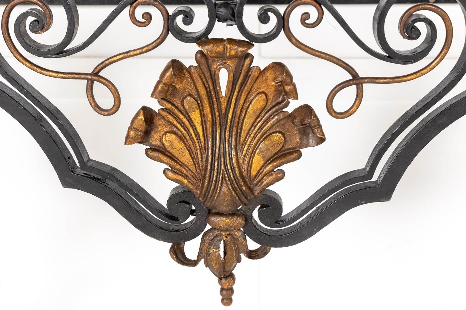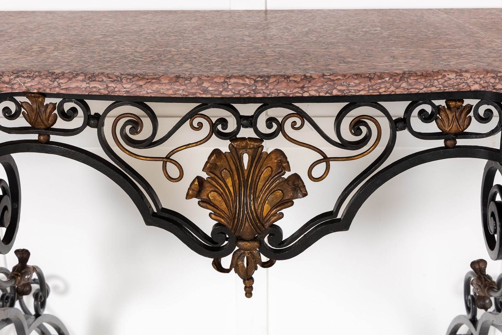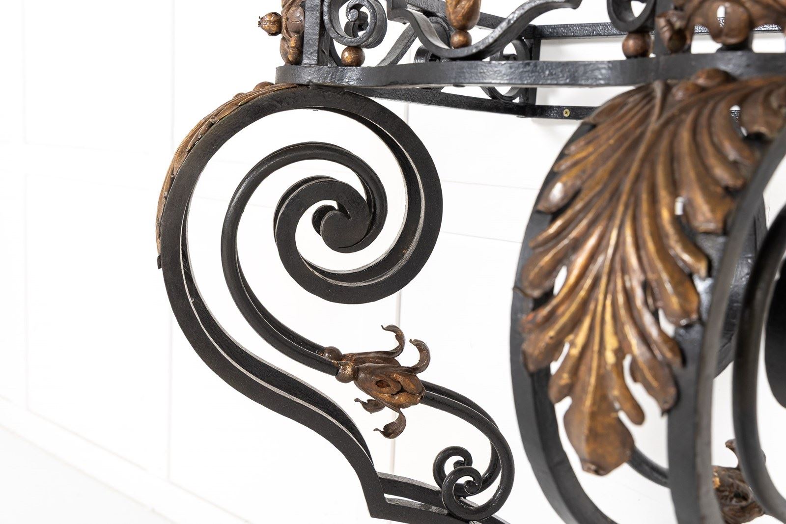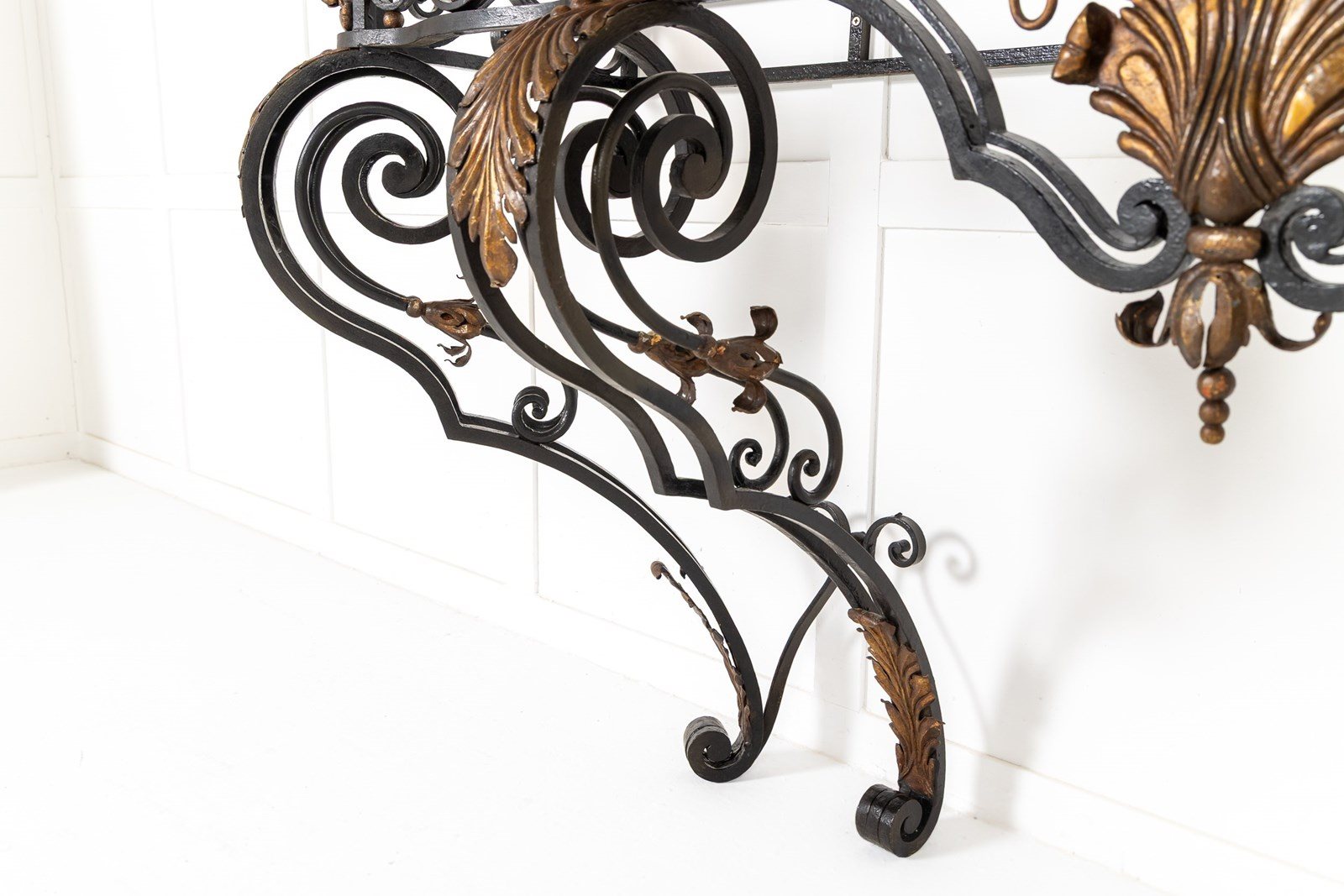 Of interesting shape, this table has a lovely marble top supported on a wrought iron and parcel gilded console frame base. It is of particularly large and important size, and was probably designed for a grand house. The rococo revival design of the base, has a stylised shell design in gilt, and is finely worked and beautifully balanced in both practical and decorative terms.