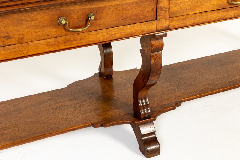 This grand piece is much larger than usual and has a two planked top, outlined with further planks having a decorative, moulded and shaped edge. The six supports below are elaborately carved, of cabriole form with paw feet. These rest upon a chamfered platform stretcher. The base then rests upon three carved supports or feet. The walnut is of very good colour with a nice depth of patination.