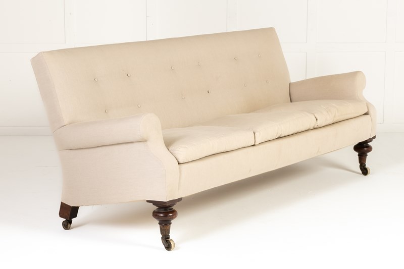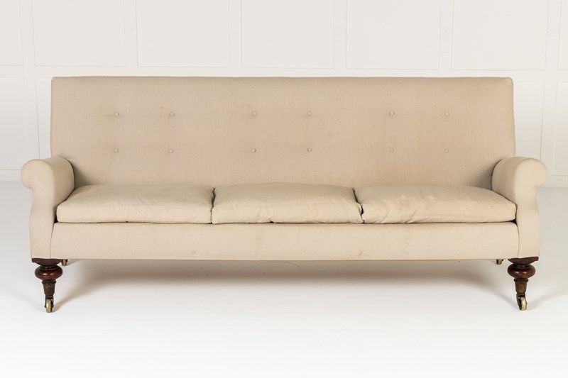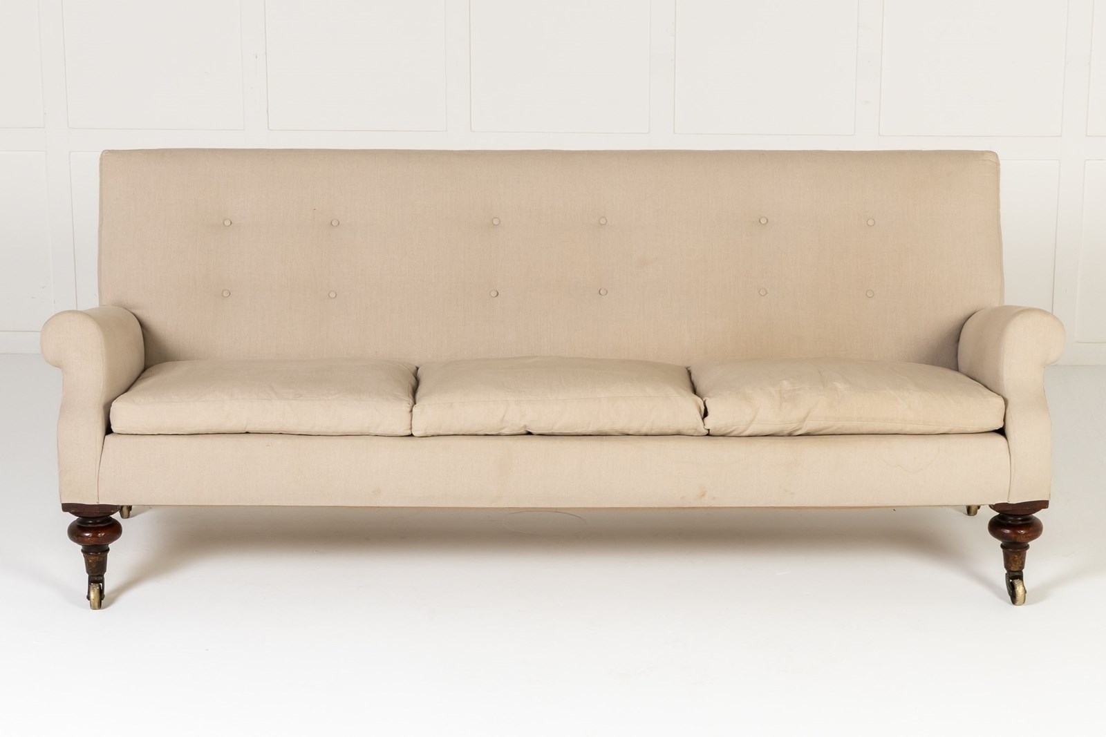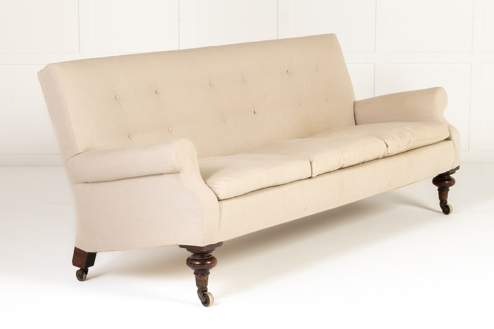 This sofa was made in the early part of the 19th century. The detailed toupie front feet are beautifully patinated and have their original castors. The sofa seat is of relatively shallow depth.