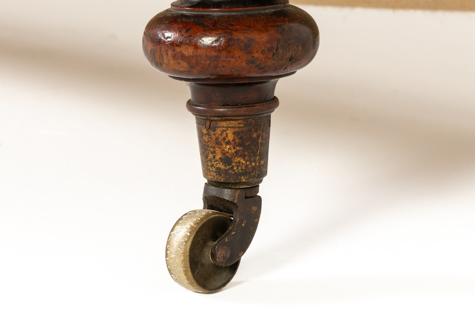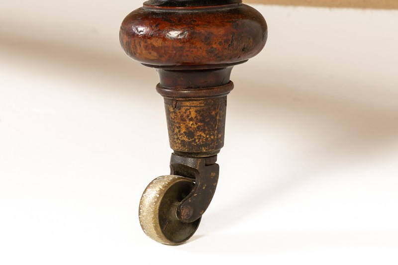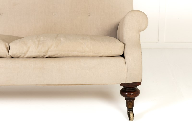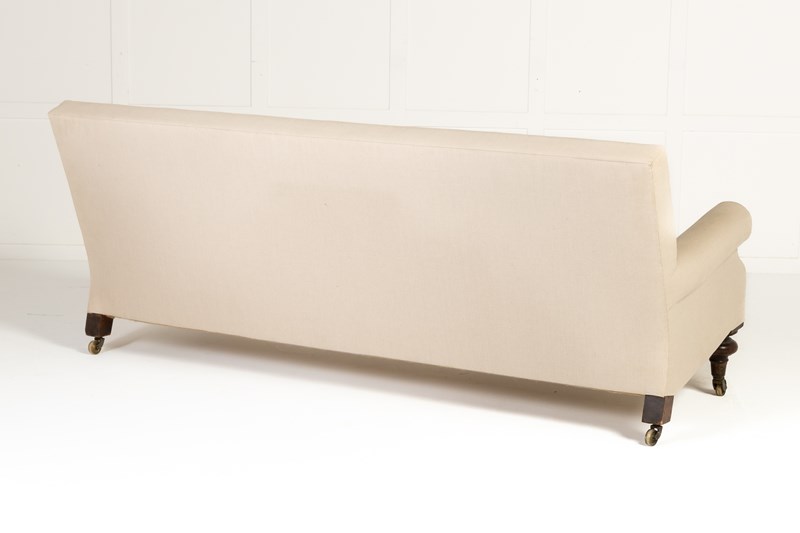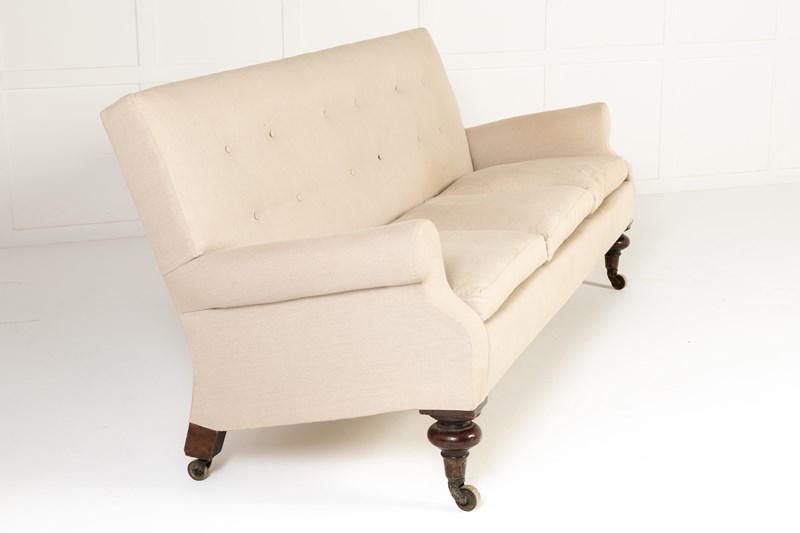 This sofa was made in the early part of the 19th century. The detailed toupie front feet are beautifully patinated and have their original castors. The sofa seat is of relatively shallow depth.