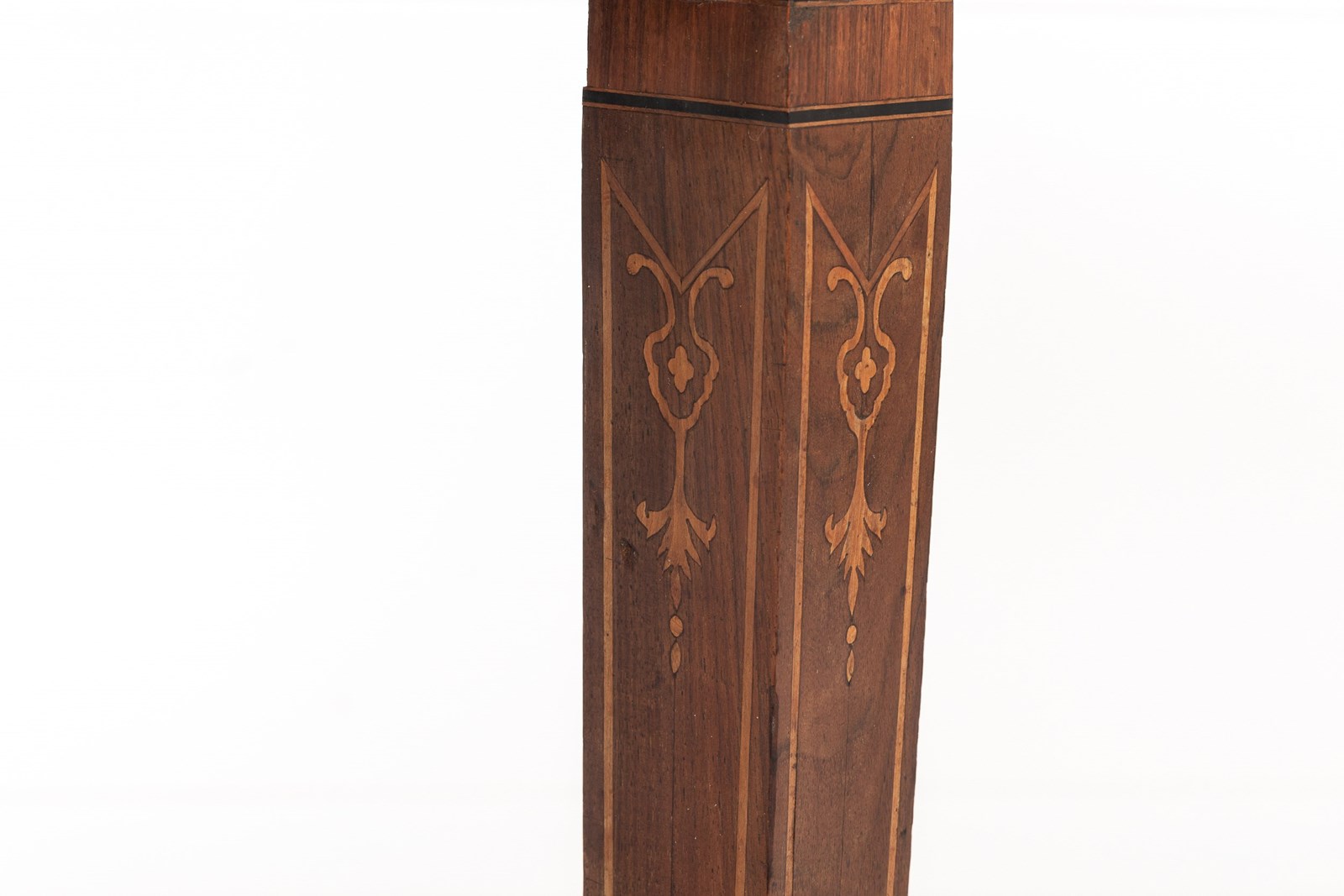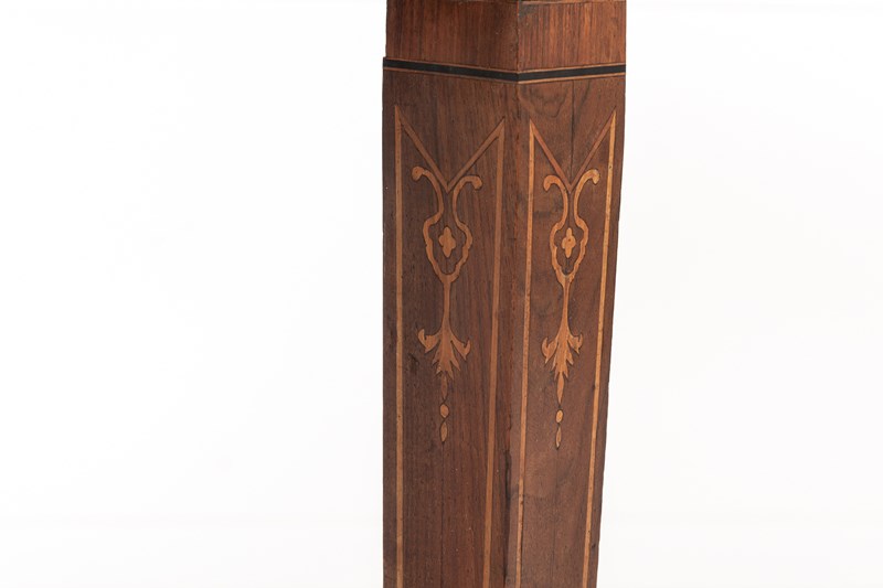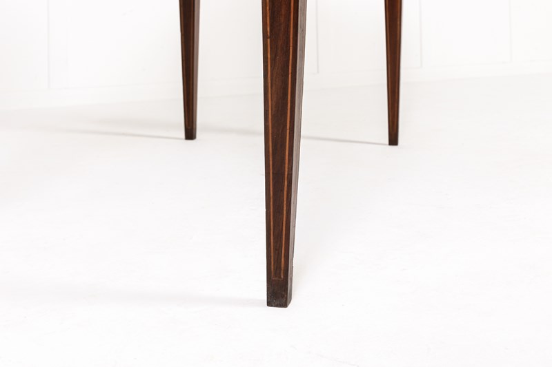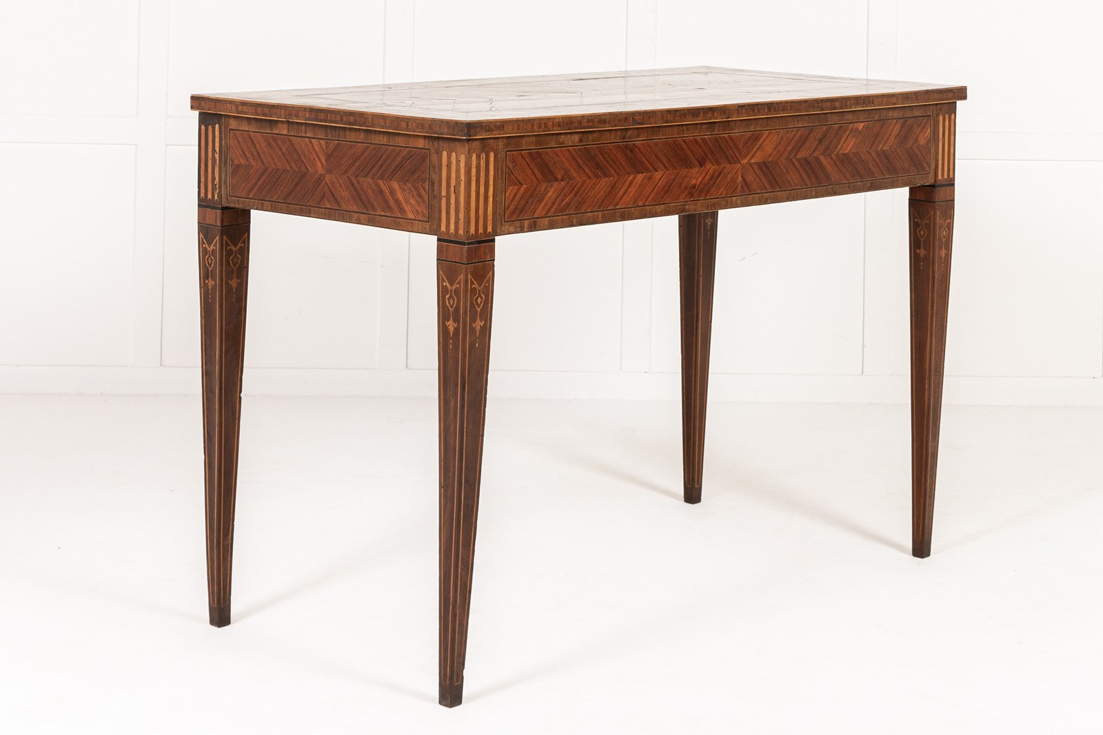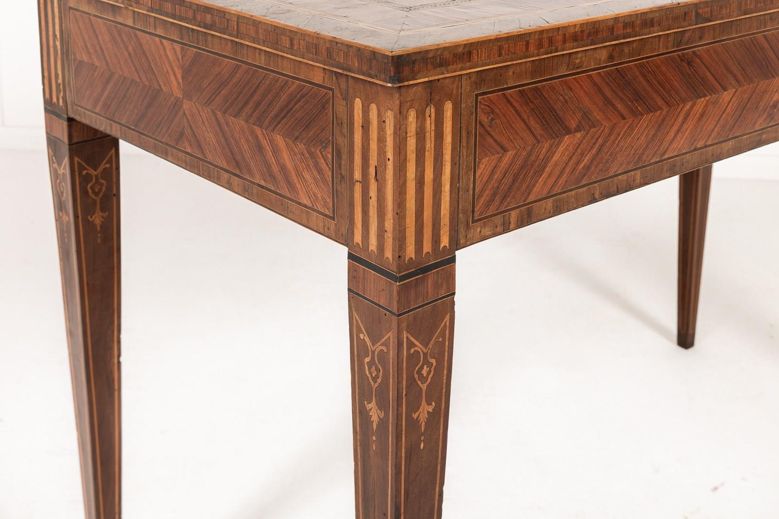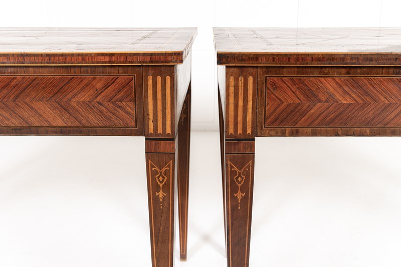 This elegant pair of Italian console tables from the 18th century have distinctive and exquisite kingwood veneers and delicate inlay throughout. The tops are quarter veneered kingwood with chequered inlay and walnut crossbanding and the panelled apron is adorned with the same banding, with the addition of mock fluted blocks to the corners. Raised on slender tapering legs, with foliate motifs in their upper section.