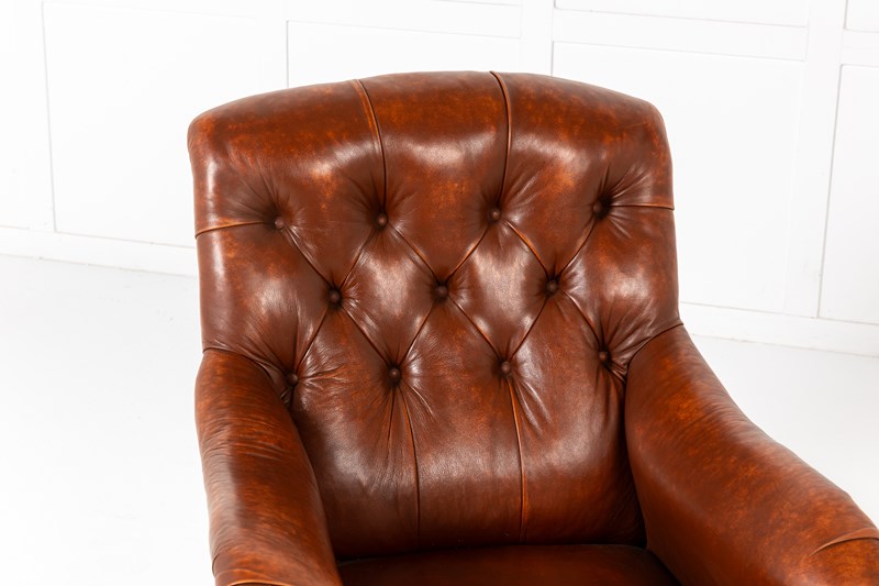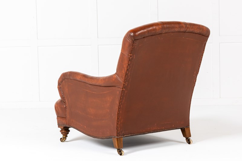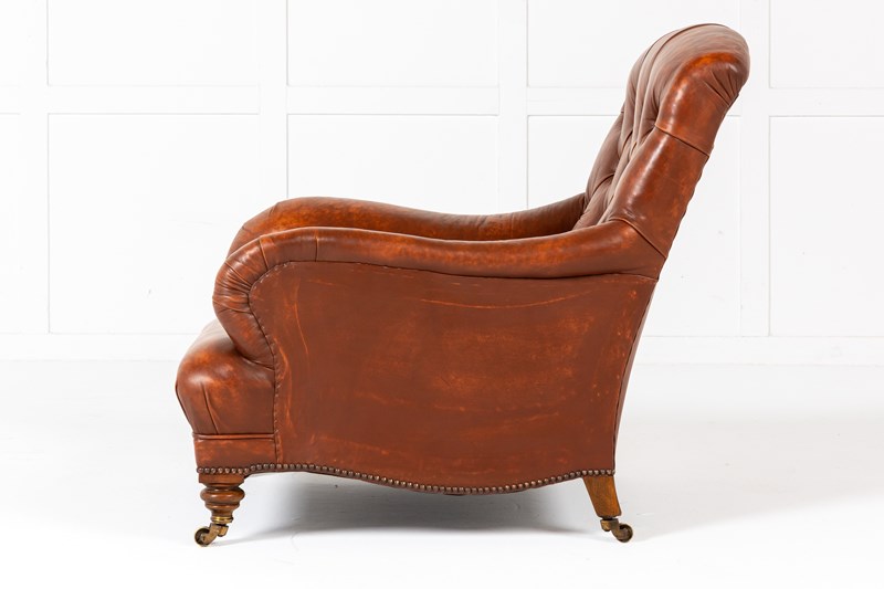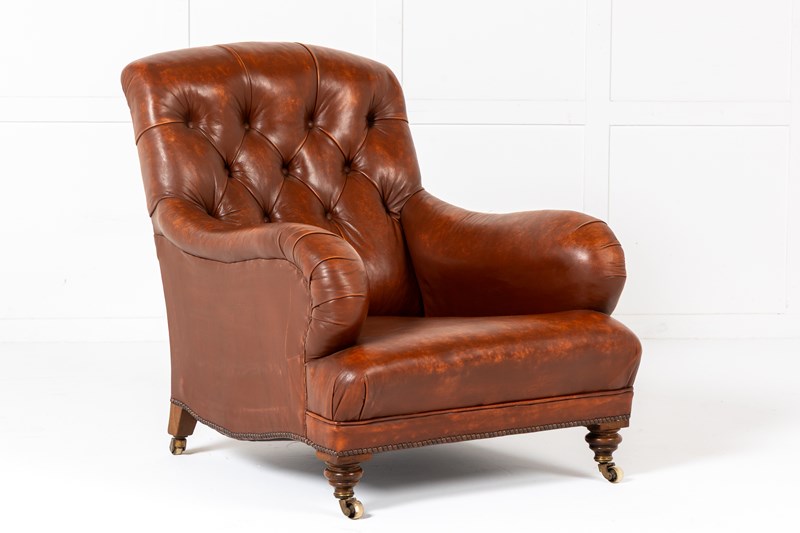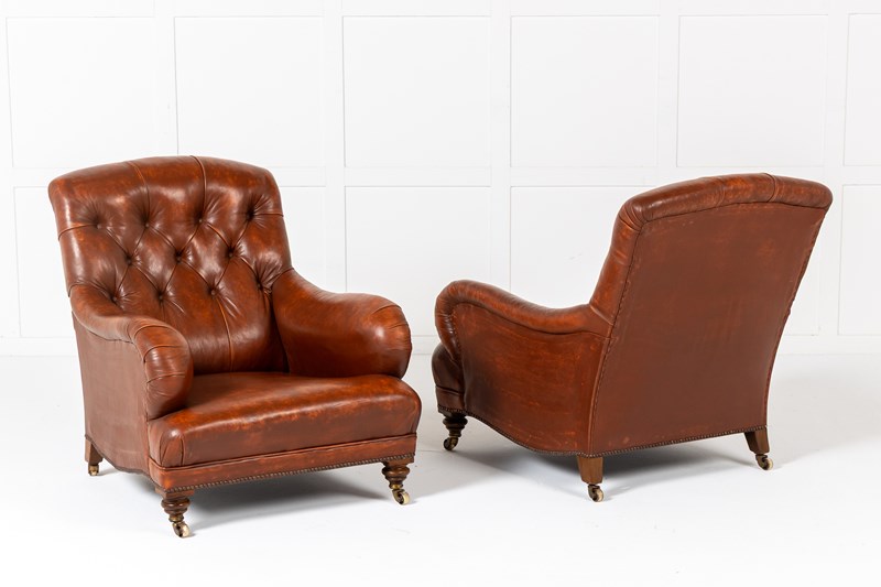 These stylish armchairs are upholstered in mid brown patinated leather. The turned front feet of fine quality walnut have integral castors. Although unsigned, the chairs are very much in the manner of those produced by Howard and Sons in London during this period.