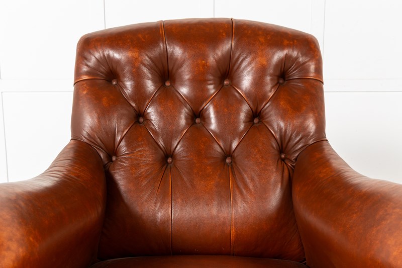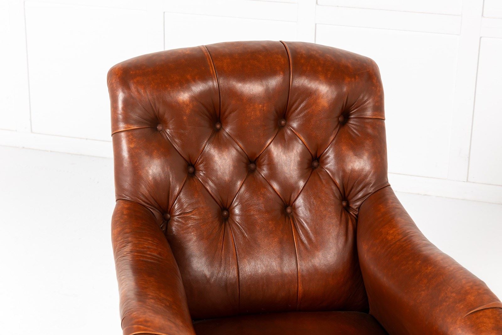 A Stylish Pair of 19th Century English Howard Style Walnut Armchairs in Brown Leather.