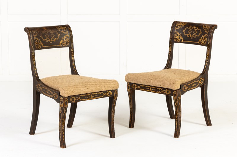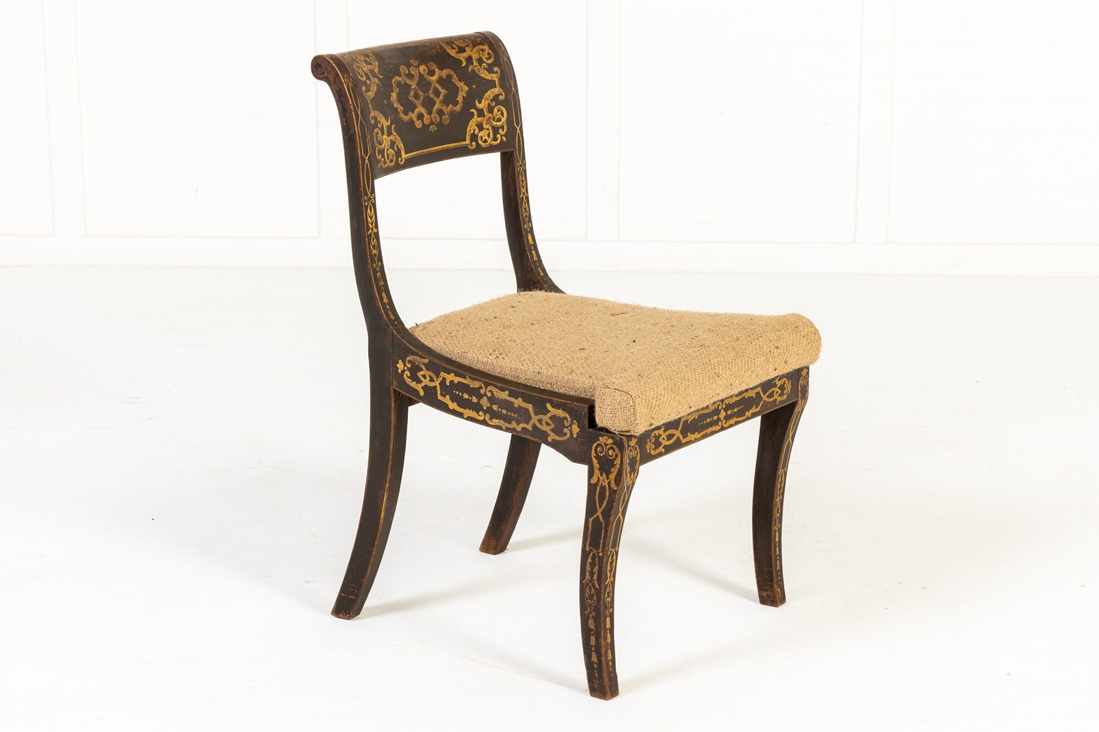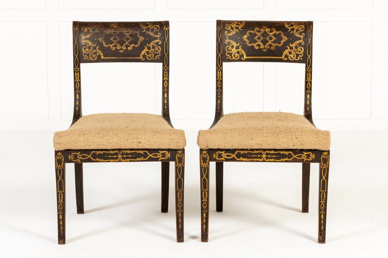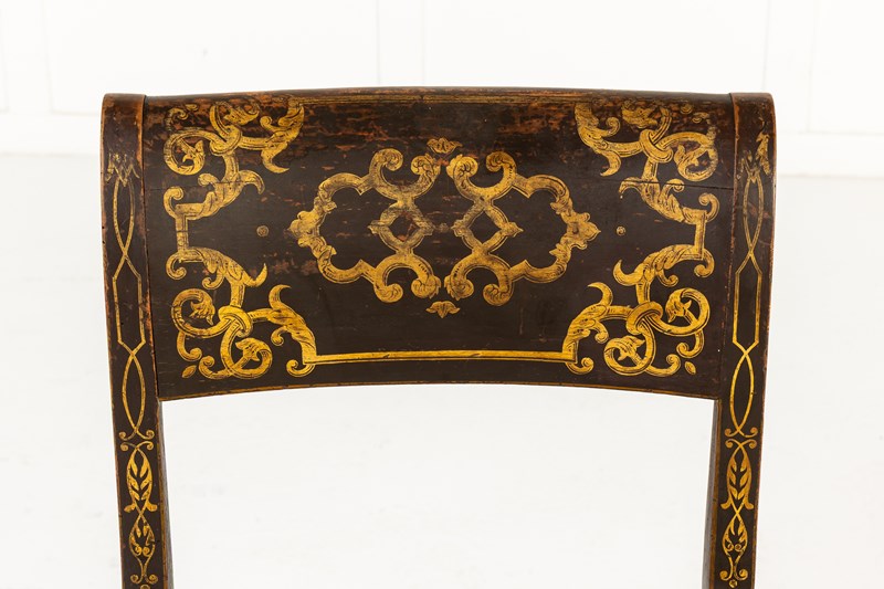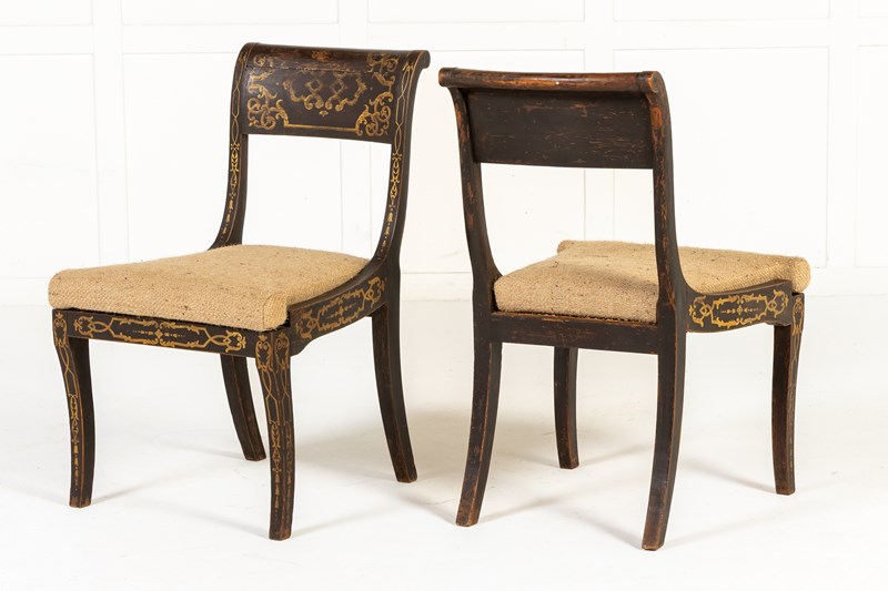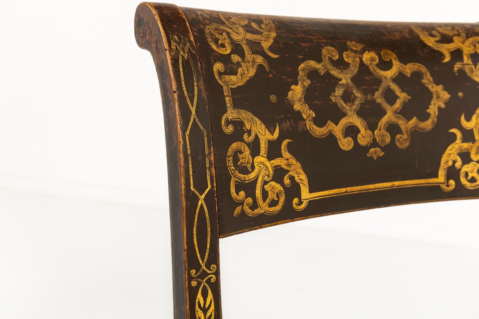 These interesting chairs have a simulated rosewood painted finish, topped with lovely gilt painted designs. The backs decorated with cartouches and the uprights having designs which include stylised anthemions and harebells. The legs and three sides of the apron are also decorated with gilt designs. The uprights flow in to a raised section surrounding seats. The legs are of sabre form, a design classic from this period.