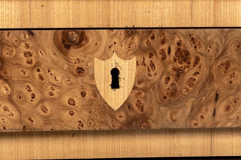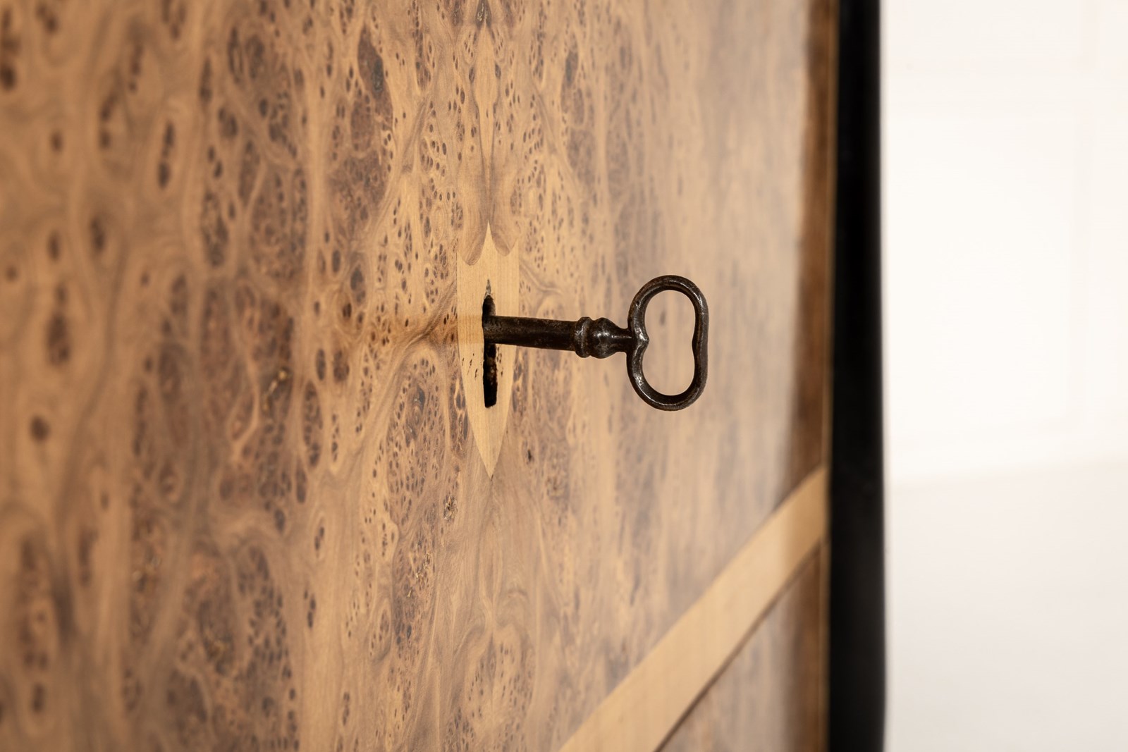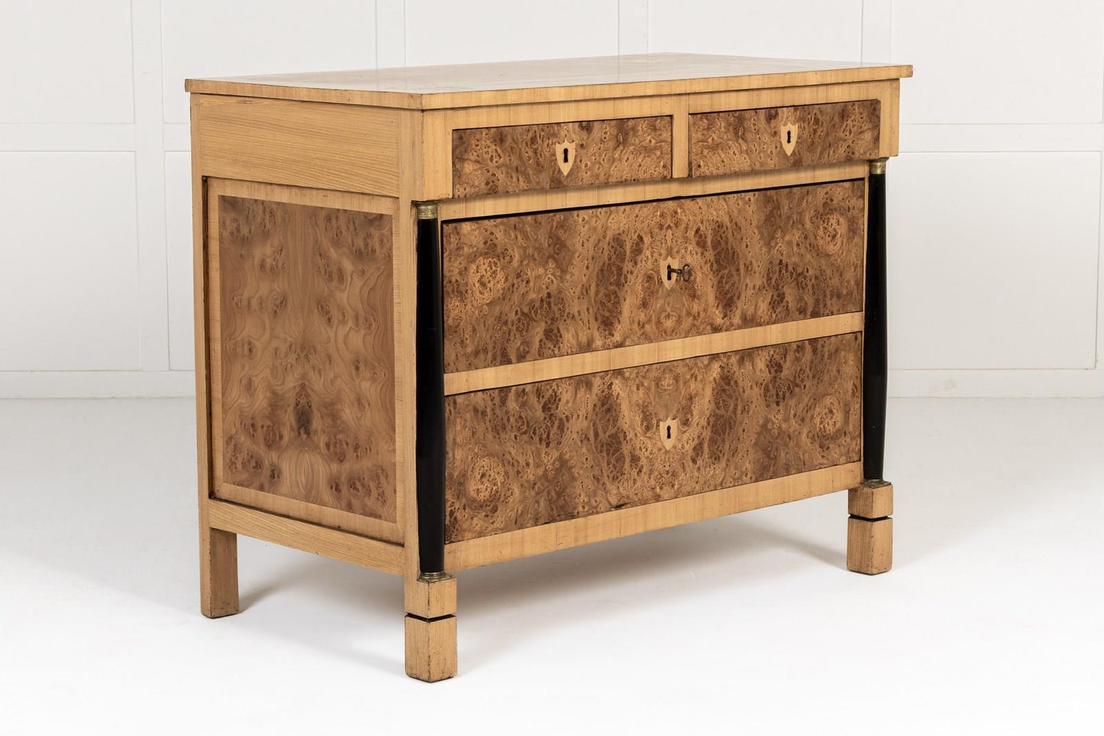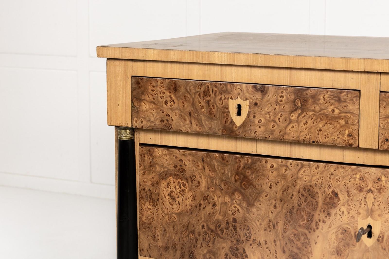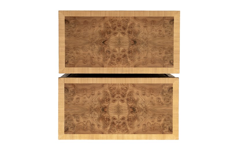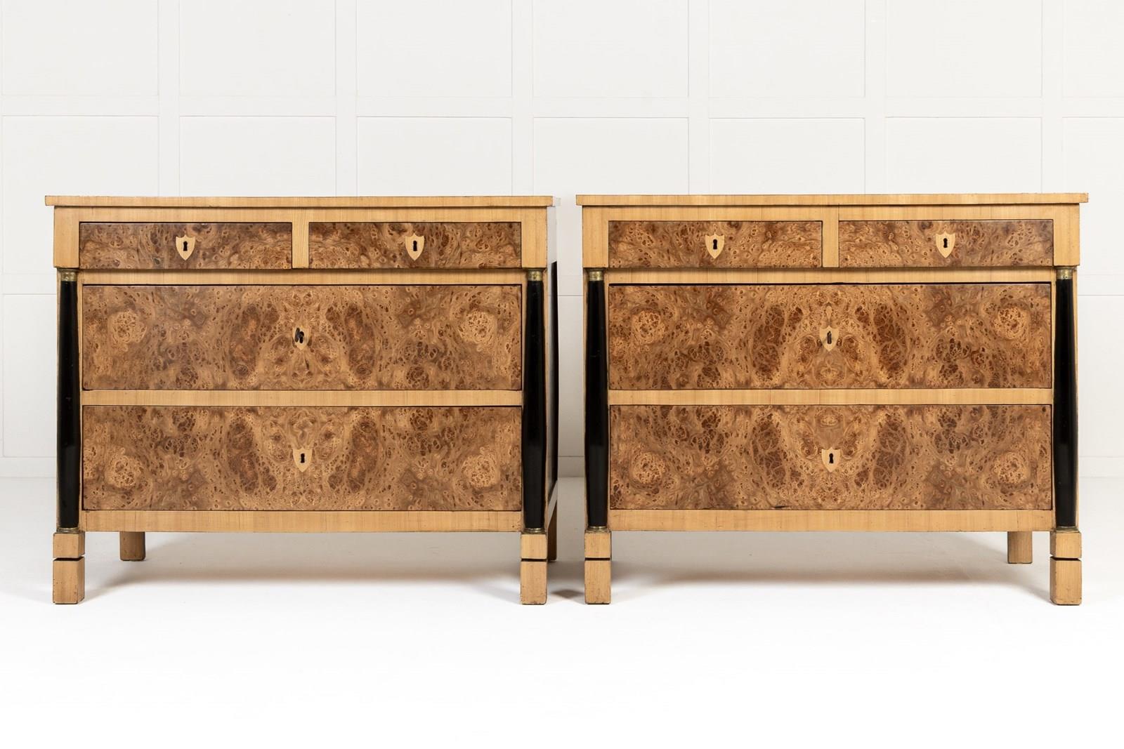 These beautiful commodes have a very contemporary look due to the use of relatively pale woods for most of their veneered construction. The contrast between pale elm and panels of burr elm of exceptional figure give them a striking look. The tops of the commodes have beautiful bookmatched panels of burr elm, other panels of the same wood are set in to the sides of each commode and the drawer fronts. The architectural columns either side of the drawer fronts are ebonised with ormolu capitals and bases bringing another interesting contrast to the design.