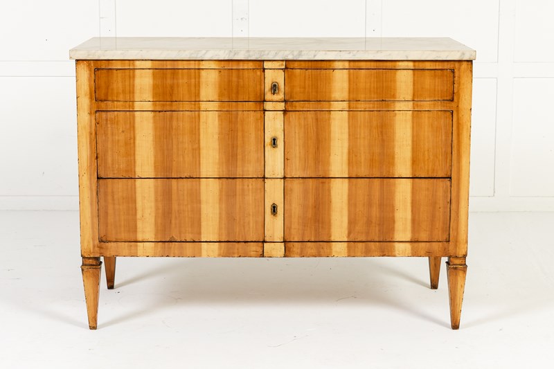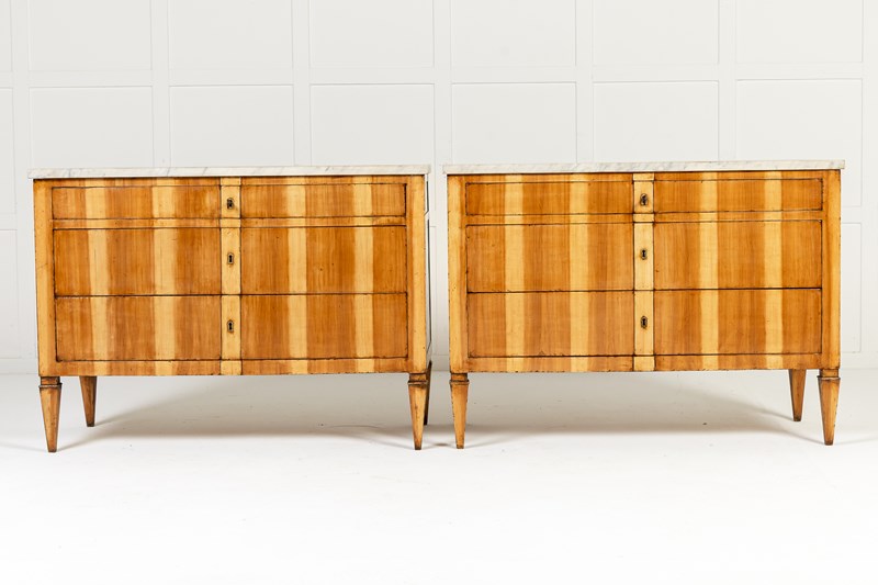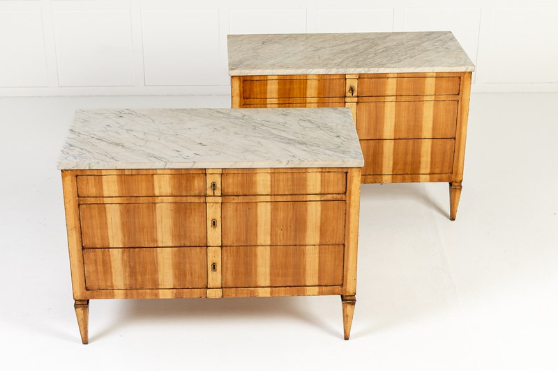 A Pair of Early 19th Century Italian Fruitwood Chest of Drawers with Marble Tops.