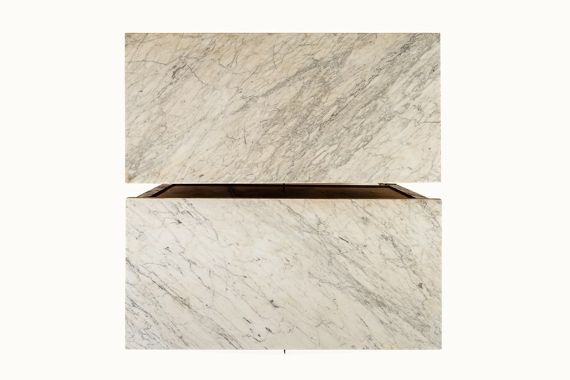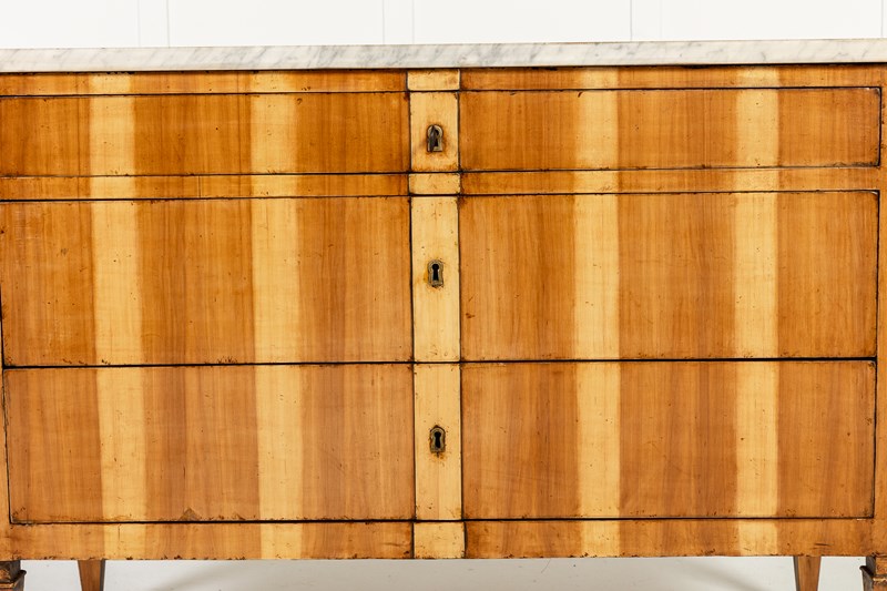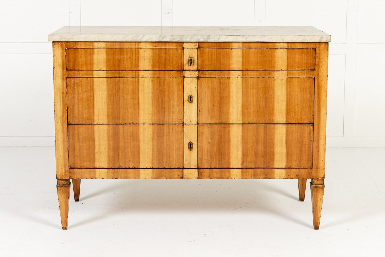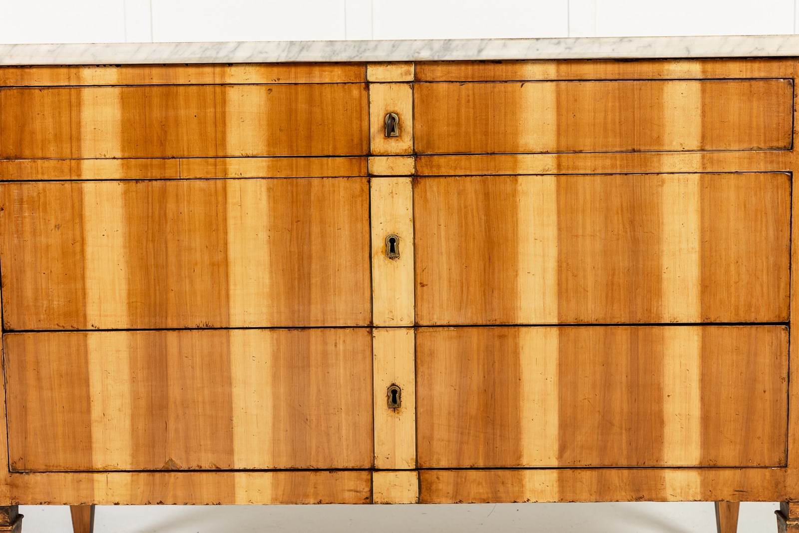 A striking pair of chests veneered to create a geometric repeating striped pattern on the front and both sides. These commodes have something of a contemporary feel to them despite being early 19th century in date. They have white and grey veined marble tops. Standing on tapering toupee feet. There are simple escutcheon plates in the drawers which allow the key to be used to open them. Each chest has one narrow drawer and two wider ones below. The sides are panelled.