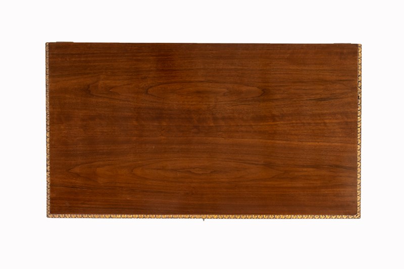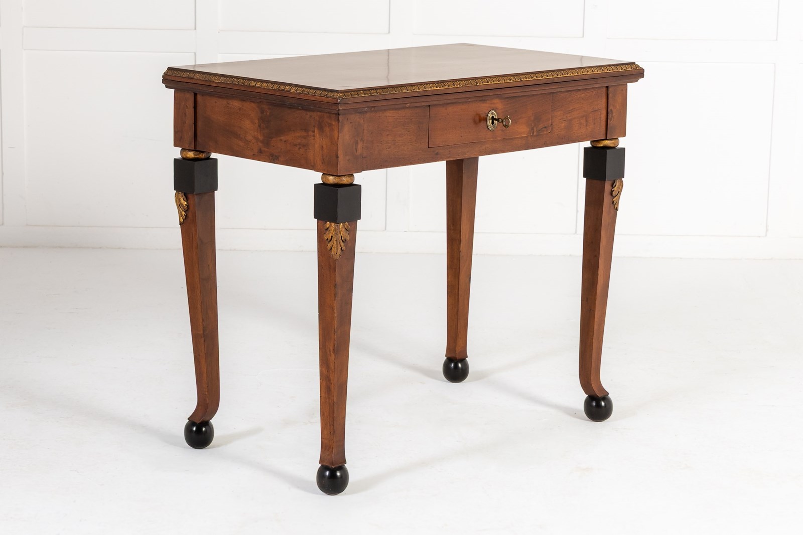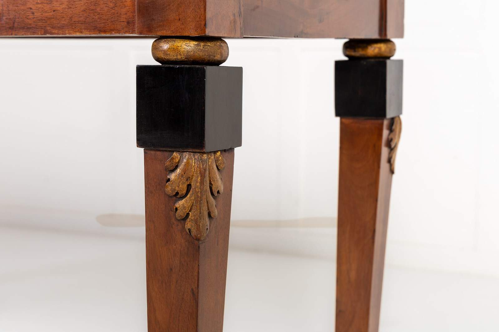 These lovely tables are of simple rectangular form but with details that mark them out as very interesting. There are small drawers to the centre of the friezes with a key. The edges of the tops have a gilded leaf moulding. The legs join the body of the table via giltwood terminals, themselves sat upon ebonised blocks with gilded leaf carved detailing applied beneath. The legs have a very subtle cabriole profile and terminate in incurved ends, perched upon contrasting ebonised ball feet.