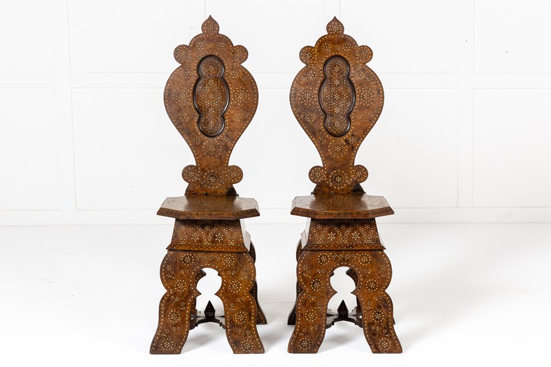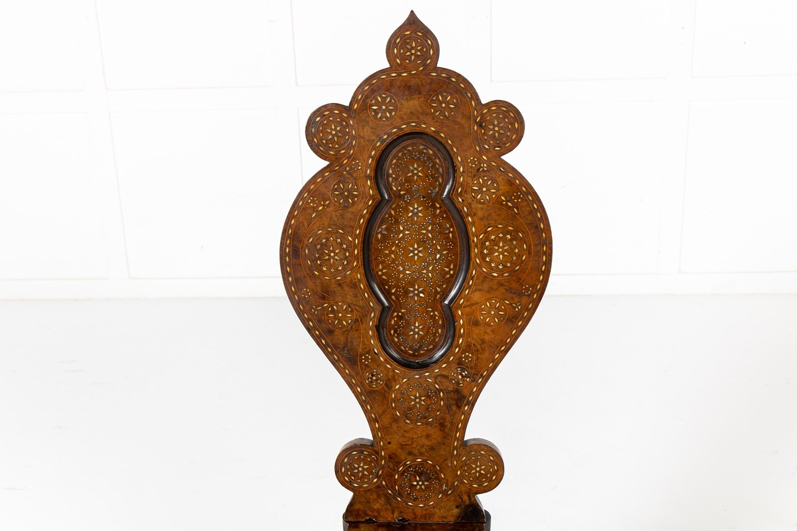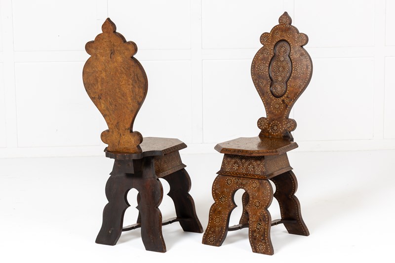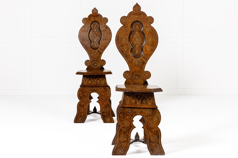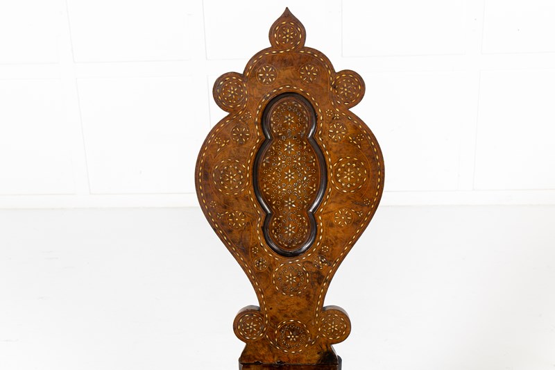 A Pair of 19th Century Italian Walnut and Bone Inlaid Hall Chairs.