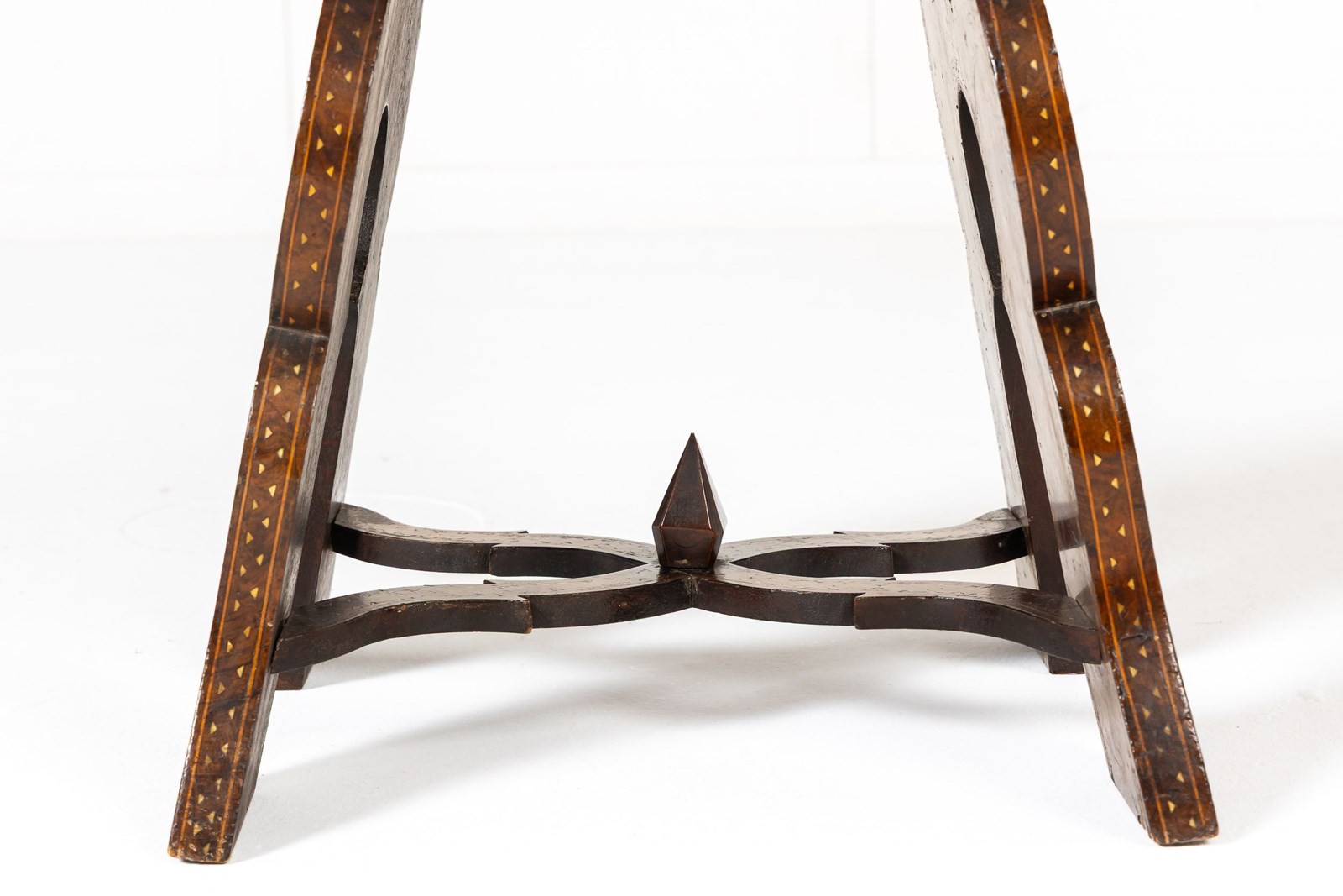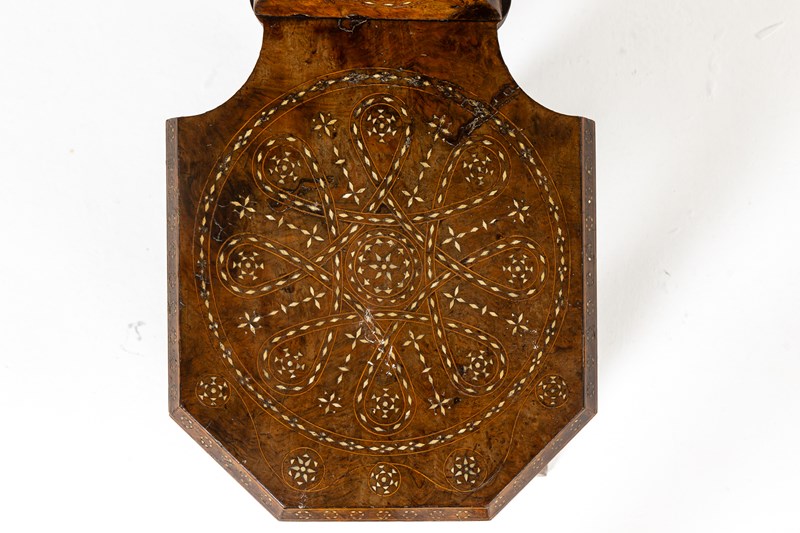 These interesting hall chairs were made in Italy. The crested backs have panelled centres. The seats are unusual in shape. Inlaid throughout with bone in geometric patterns that are framed with contrasting stringing.
