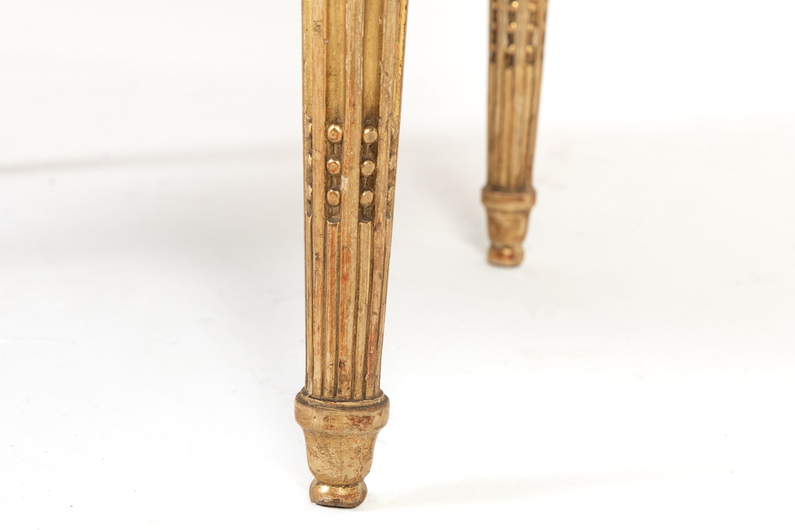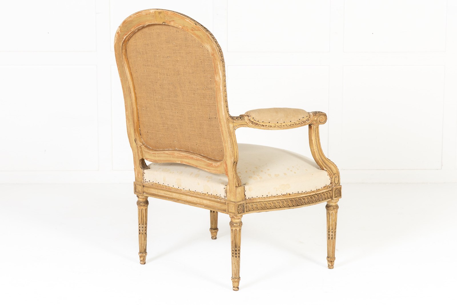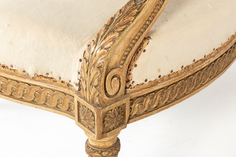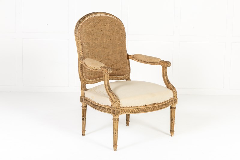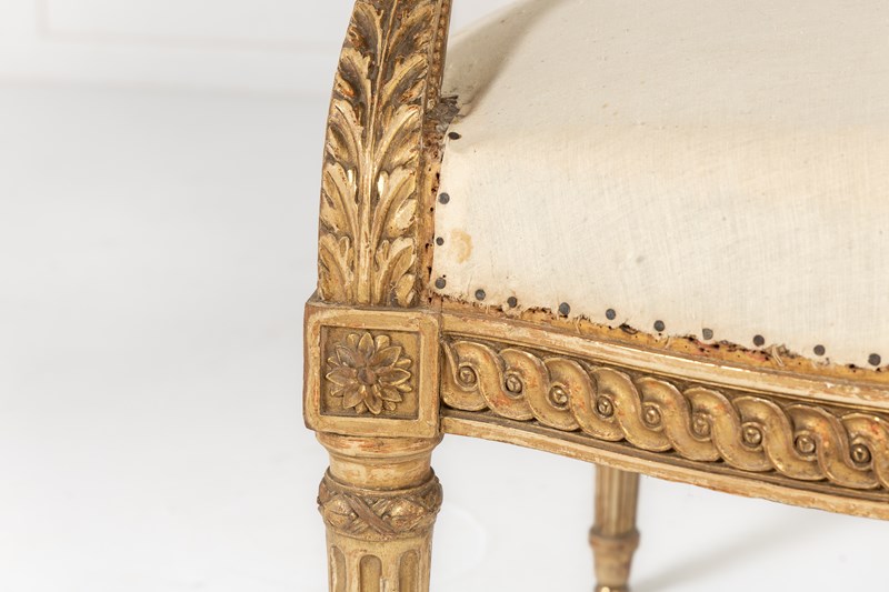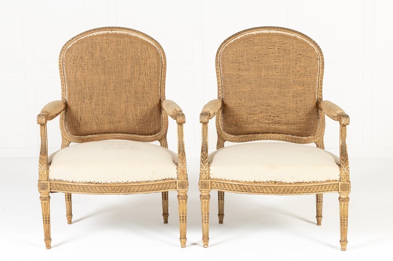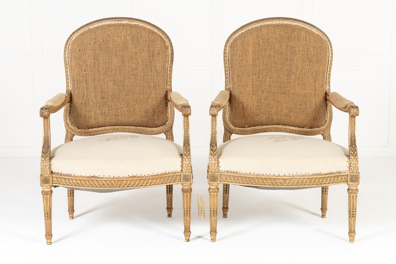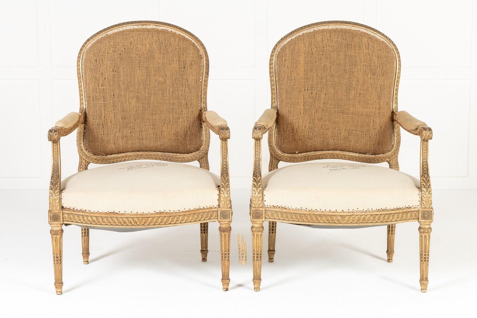 These armchairs are gilded throughout and stand on turned and carved legs with toupie feet. The show frame on the back and the front seat rails are both carved with a repeating guilloche design, the legs are fluted and have additional leaf carving where they join the front rail. There are also carved floral paterae on the blocks at this point.