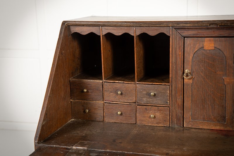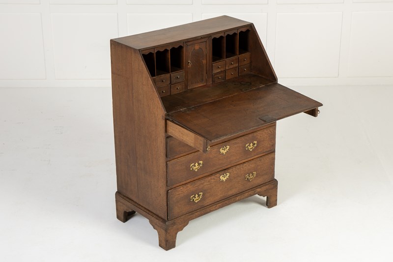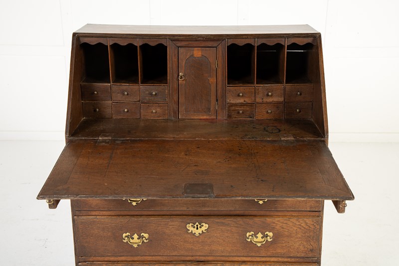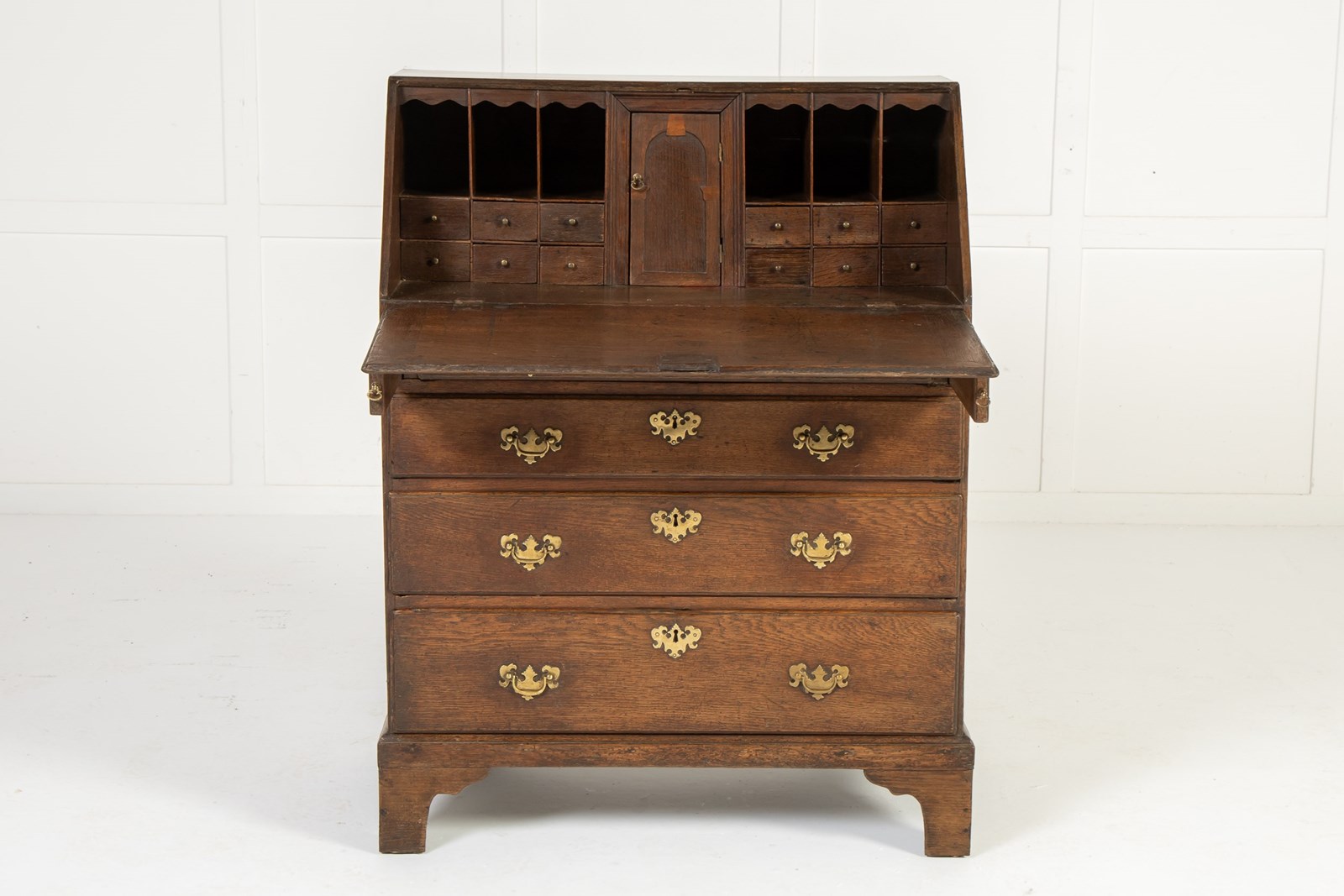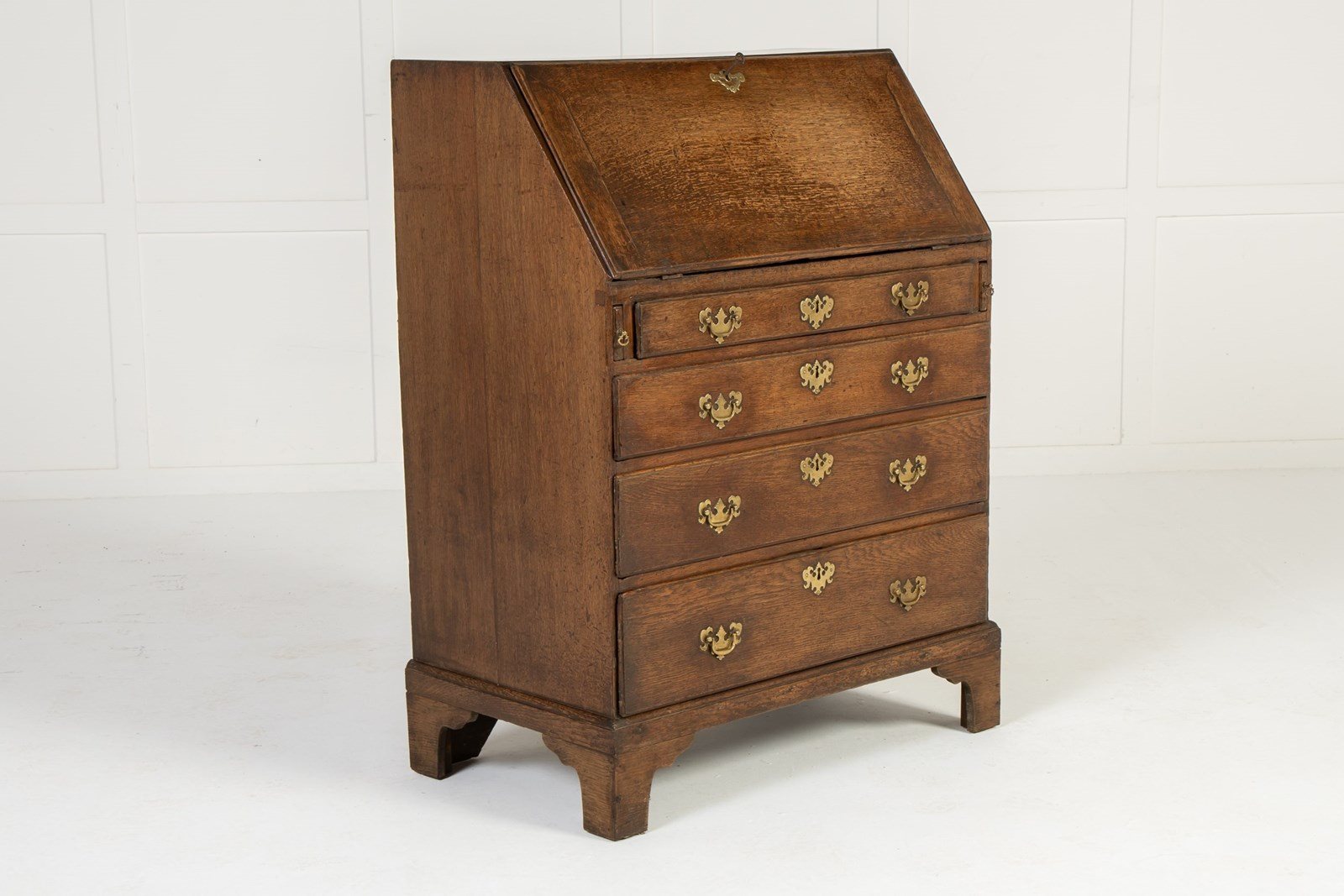 Having good proportions, this bureau has a lovely colour and patination. The original metalware consists of axe head handles on the lopers, that pull out from the sides of a bureau, and fine plate escutcheons and handles on the drawers. The piece stands on tall shaped bracket feet. The interior is nicely fitted with a series of small drawers and pigeon holes with a central cupboard door, set in to a moulded frame.
