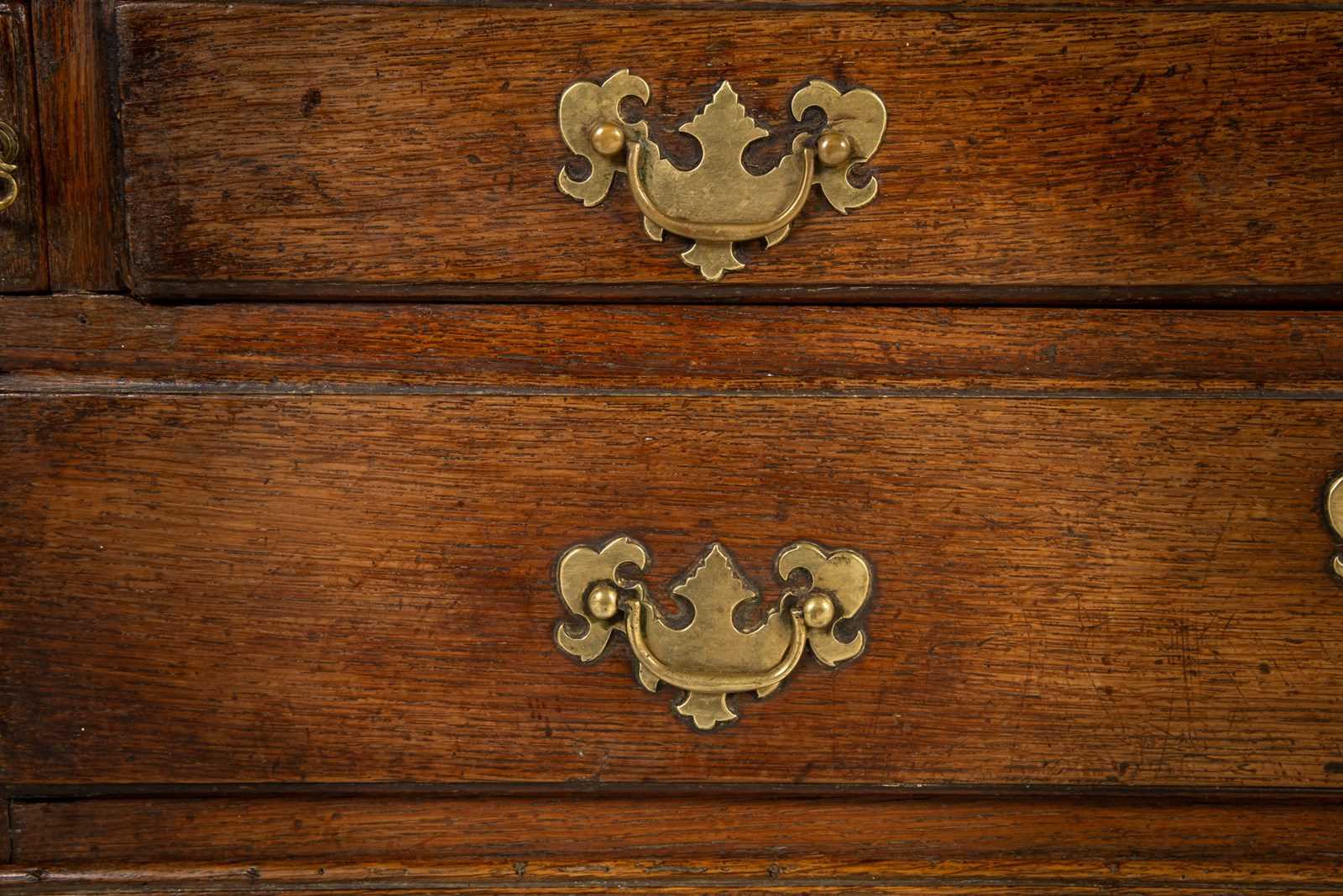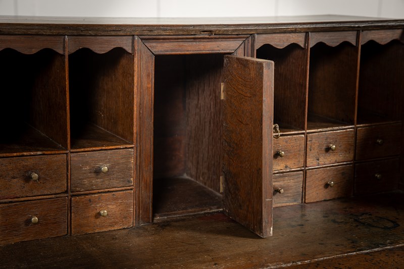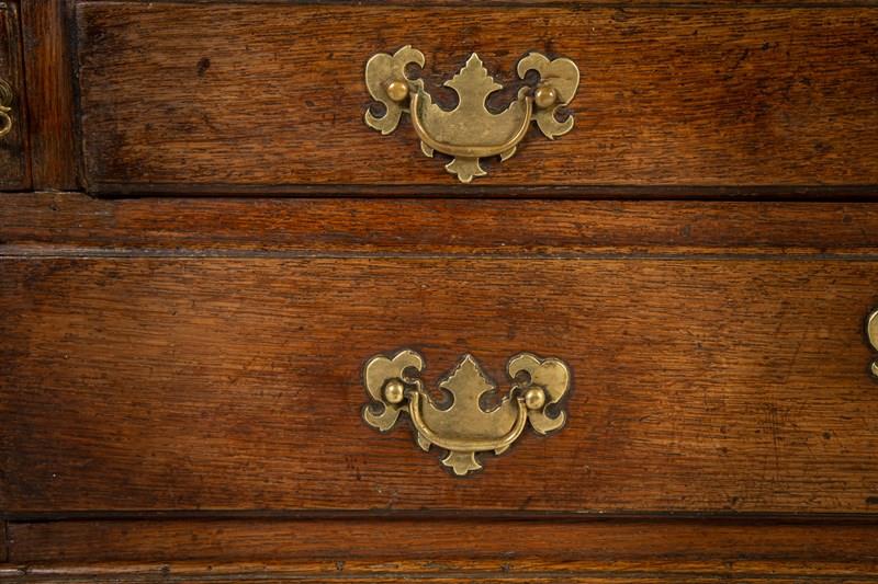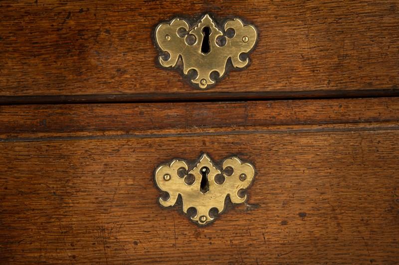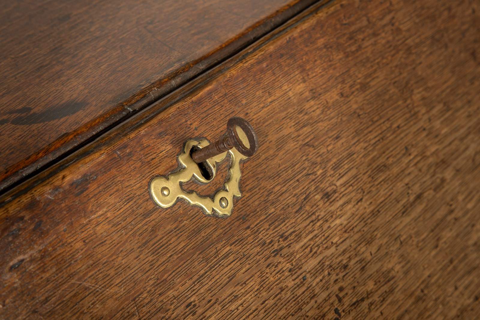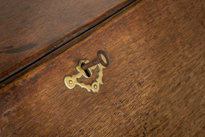 Having good proportions, this bureau has a lovely colour and patination. The original metalware consists of axe head handles on the lopers, that pull out from the sides of a bureau, and fine plate escutcheons and handles on the drawers. The piece stands on tall shaped bracket feet. The interior is nicely fitted with a series of small drawers and pigeon holes with a central cupboard door, set in to a moulded frame.