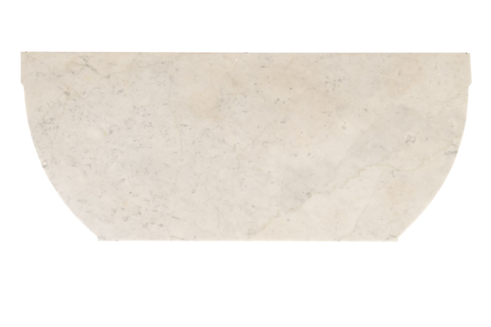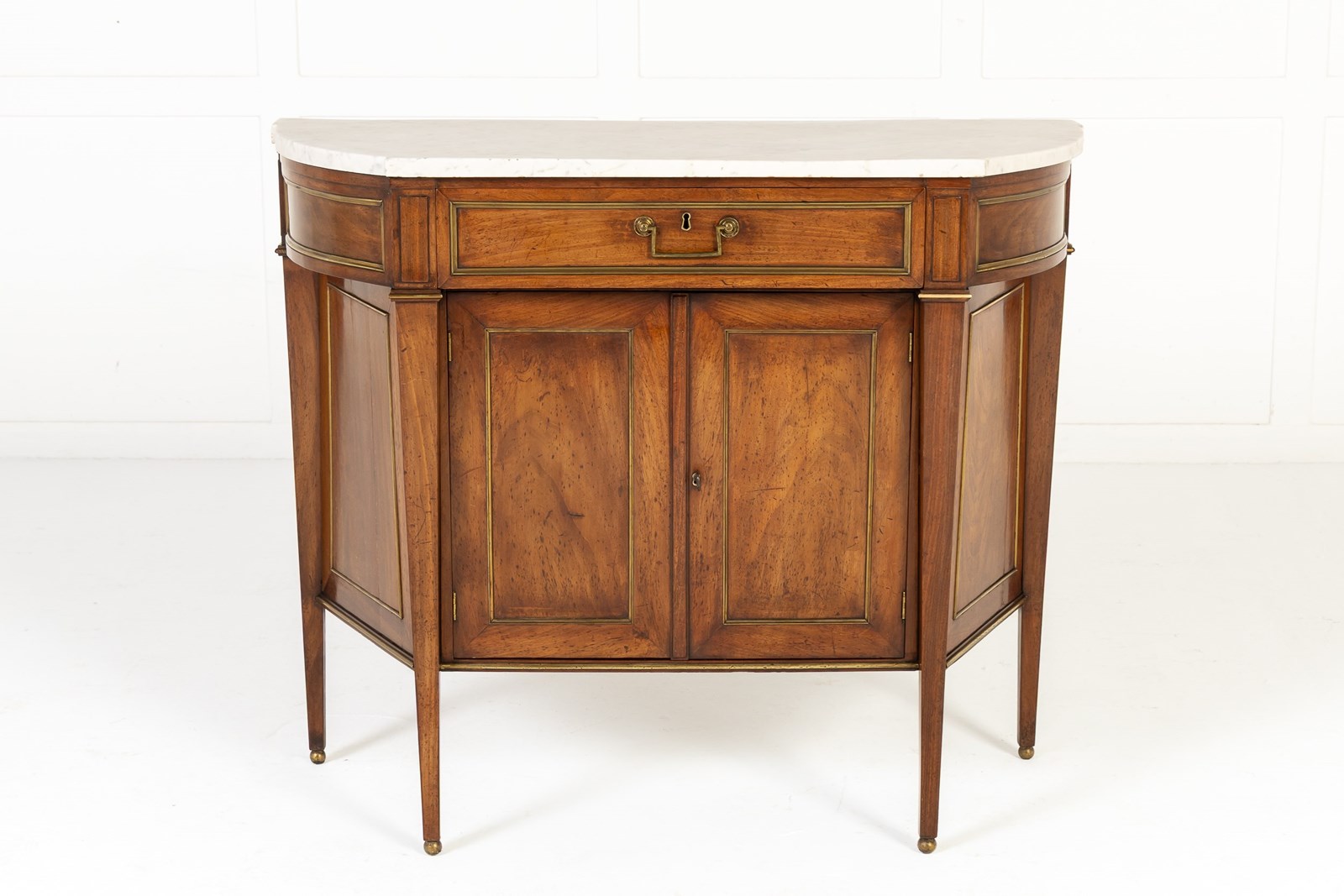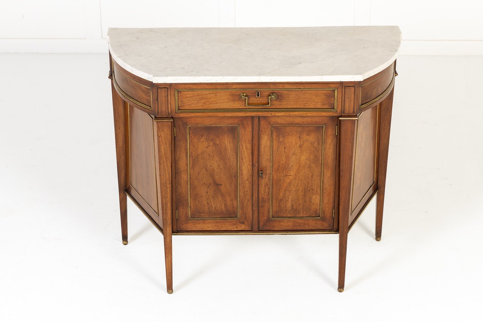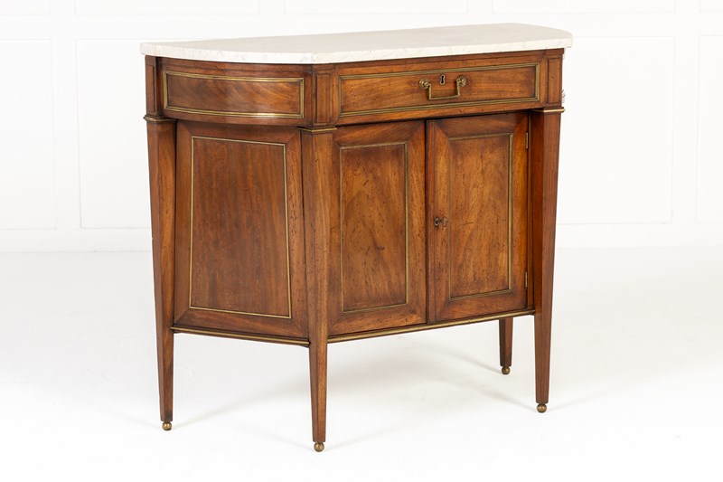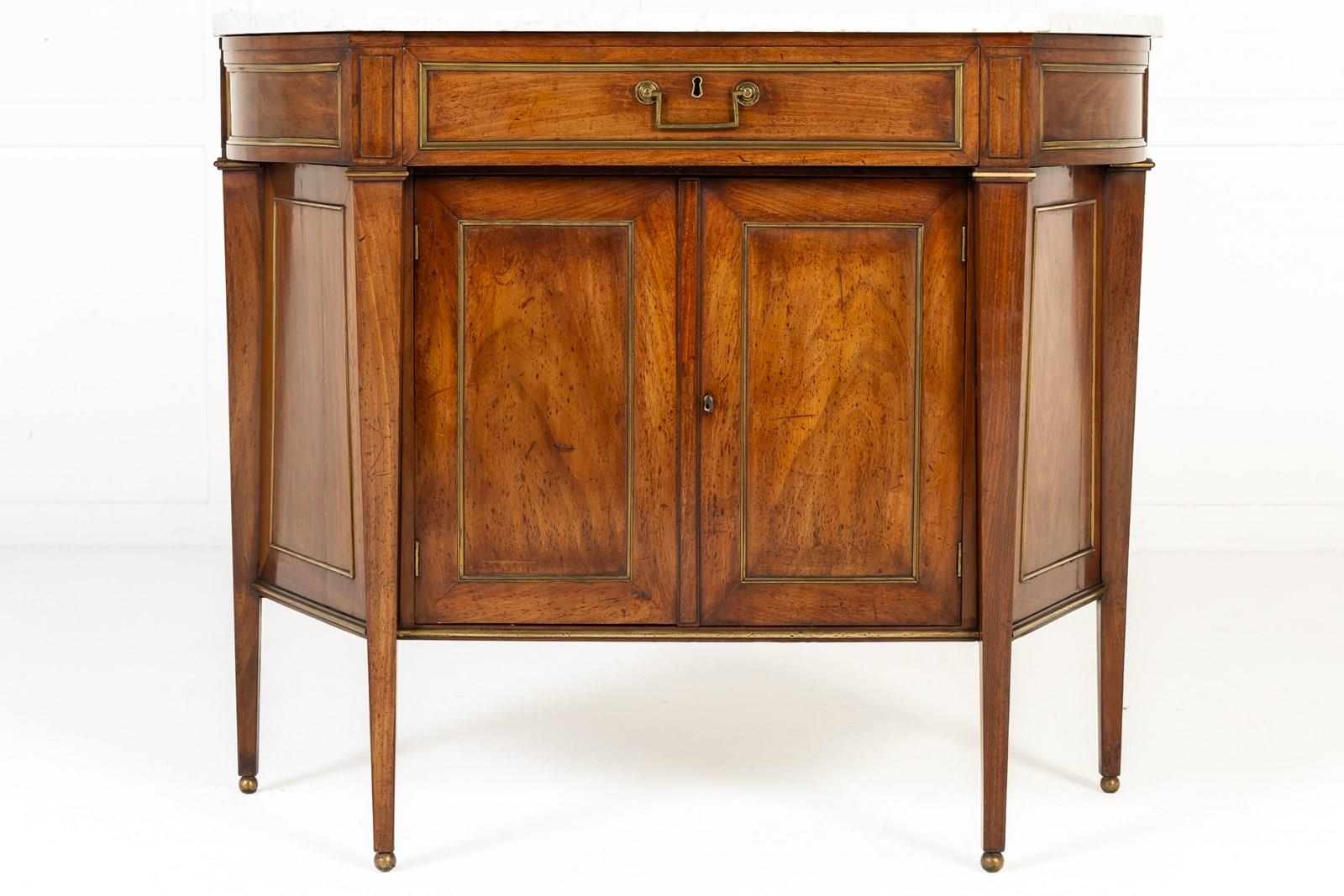 This small side cabinet or commode of Louis XVI period, consists of a central drawer in a protruding frieze above a recessed cupboard section below. The curving sides of the piece are joined to a straight front, an unusual design which is not often seen. Standing on four tapering square sectioned legs with ormolu toes. Inside the cupboard is a single adjustable shelf and it has a white veined marble top, shaped to follow the lines of the cabinet below. The drawer, the sides and the doors have ormolu edge mounts.