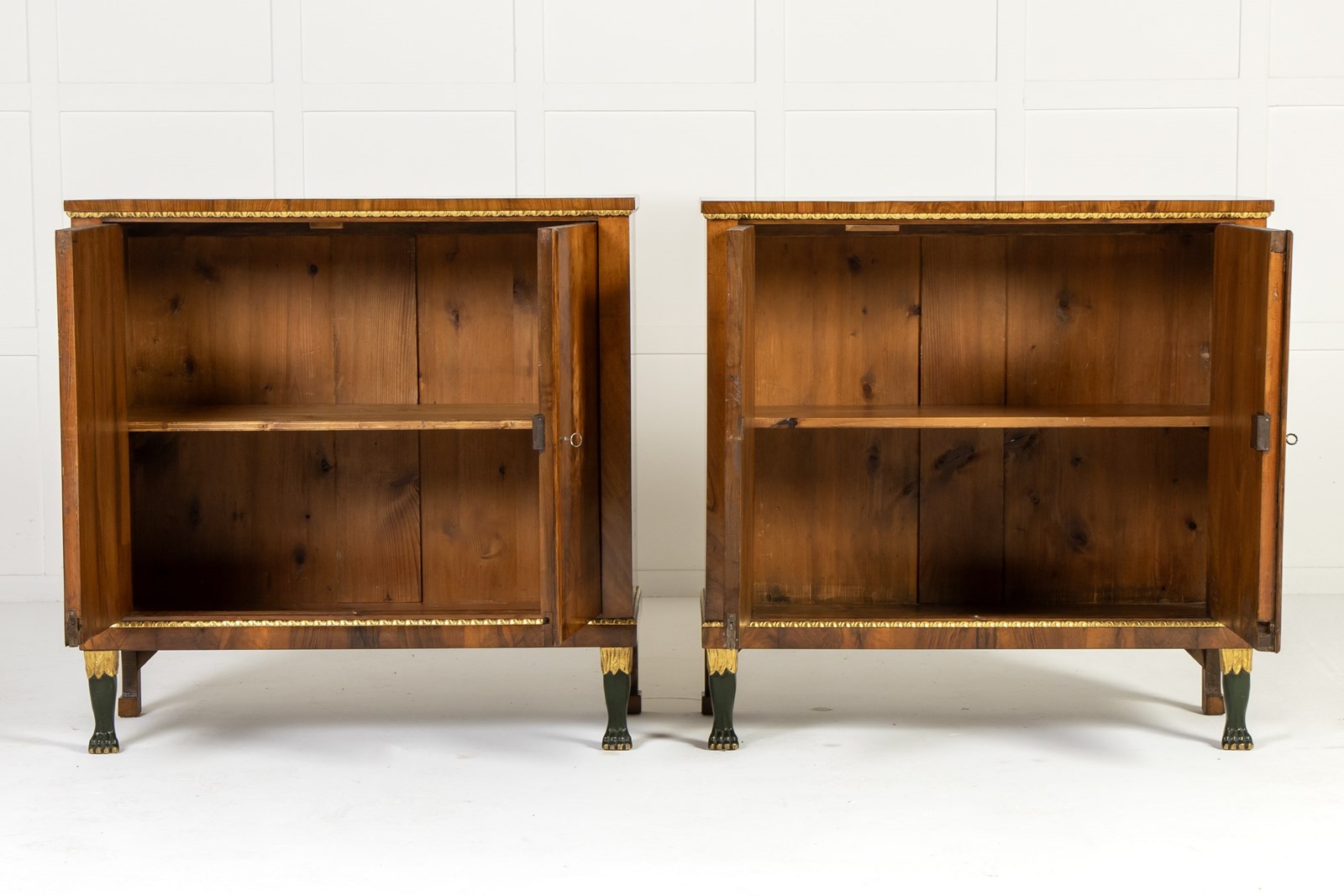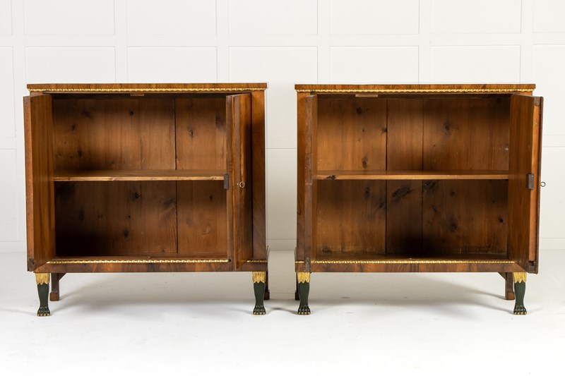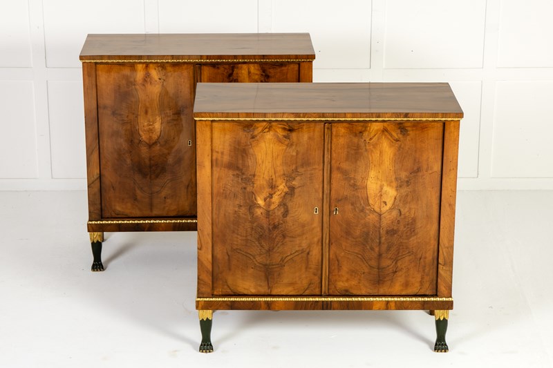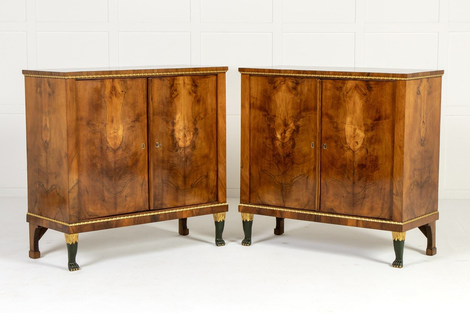 Each cabinet has excellent, bookmatched walnut veneers on the doors and sides. Inside, each cabinet there is a single shelf. The cabinets stand on ebonised legs with paw feet, and carved parcel gilding at the top. There are also giltwood mouldings running around the apron and frieze.