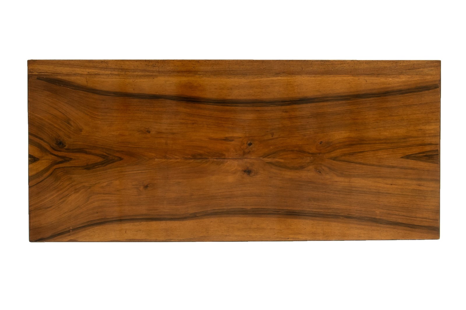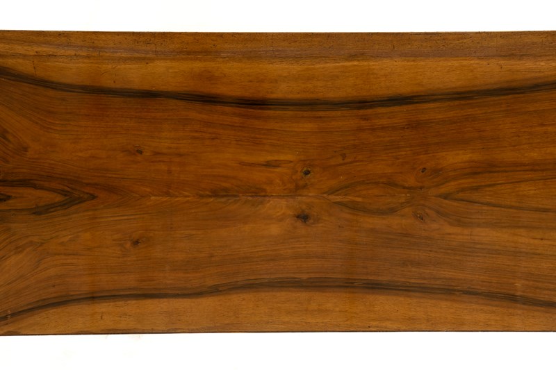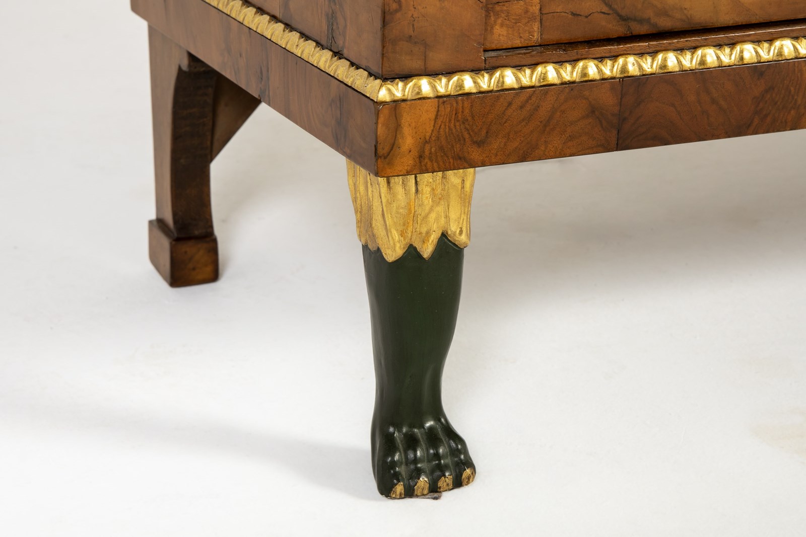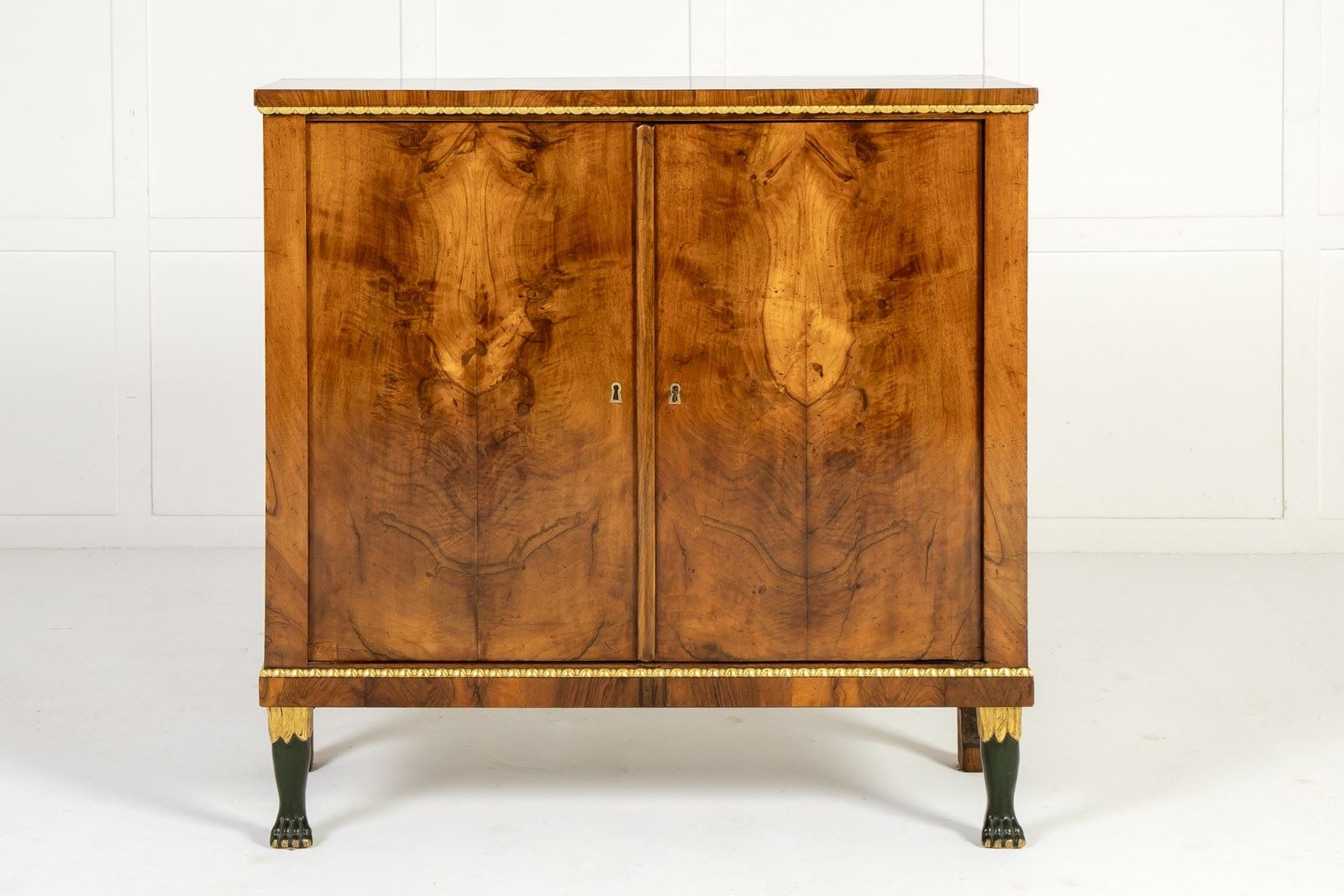 Each cabinet has excellent, bookmatched walnut veneers on the doors and sides. Inside, each cabinet there is a single shelf. The cabinets stand on ebonised legs with paw feet, and carved parcel gilding at the top. There are also giltwood mouldings running around the apron and frieze.
