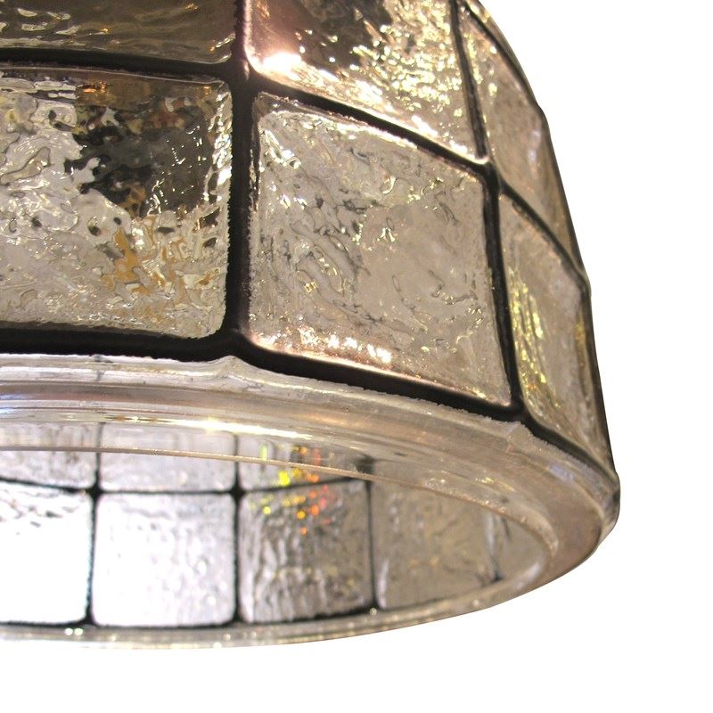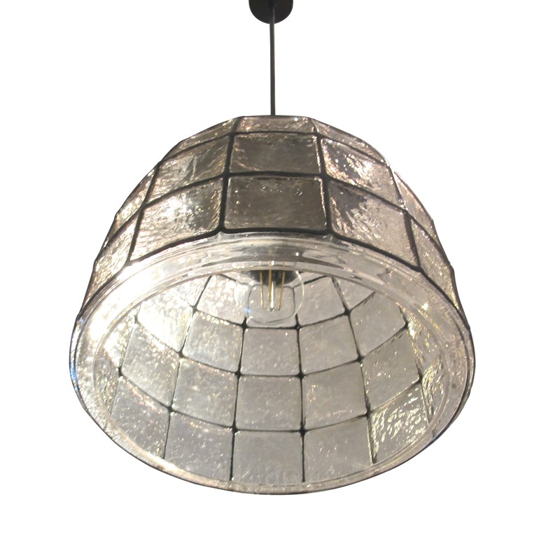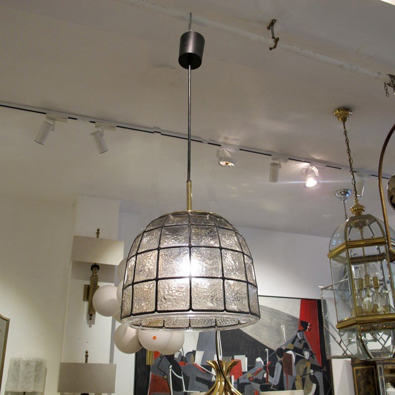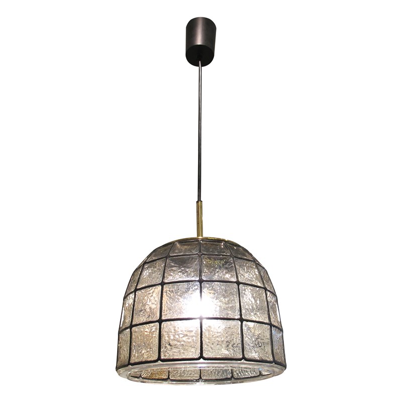 Vintage pendant light made by Glashütte Limburg in Germany during the 1960s. The dome-shaped shade is crafted from textured glass squares, each outlined with black paint to imitate metal framing. It hangs from a brass canopy with a matching brass detail at the top of the shade. A striking mid-century piece that adds warmth and character to any space.