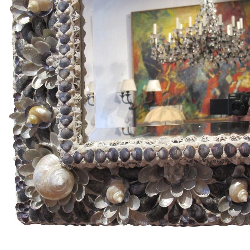 This striking late 19th-century French bevelled mirror features an original frame that has been artfully embellished with contemporary elements in recent years. The frame is decorated with an intricate array of seashells, creating a unique elegance and coastal-inspired artistry. The result is a richly textured, sculptural border composed of delicately arranged shells in varied shapes and tones, lending the piece both charm and visual depth. It is a statement piece, making it an impressive addition to any interior setting, traditional, eclectic, or seaside-inspired.