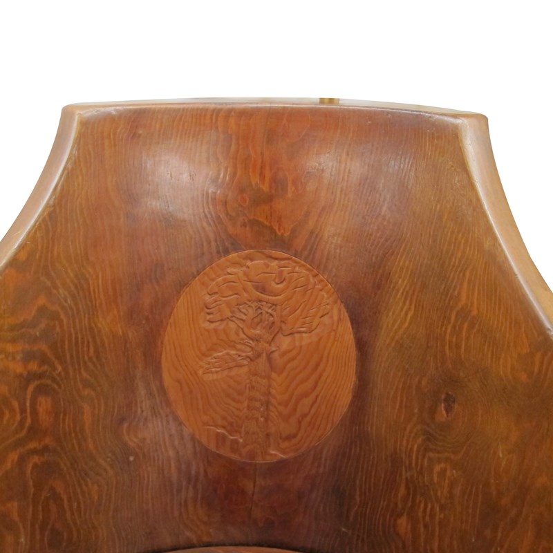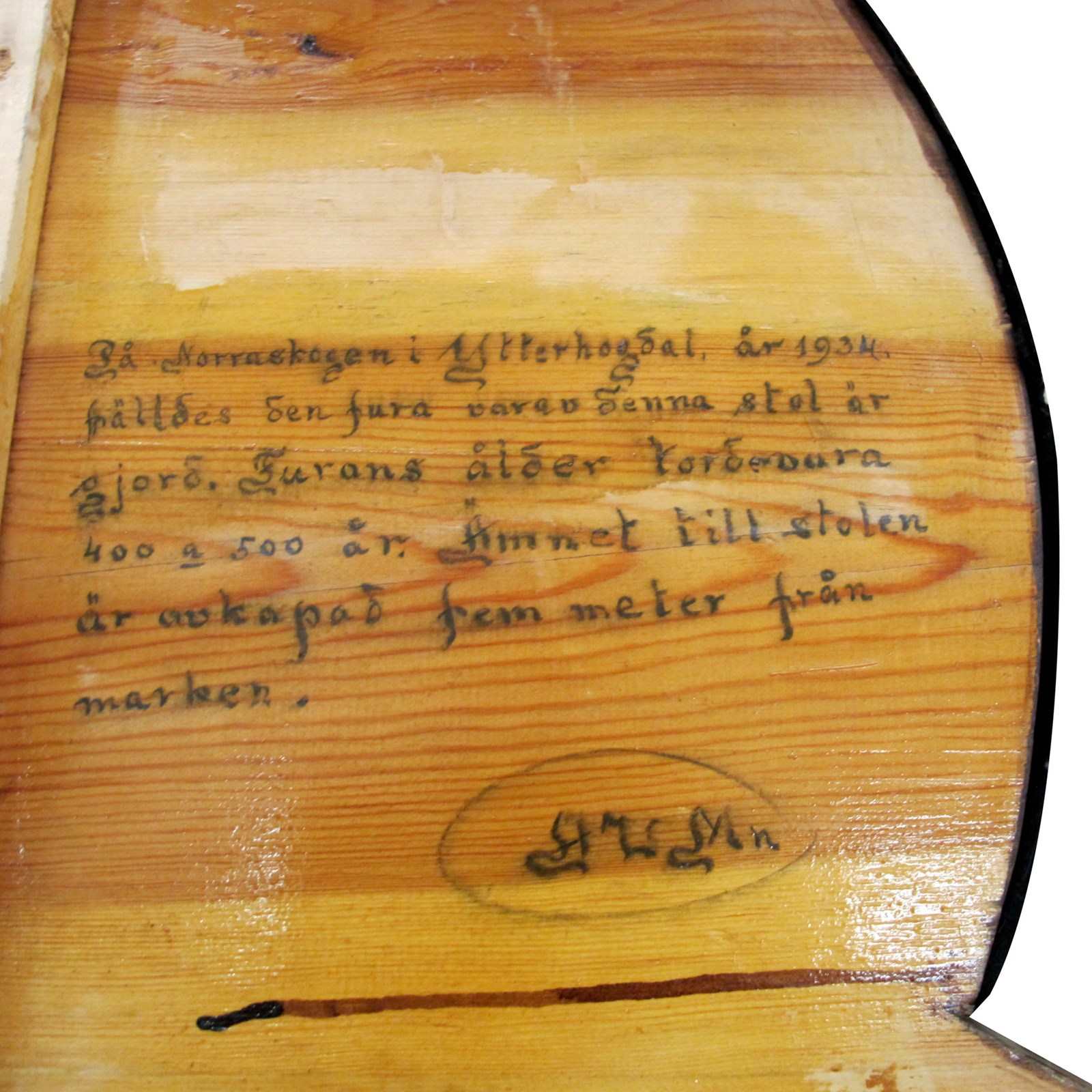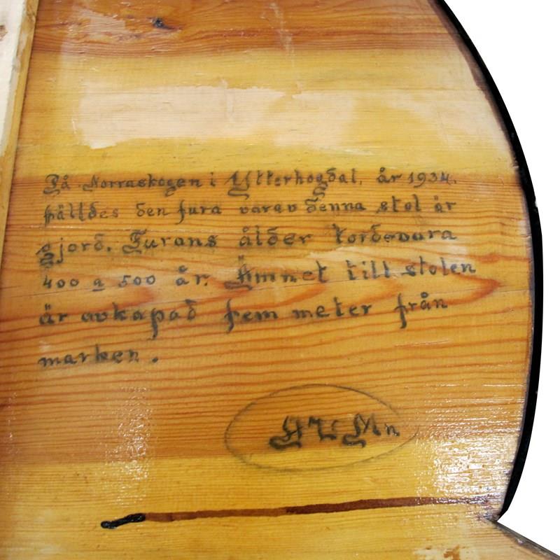 "In 1934, in Norraskogen, the pine tree from which this chair was crafted was felled. The tree was estimated to be 400 to 500 years old, and the timber for the chair was taken from five meters above the ground."