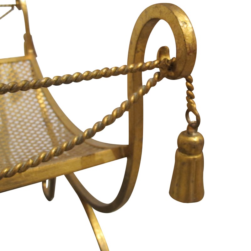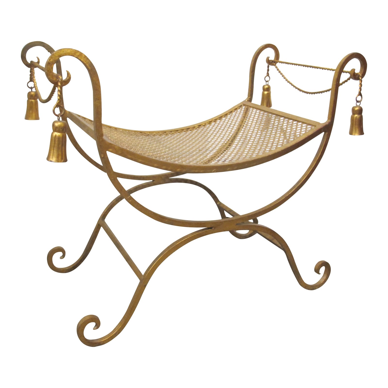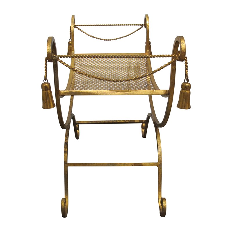 Mid-Century Italian stool featuring the classic Curule (X-frame) design, capturing the essence of Hollywood Regency glamour. The piece is crafted from gilded wrought iron and retains a desirable aged patina that enhances its vintage character. It features a contoured seat made of metal mesh. The upper frame is detailed with elegant scrollwork finials with hanging metal tassels.