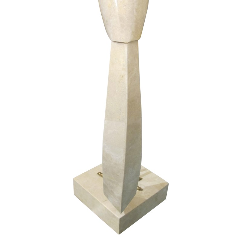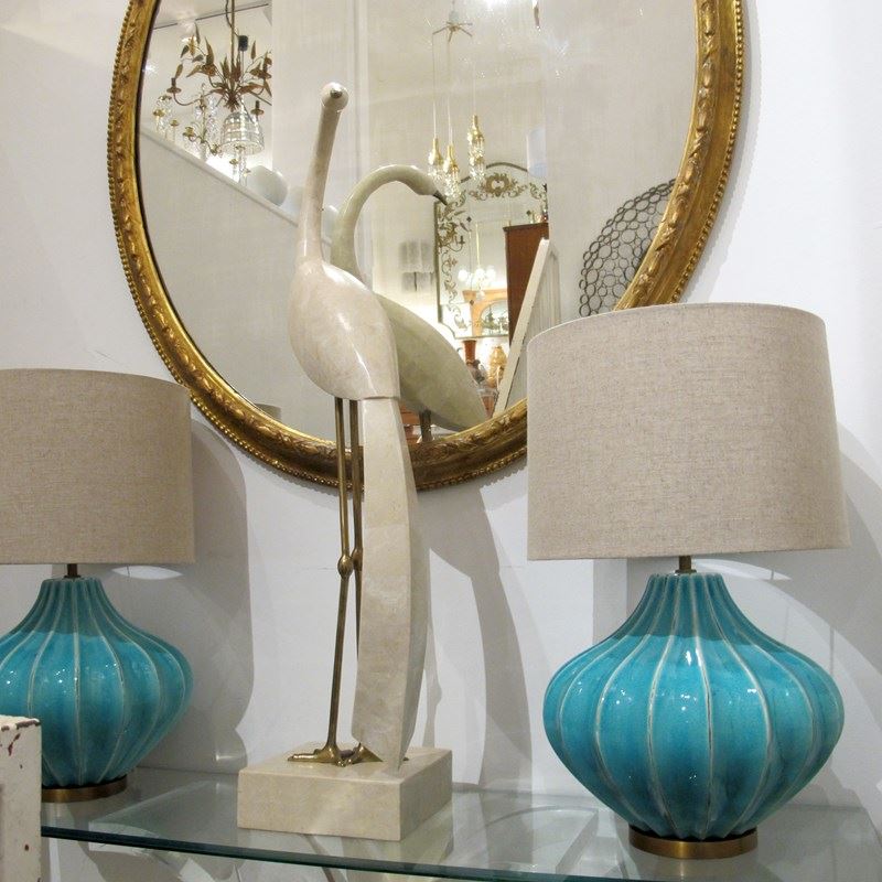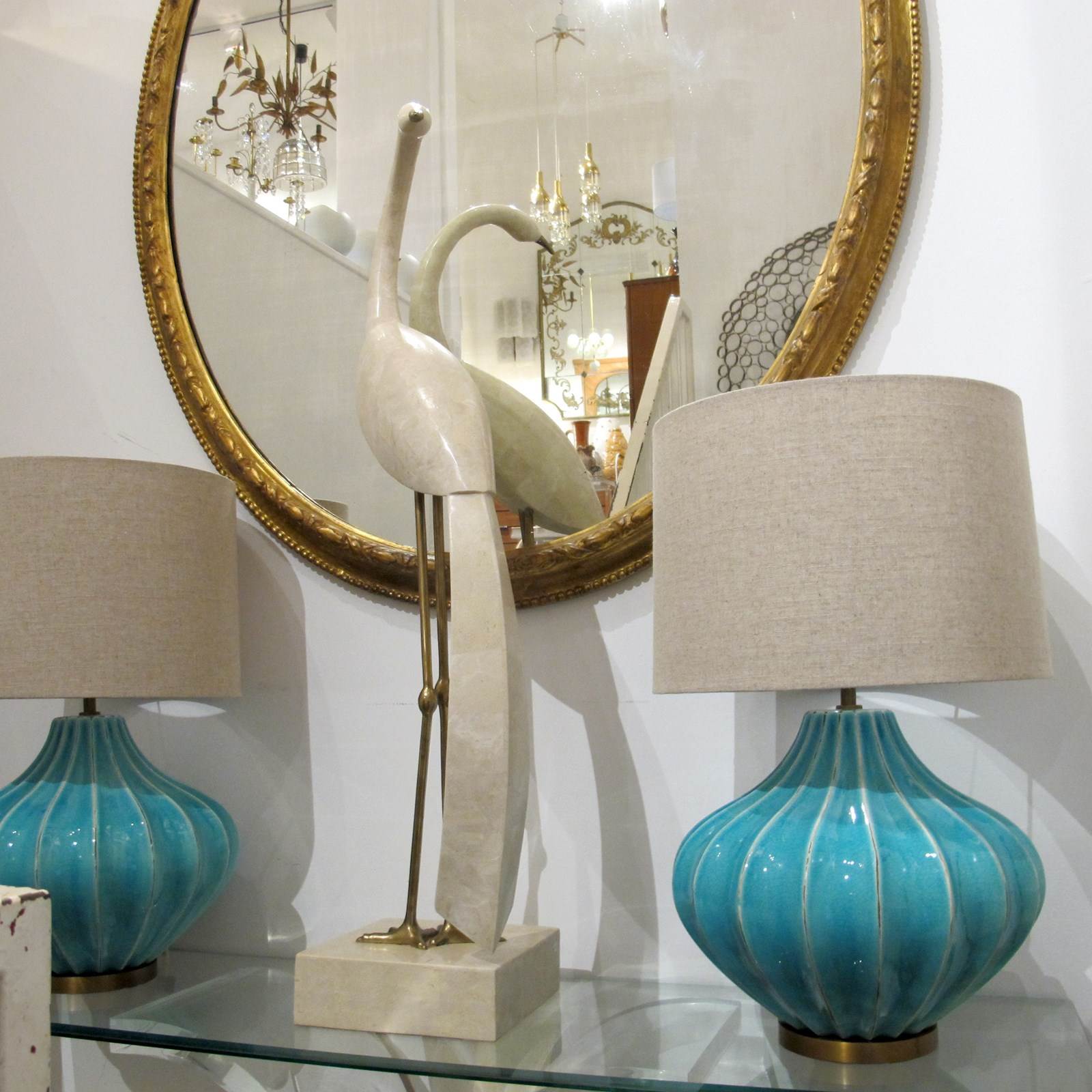 This elegant, tall bird sculpture by Maitland Smith and dating from the 1970s, showcases the brand’s signature craftsmanship in tessellated stone. The piece features a graceful, elongated bird form, possibly a crane or heron, crafted from creamy, tessellated travertine. The slender brass legs and beak provide a refined contrast to the warm stone body, while the sculptural lines evoke both movement and serenity.