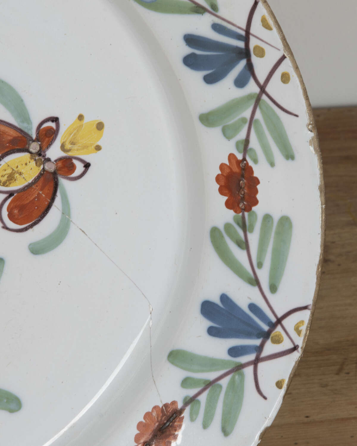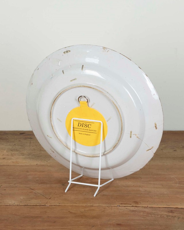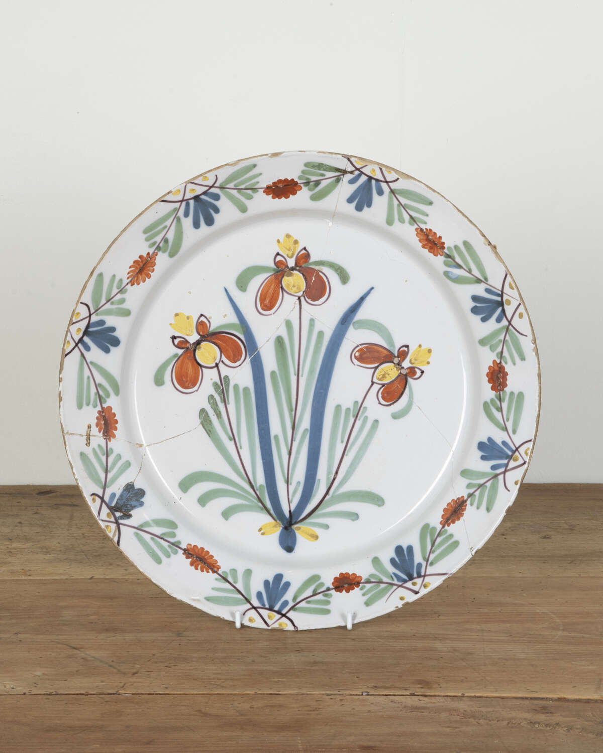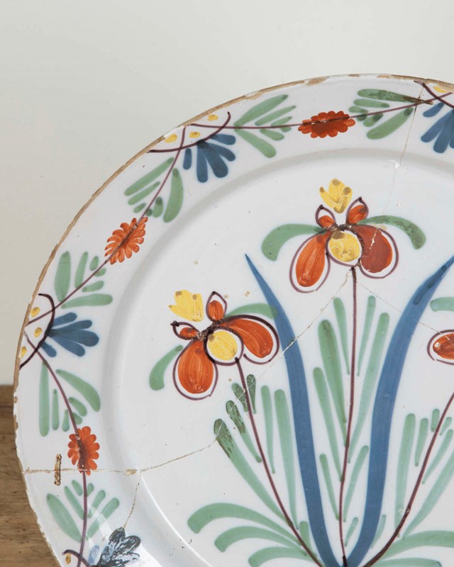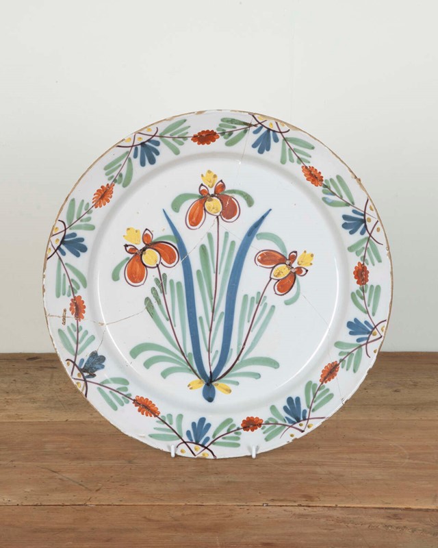 18th Century Lambeth Delft tin glazed earthenware charger c.1740. Delightful hand painted polychrome decoration. In as found condition with old staple repairs.